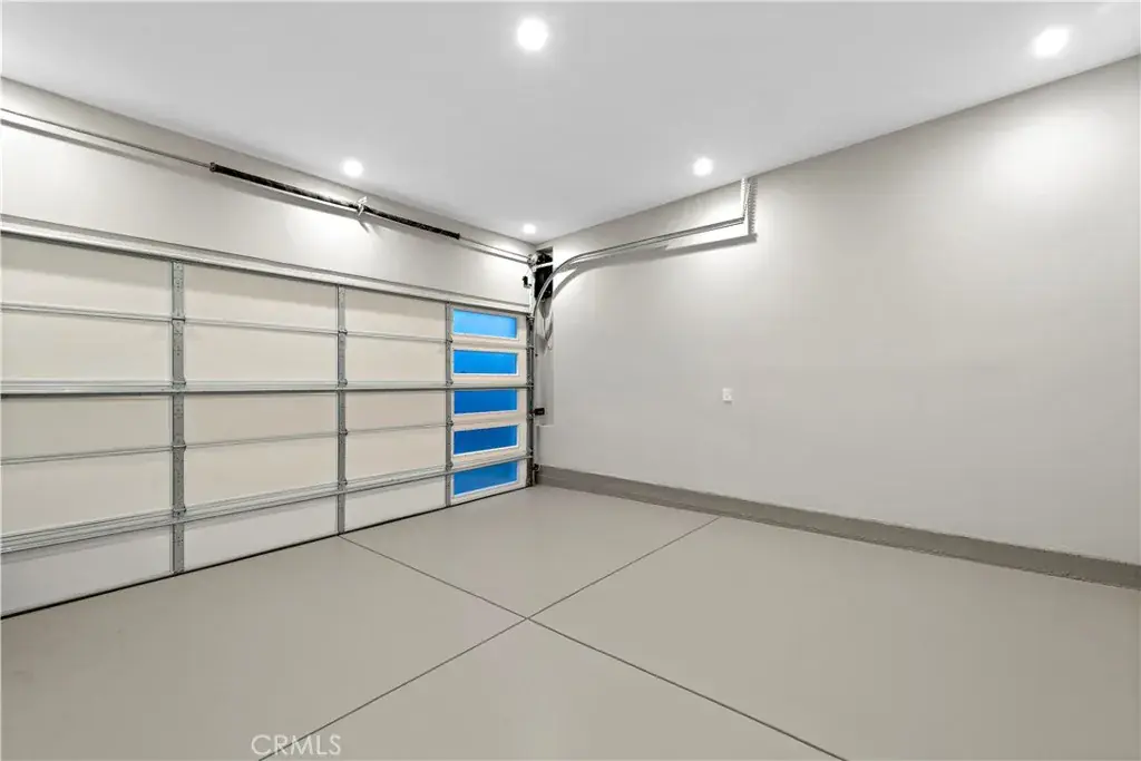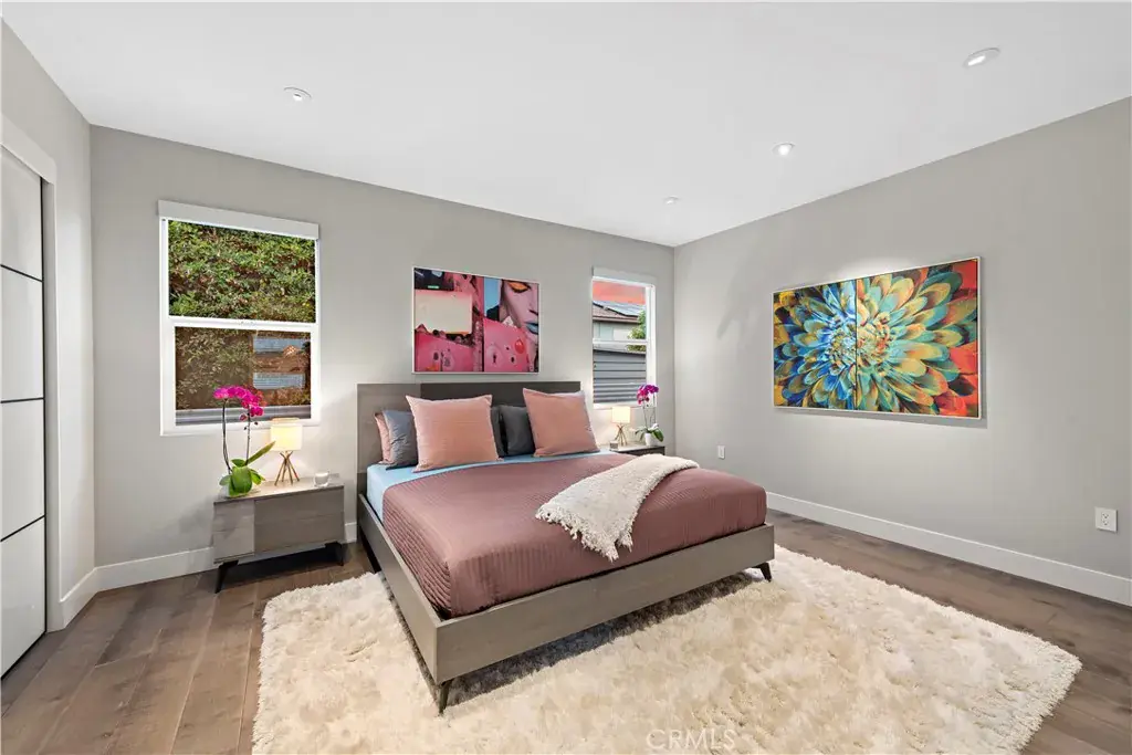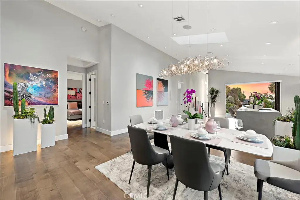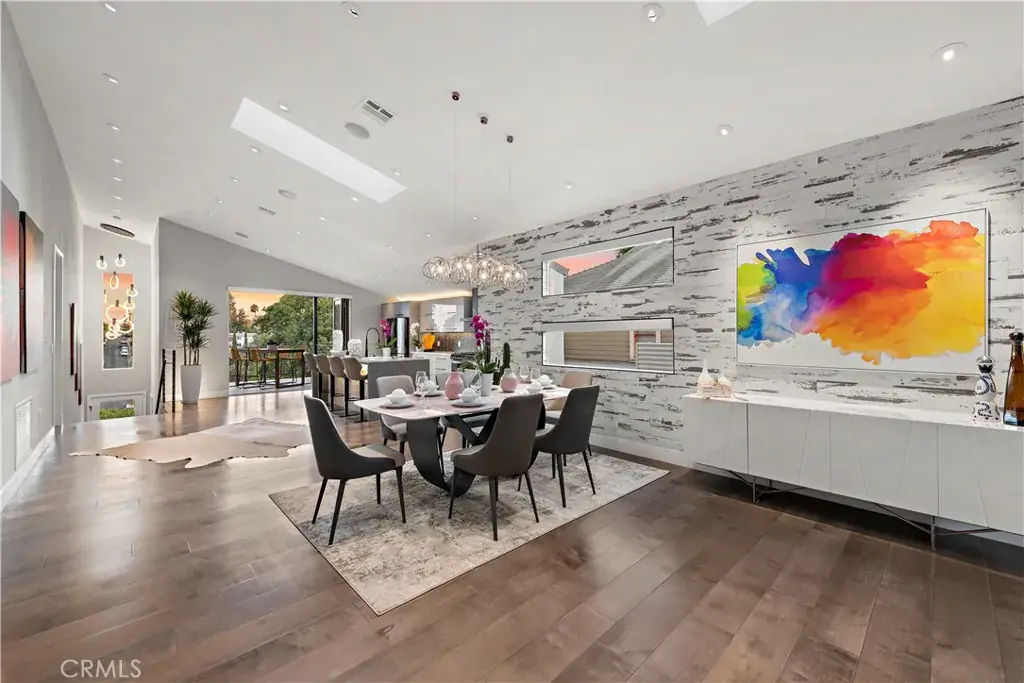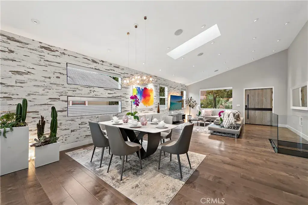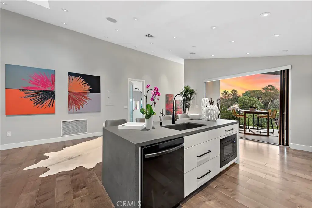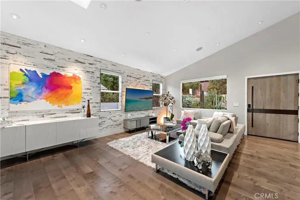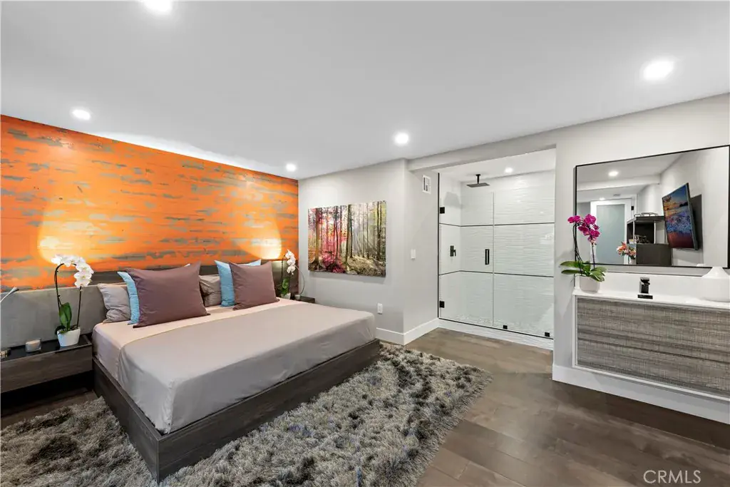 Interiors feature high ceilings, wide-plank wood flooring, skylights, and soft ambient LED lighting throughout, creating volume and natural light across the main living spaces. The chef’s kitchen anchors the home with a statement waterfall island, stone countertops, and sleek European soft-close cabinetry. Generous wall space offers a gallery-like setting ideal for art collections. All three bedrooms are generously sized, offering comfortable living with custom finishes and excellent proportions. European-inspired bathrooms are fully bespoke, showcasing refined tilework and elevated design.
