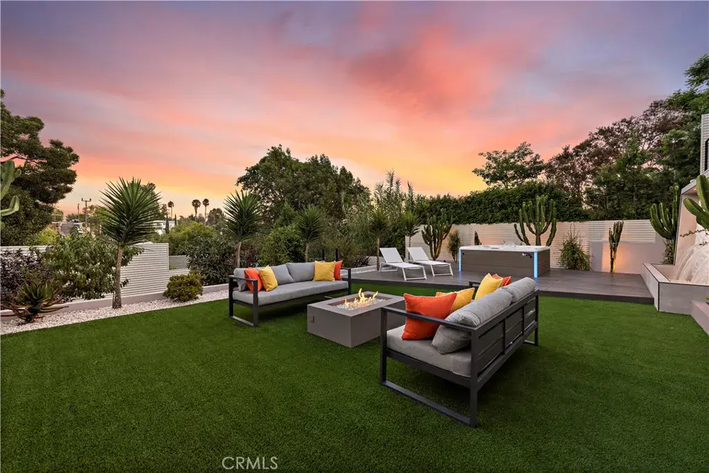 The expansive hardscape patio is designed for entertaining at scale, complete with an outdoor kitchen, tiled lounge areas, and ample gathering space. A second tier showcases a custom LED-lit quartz stone waterfall as the backdrop to a spa retreat, decking, and synthetic lawn. Additional tiers include fruit trees, garden space, and natural privacy buffers. The entire lot is professionally landscaped, turnkey, and entertainment-ready.