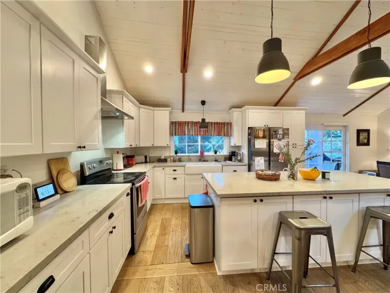 Beautifully updated country cottage set in a private location near hiking and biking trails. The dining area is filled with natural light and features wood-framed windows overlooking the surrounding hills. The living room offers engineered wood flooring, vaulted ceiling, skylights, and a rock fireplace with a wood mantle. The fully remodeled kitchen includes an expansive center island, quartz countertops, farmhouse sink, walk-in pantry, and dishwasher. Off the kitchen, a sliding door leads to a view deck, ideal for outdoor dining or relaxing. The primary bedroom features a vaulted ceiling w/ skylight, spacious closet, and direct access to a private outdoor patio. Down the hall, the spacious secondary bedroom features a vaulted ceiling w/ skylight, ceiling fan, and views of the surrounding mountains. The full bathroom has been updated with tile flooring, a skylight, a tub/shower combination, and a newer vanity with ample storage. The yard is spacious and suitable for animals, gardening or recreation while a picturesque seasonal creek runs alongside the property. A detached approx. 300 sqft workshop includes electricity, a concrete floor, and laundry area w/ washer & dryer included. A separate chicken coop runs alongside the workshop and is also included. Parking for 2–3 cars on-site. Located near Cleveland National Forest and approximately 15 minutes to freeways and shopping, with access to community park and local activities.