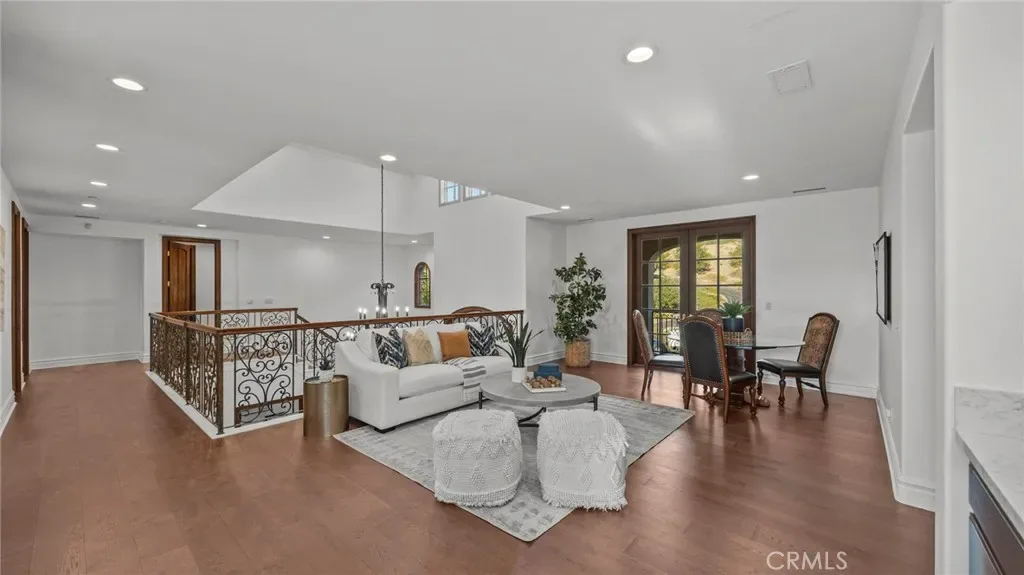 The gourmet chef’s kitchen flows seamlessly into the dramatic, high-ceilinged family and dining room, where walls of windows frame panoramic views of the sparkling pool and rolling hills. Upstairs, an expansive media room is purpose-built for entertainment, complete with a custom cherry-and-quartz bar, kitchenette, and French doors that open to a covered balcony with hillside vistas.