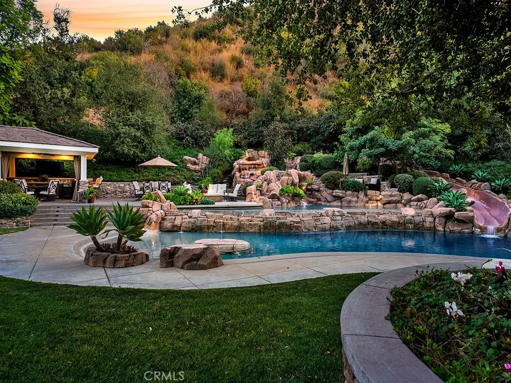 Nestled on 11 picturesque acres in the heart of Orange County this extraordinary estate offers unparalleled privacy and endless opportunities for recreation and entertainment. For the automobile enthusiast, this estate is unmatched featuring a detached 12 car garage, (along with a 3 car garage attached to the main residence) providing ample space for showcasing and maintaining a prized collection. The outdoor spaces are nothing short of spectacular, with a resort-style, multi-level tiered pool, spa & water-slide serving as the centerpiece of an oasis-like backyard. A charming gazebo offers a serene retreat for dining, relaxing and entertaining, all surrounded by lush landscaping that creates a private paradise. Upon entering this five-bedroom, three-and-a-half bath residence you are immediately greeted by a sense of warmth & grandeur. The heart of the home is the spectacular family room, where an oversized rock fireplace serves as a stunning focal point. Built-in cabinetry and shelving frame the space, creating the perfect setting for a state-of-the-art entertainment system and a wall of sound that enhances every gathering. A stylish bar completes the family room making it an entertainer’s dream. Additionally the downstairs presents a chef’s kitchen, breakfast nook, the dining room, living room, office and en-suite guest bedroom. Take one of two staircases to the second floor where two guest bedrooms, full bathroom, a large bonus room, another bedroom, (currently configured as a workout room), the laundry room and the grand primary suite all reside. The grand primary suite is a true retreat, offering a perfect blend of elegance and comfort. Anchored by a cozy fireplace, the suite features a seating area and a private balcony. The luxurious primary bath is designed to pamper, boasting spa -like finishes, dual vanities, a soaking tub, separate shower and the large walk-in closet. Backyard amenities include large manicured lawn spaces, an orchard, playground, stunning pool, spa, outdoor dining area, fire-pit, multiple seating areas. Additional garage amenities are heating, air conditioning, 200 pound compressor with multiple air fitting stations and 3 lifts. This property is a must see!!!