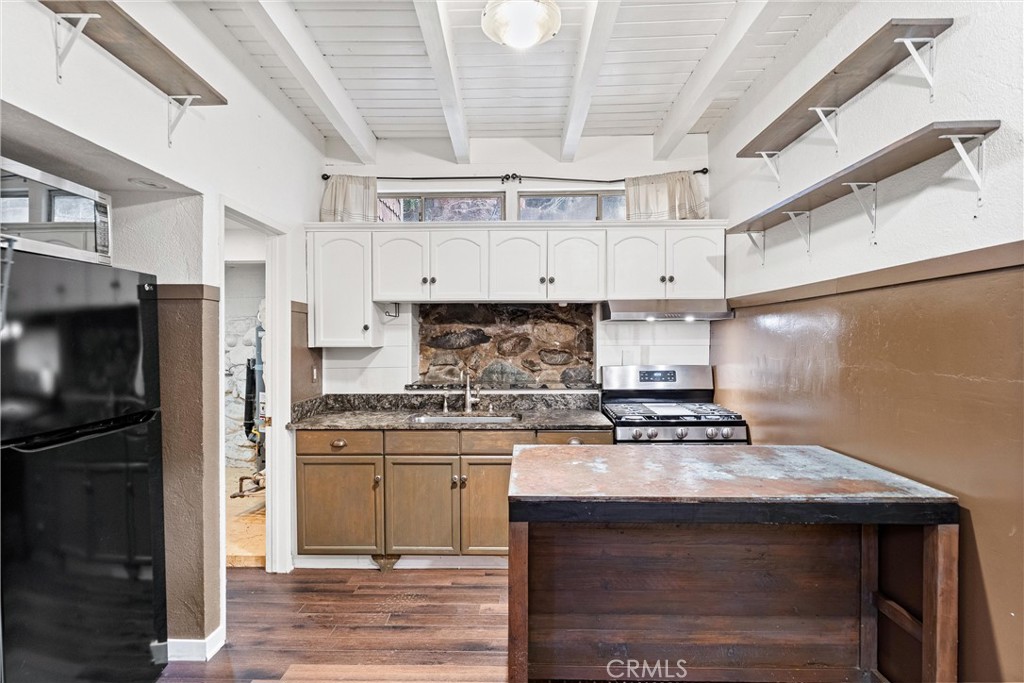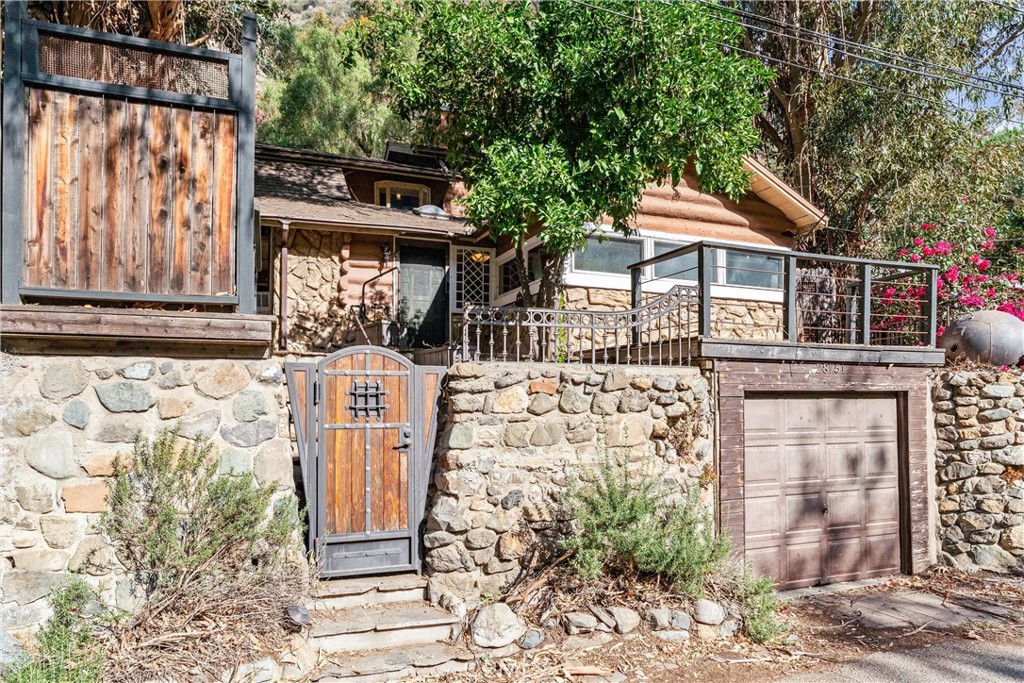 A wood and iron entry gate leads to a welcoming courtyard and elevated front deck with canyon views, a producing orange tree and space for lounging, grilling and outdoor dining. Inside, the main level features a spacious living room with high ceilings, log-style walls, hardwood floors and a wood-burning fireplace that creates a true cabin ambiance. A separate dining area with built-in buffet and stone accent detail connects easily to the remodeled kitchen, which offers white cabinetry, granite counters, an industrial-style center island and an adjacent utility / pantry room with full-size laundry.