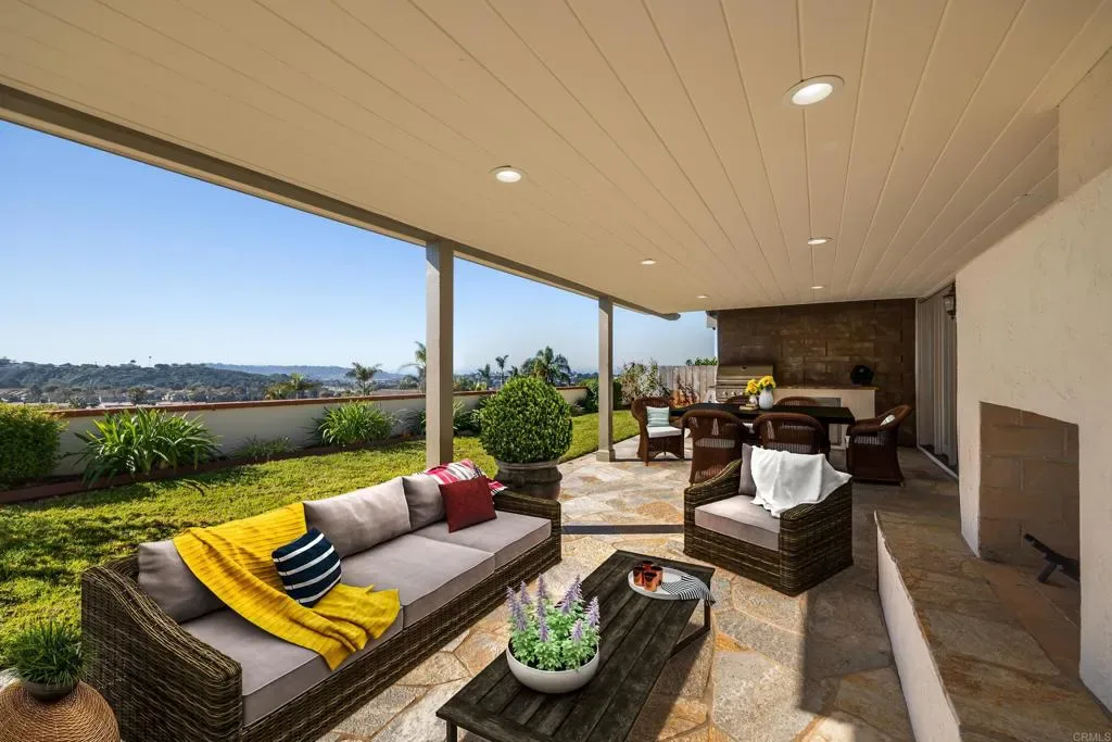 Discover breathtaking panoramic ocean views from this beautifully updated single-level, 4-bedroom home. Designed to capture natural light and the beauty of its surroundings, the home showcases soaring vaulted ceilings and an open, airy layout that creates a sense of space and comfort throughout. Elegant new flooring and highly upgraded appliances including Viking 48 inch range, Viking wine cooler and bar, Miele dishwasher, and built-in Kitchen Aid refrigerator. Multiple living areas make this home perfect for both relaxation and entertaining, with fireplaces in both the living room and family room creating warm, inviting gathering spaces. The chef-inspired kitchen flows seamlessly into the main living areas, making it ideal for hosting family and friends. Step outside to enjoy the ultimate indoor-outdoor lifestyle. A covered patio with flagstone flooring and its own fireplace provides a cozy setting for year-round entertaining while taking in the stunning ocean vistas. The backyard continues the experience with a charming fire pit—perfect for sunset evenings and stargazing. Complete with four spacious bedrooms, thoughtfully upgraded finishes, and a three-car garage offering ample storage and convenience, this remarkable single-level residence combines luxury, comfort, and unforgettable ocean views.