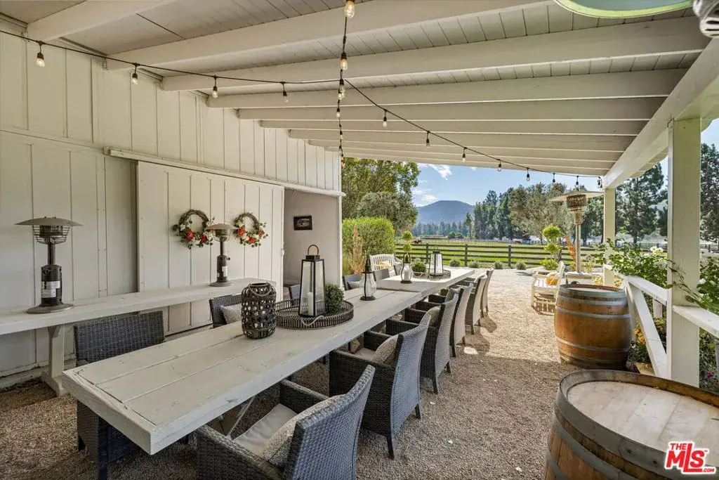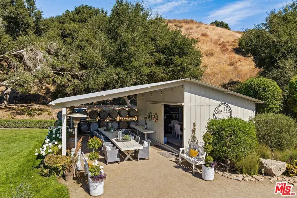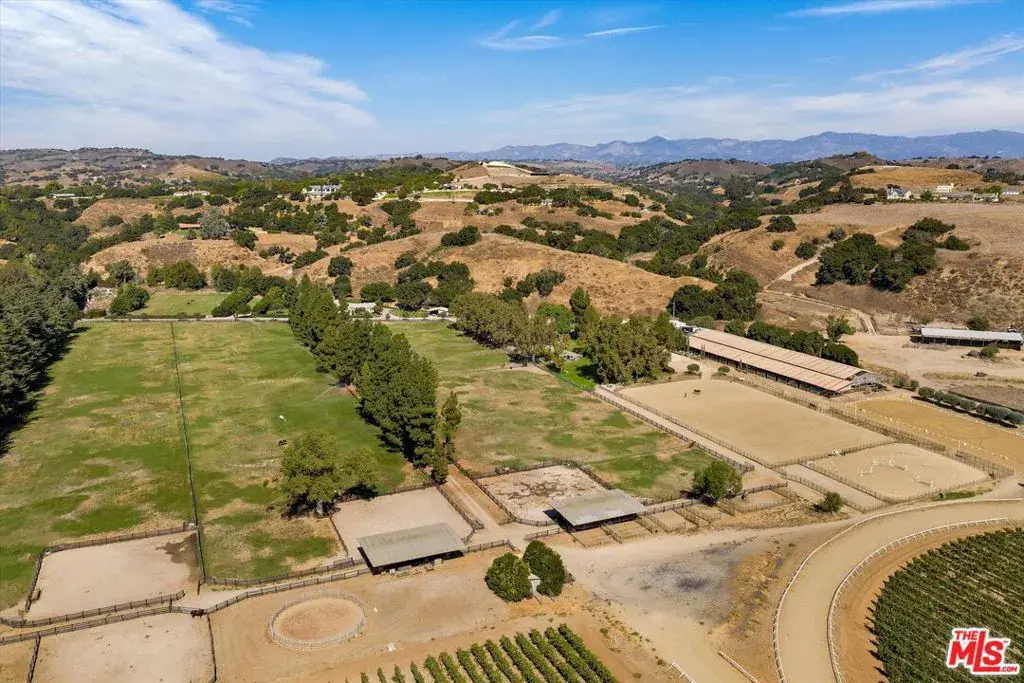 Bella Cavalli Farms & Vineyards is a breathtaking 43.67-acre vineyard and equestrian estate set amidst the rolling hills of the Santa Ynez Valley, offering an unparalleled blend of luxury and rural charm. This private estate showcases a beautifully crafted stone main house spanning approximately 2,680 square feet, with three spacious bedrooms all with on suite bathrooms and a powder bath, designed to capture the elegance of wine country living. A separate guest house provides additional accommodations, making it ideal for hosting family, friends, or extended stays. For wine enthusiasts, the estate features a meticulously maintained 10-acre vineyard with five distinct varietals, along with an olive orchard, offering the rare opportunity to produce your own wine and olive oil right at home. The equestrian amenities are equally impressive. The estate includes a 20-stall, architecturally stunning show barn that’s both functional and beautiful, with ample space and thoughtful design for the care of prized horses. Multiple arenas cater to various riding disciplines, from the precision of dressage to the excitement of cutting, while a main arena with roping chutes and a half-mile conditioning track offer further training options. Five fully irrigated pastures provide ample grazing space, ensuring your horses’ well-being. Also available is the wine label and private wine club membership, allowing you to enjoy and share your creations. A detailed list of recent total interior refit with upgrades and other improvements is also available upon request, underscoring the meticulous care that has been invested in every aspect of Bella Cavalli Farms & Vineyards. Select photos have been virtually renovated.