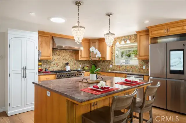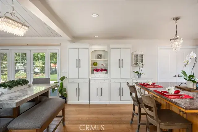 This single level ranch-style home is in move-in condition. It consists of 2 bedrooms, 2 baths with a highly desirable open-floor plan. Features include wood floors, stone fireplace, gourmet kitchen with wolf range/oven, custom cabinets, granite counter tops, custom tile hand made by Michelle Griffoul Studios, and RO System in kitchen sink. The family room is light and bright and generous in size with open beam ceiling and French doors opening to side yard. Both bathrooms were divinely remodeled in 2023 (approx.) Other features include (2) car garage, A/C, new windows, tank-less water heater, whole house water softener & filtration system from Jim Galeon at Aquapure, and new electrical 400-amp panel and plumbing.