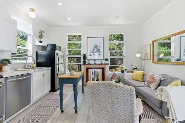 Welcome to affordable living in sunny Soquel! This beautifully maintained 2022 manufactured home feels like new and is tucked away at the back of the park, offering a peaceful and private setting with no neighbors. The home features 9-foot ceilings, crown molding, recessed lighting, dual-pane windows, and stylish luxury vinyl plank flooring. Enjoy modern conveniences like a gas range, tankless water heater, USB charging ports, and an in-home washer and dryer. The exterior boasts mature landscaping with lush plants and greenery. Just up the street from Soquel Village, offering a variety of restaurants including HOME, Sawasdee, and Tortilla Flats, along with antique shops, boutiques, wineries, and more. Only minutes from New Brighton State Beach and the charming Capitola Village.