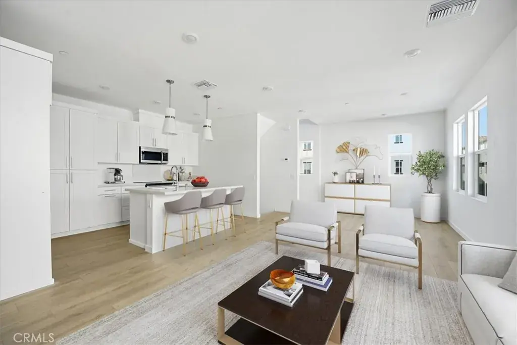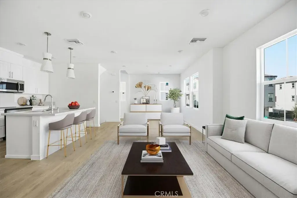 The second floor features an open-concept layout with a contemporary kitchen complete with a center island, sink, dishwasher, and bar seating, all opening to the great room—perfect for entertaining and family gatherings. A powder room with modern finishes adds convenience for guests.