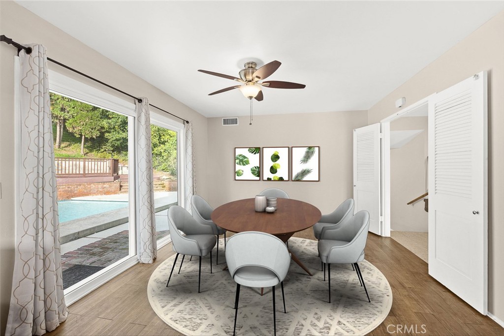backyard. This features a sparkling swimming pool with protective fence for safety, gas fire pit, barbecue area, lush greenery with space to relax and enjoy. The downstairs is completed by 2 bedrooms boasting large closets and a remodeled bathroom. The other 3 Bedrooms and 2 bathrooms are located upstairs. The private master suite has double closets and a remodeled bathroom with walk in shower. The last 2 bedrooms have large closet spaces and share a remodeled hall bathroom with bathtub-shower combo and picture mirror. Recent remodel includes: 220V EV charger, new windows, roof, central a/c and heat, interior/exterior paint. flooring, water heater and pool resurfacing. Conveniently located near award winning schools, shopping, restaurants,