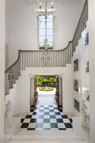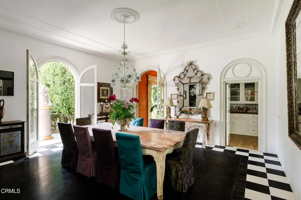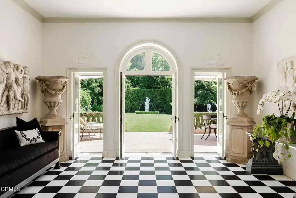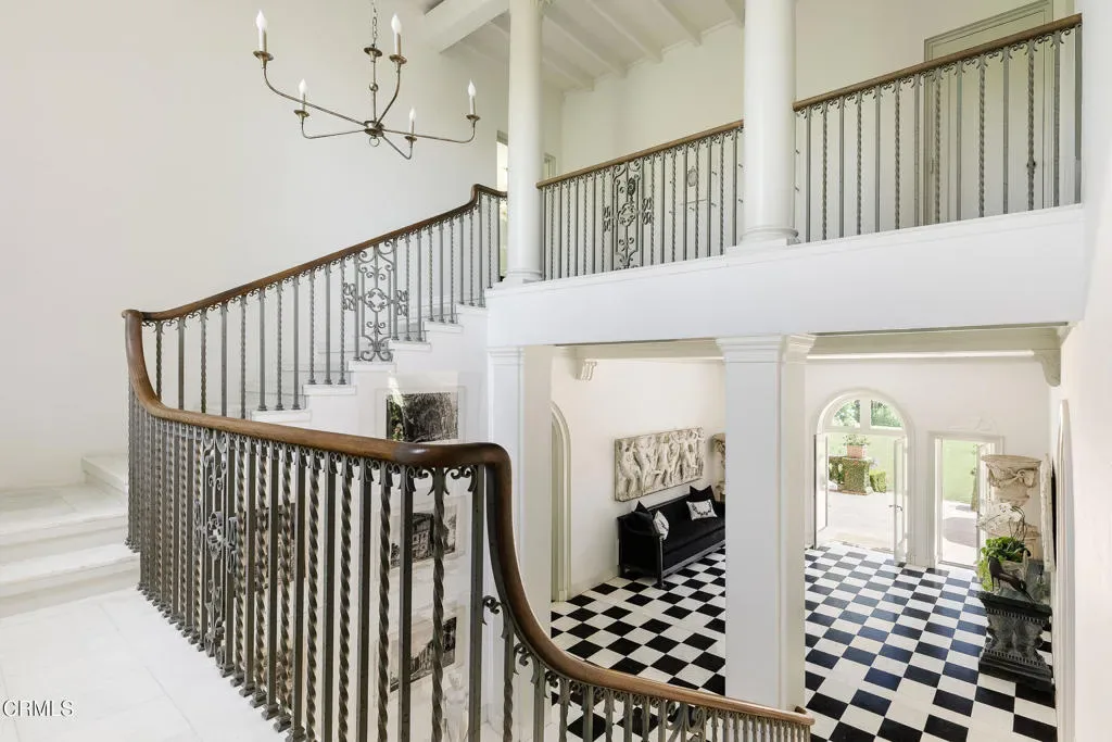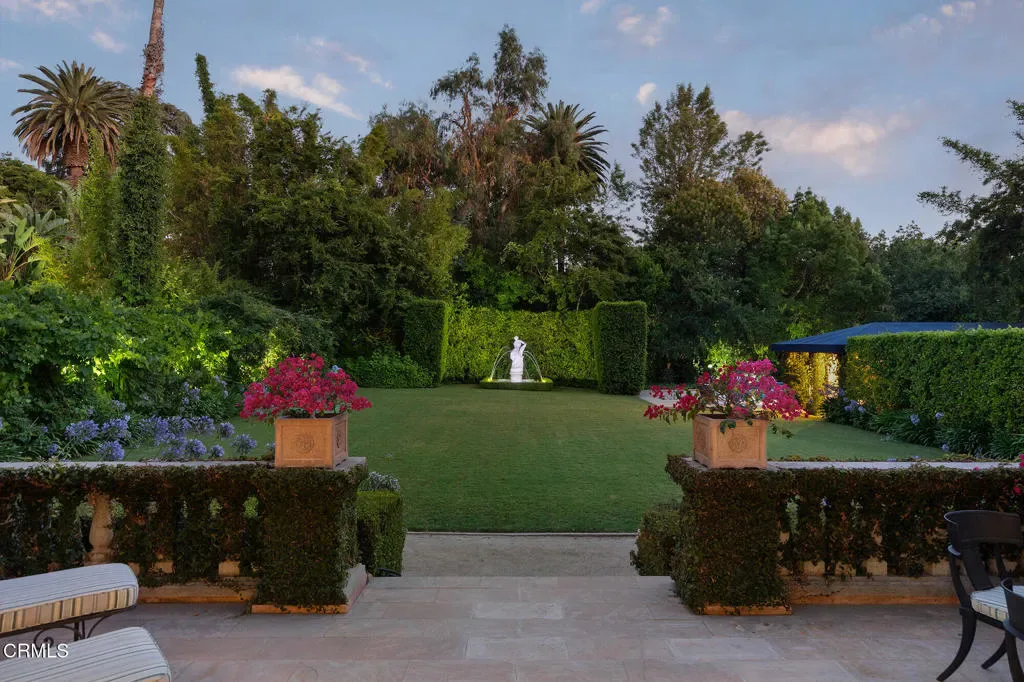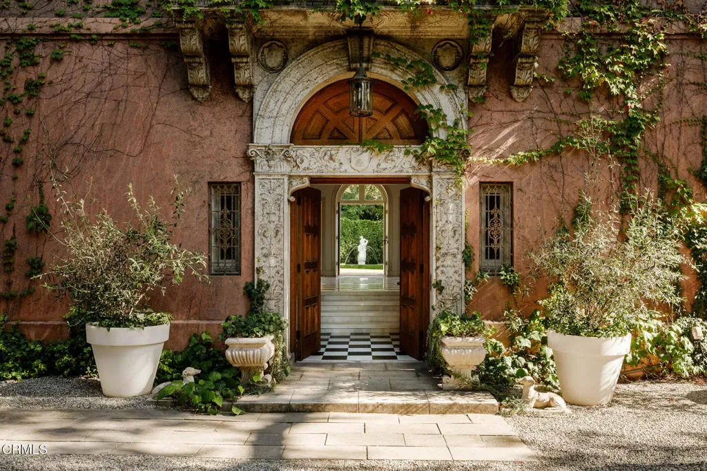 Secluded behind the original estate walls, noted architect Reginald Johnson’s masterful recreation of a Tuscan villa is a surprise, sited on a flat one acre parcel in the quiet South Arroyo neighborhood of Pasadena and South Pasadena. Belying the ease of quick accessibility to downtown Los Angeles, Pasadena, and freeways giving universal access to LA’s network, the property offers a convenient retreat from our busy world. The Italian Renaissance Revival villa is structured with inspiring historic detail, the work of original craftsmen brought from Italy to ensure old world quality. The double doors to the two-story entry hall lead to an initial gathering space with classical columns, scaled impressively for formal gatherings, while the honed marble floors and warm woods are equally comfortable with today’s barefoot indoor outdoor lifestyle. Owned by Pasadena luminaries for nearly a century, the 5-bedroom, 5-bathroom primary residence features voluminous space and height throughout with tall Palladian doors and windows filling the rooms with beautiful light and air. Formal living room and adjoining library – both with fireplaces, and a formal dining room all have direct access to outdoor patios, captivating gardens and the expansive lawn beyond. Warm, inviting chef’s kitchen with casual seating area and an adjacent butler’s pantry, back kitchen storage/mudroom, separate laundry room, two bedrooms and bathroom complete the lower level. The second level is divided into two distinct zones accessed from the central landing. Luxurious primary suite – with separate bedroom, dressing and sun rooms and walk-through closet and bath. Opposite is an additional bedroom suite with bath ensuite and adjoining sitting room, as well as another large bedroom with bathroom and closet ensuite. Sequestered one bedroom guest house with living room anchored by a fireplace, kitchen, bedroom and bath – all surrounded by its own hedged gardens. Swimmers pool, spacious pavilion, spa retreat, hidden rose garden and dining area with fireplace and grill. Lushly landscaped with sweeping lawn, mature specimen trees, grape arbor, secluded refuges and several fountains. Generous parking area includes carport for multiple vehicles.