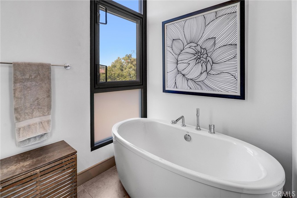 Back inside, the isolated primary retreat boasts a spa-like ensuite with a walk-in closet, a modern double vanity, a free-standing soaker tub, a W/C and a frameless glass shower. The guest bedroom also has a custom closet and a beautiful private ensuite bathroom.