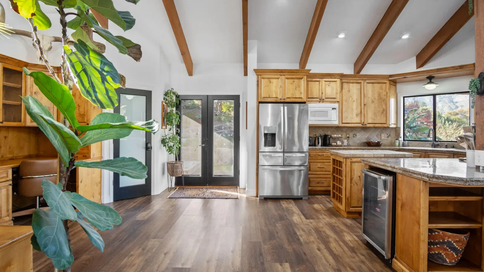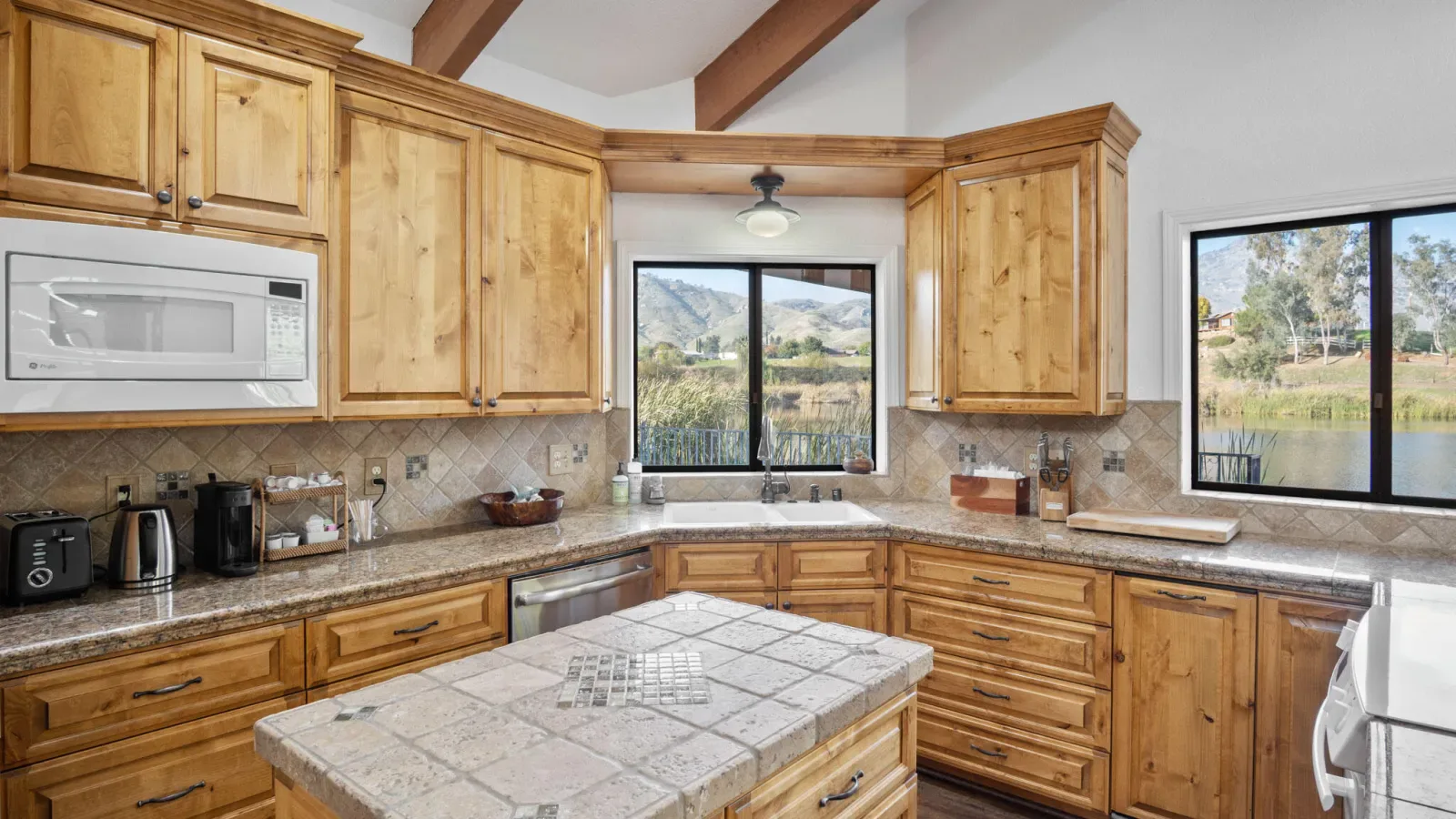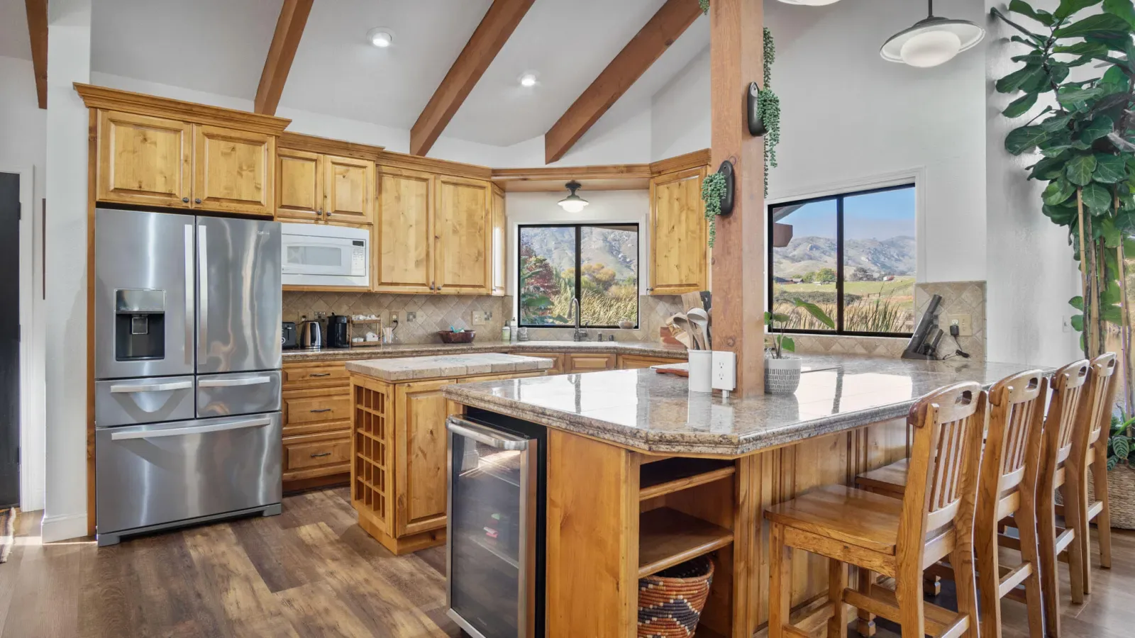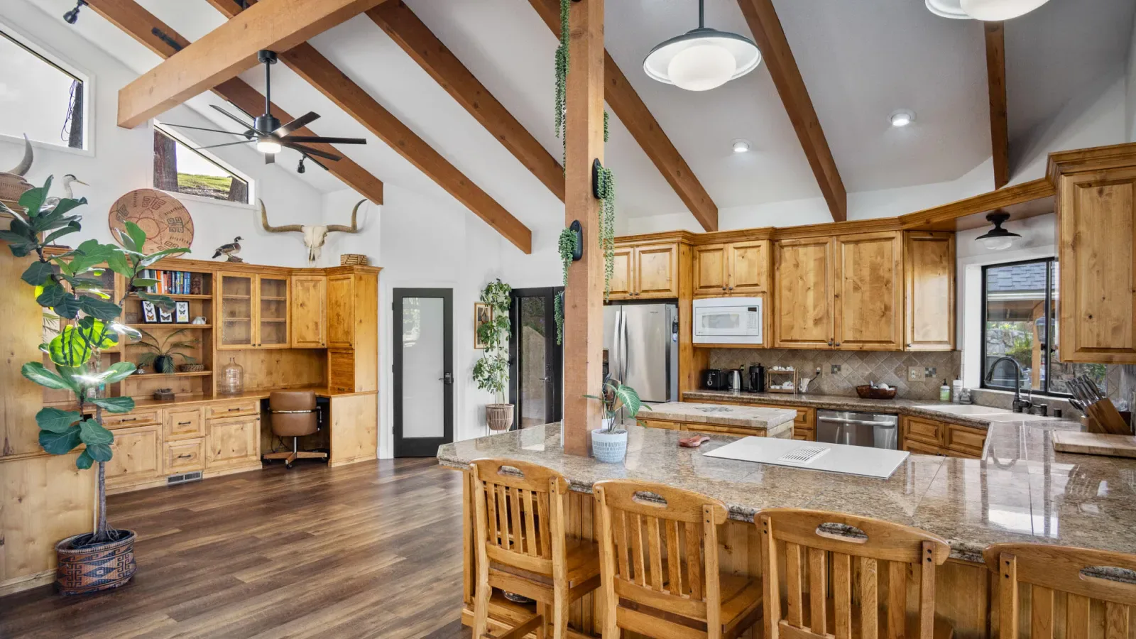 Built-in Features, Beamed Ceilings, Breakfast Bar, Ceiling Fan(s), High Ceilings, Kitchen Island, Open Floorplan, Recessed Lighting, Tile Counters, Track Lighting, Vaulted Ceiling(s)