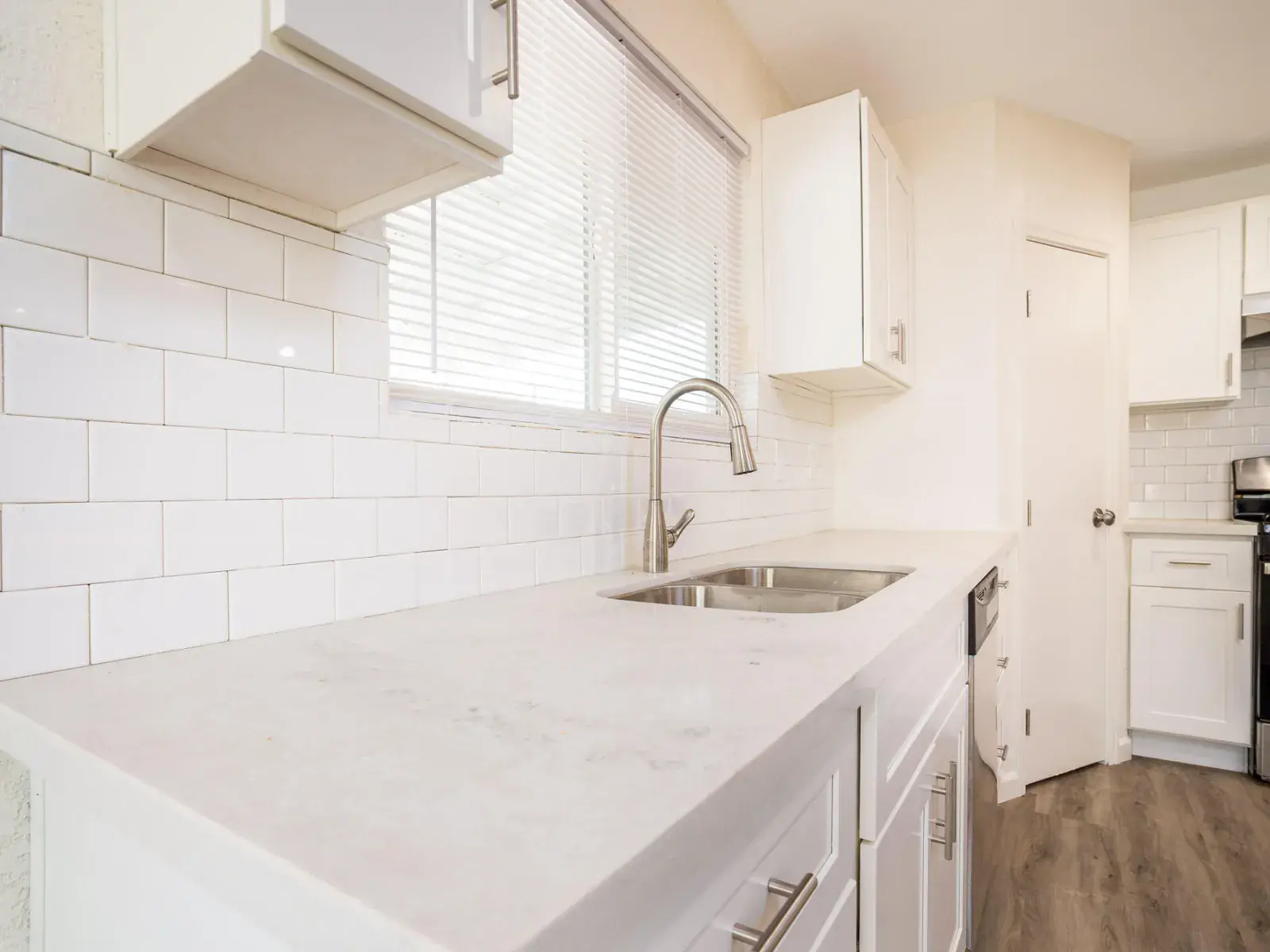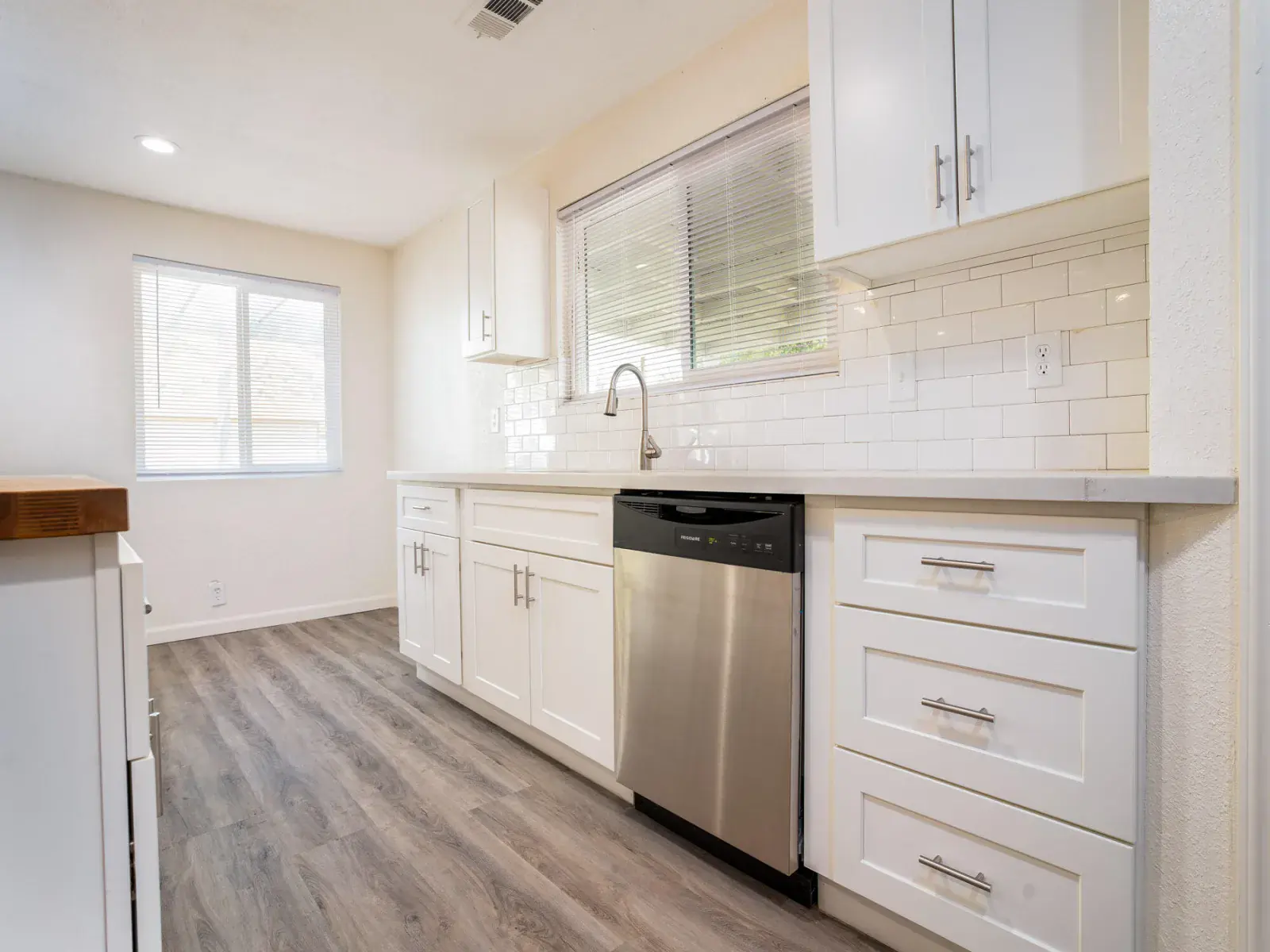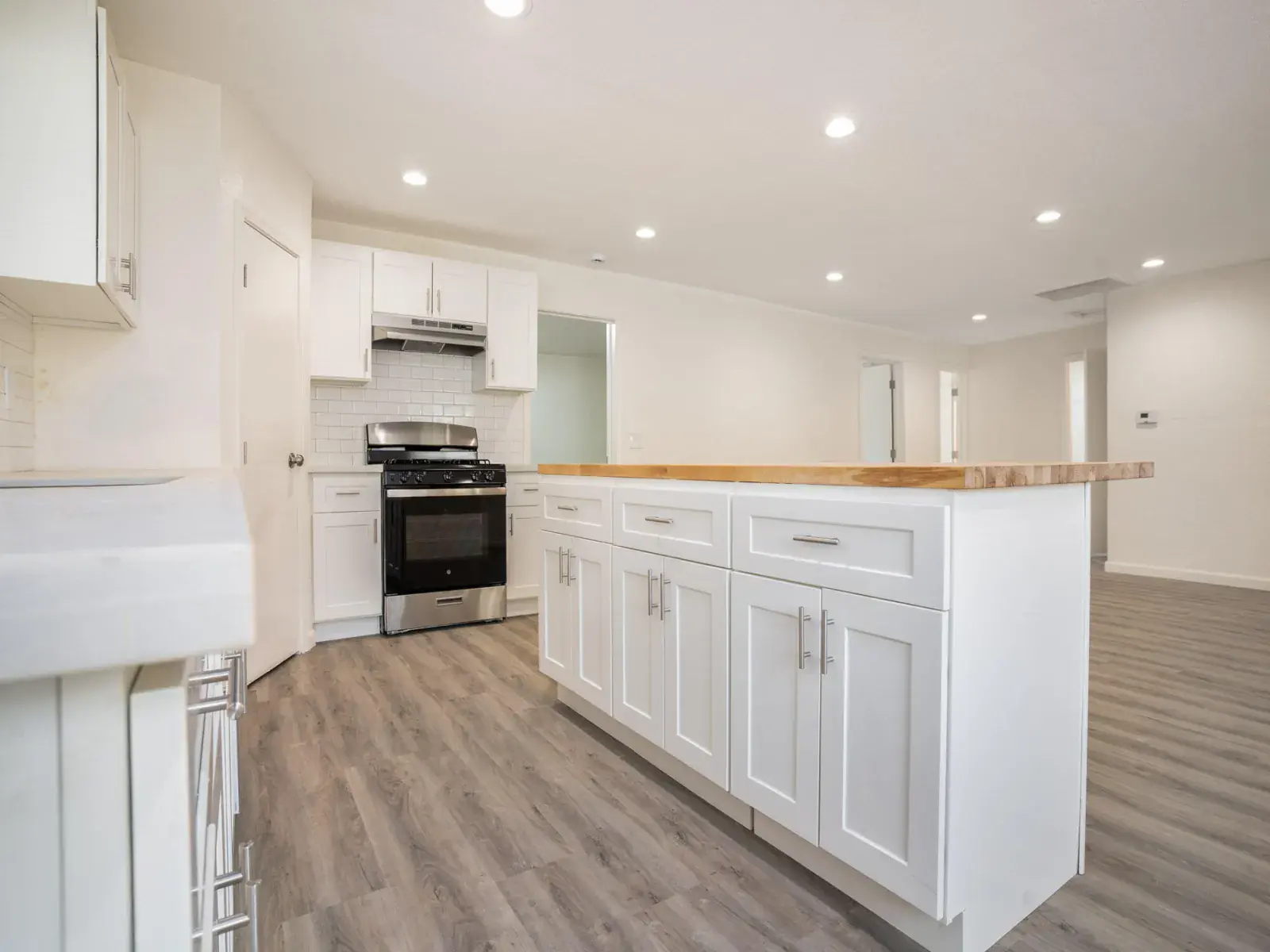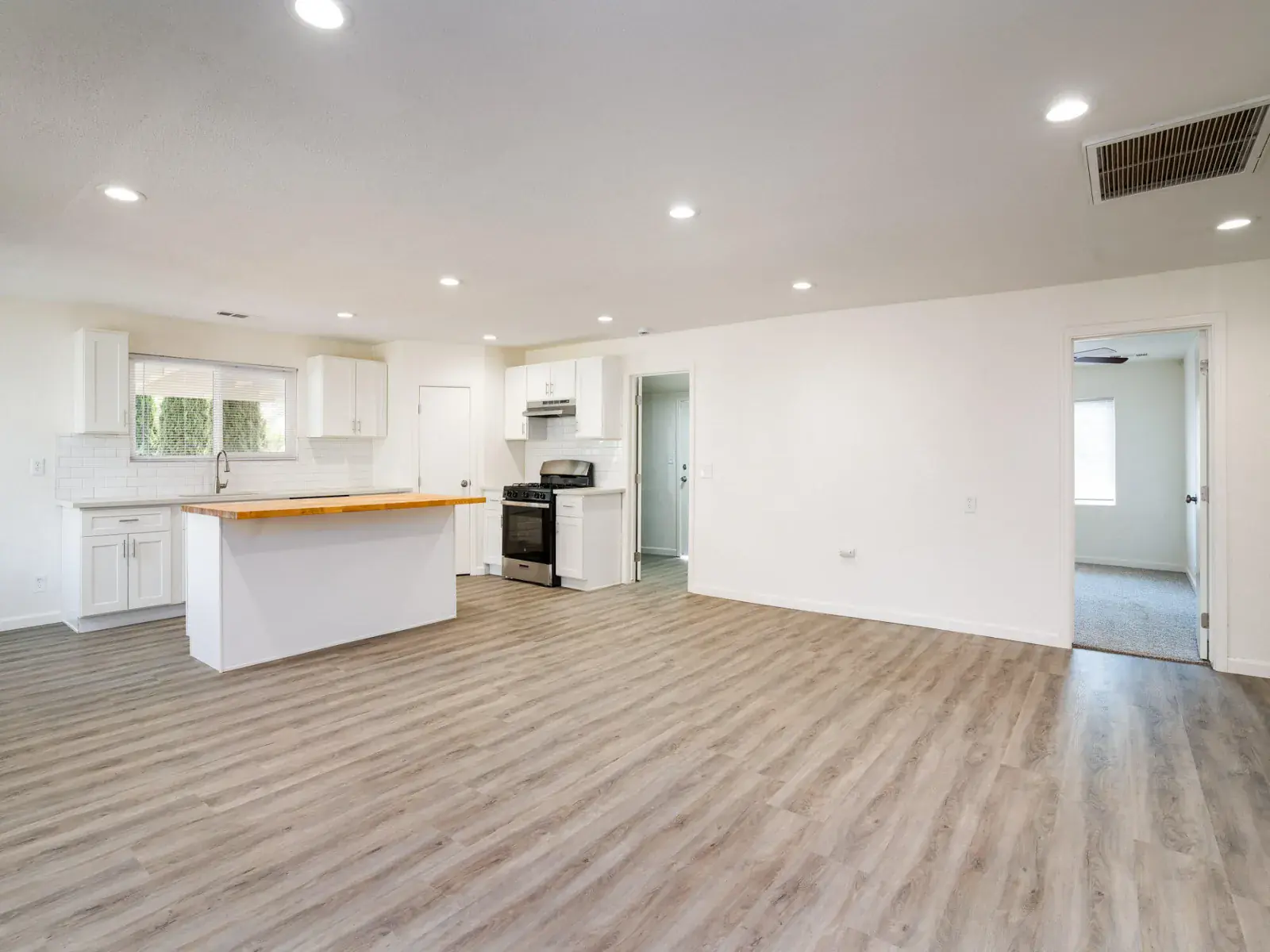 Step inside to find fresh paint throughout, complemented by luxury vinyl plank flooring that flows seamlessly across the open-concept living spaces. The gourmet kitchen is a chef’s dream, featuring brand-new cabinets, sleek quartz countertops, a chic subway tile backsplash, and a unique wood block kitchen island. Stainless steel appliances add a touch of sophistication, while ceiling fans and central AC ensure year-round comfort.