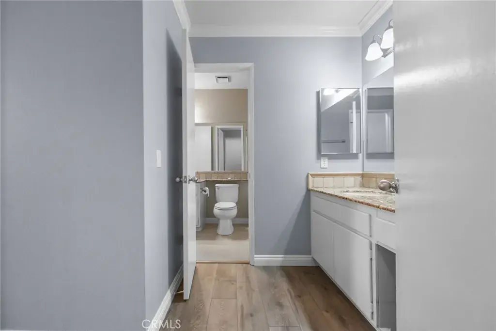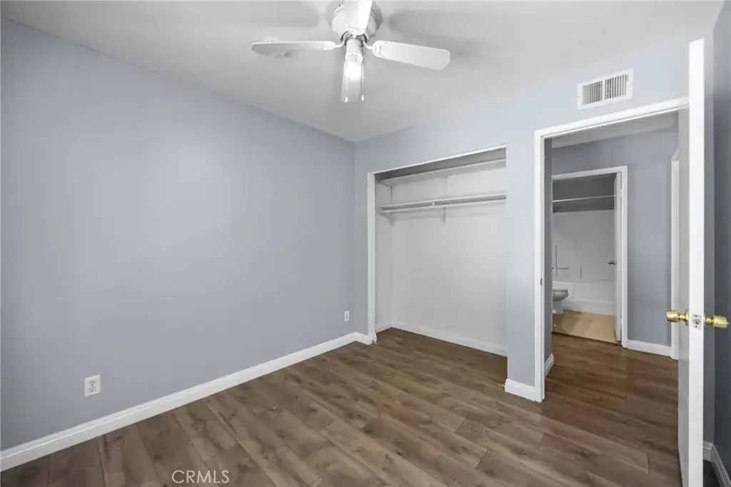 A charming 2 bedroom 1 bath condominium located in Stanton inside the gated community of Crosspoint Village. The condo is located further in from the Boulevard and streets and offers a much quieter location. The condo is has vaulted ceilings, laminate flooring and recently painted inside. This a great quiet and peaceful community with HOA amenities including several pools, spa, hot tubs and a green belt and lots of trees around the community. The home is on the second floor with a large master bedroom with a walk in closet and a large vanity next to the bathroom. There is a large landing at the entrance of the home.