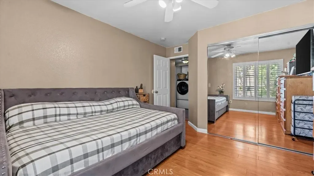 Rare Single-Story Condominium in Gated Briar Oaks!!!!Welcome home to this available downstairs, single-story 2-bedroom, 2-bath condo in the highly desirable gated Briar Oaks community. Featuring an attached single-car garage with direct access. Inside, you’ll find a spacious open-concept layout with hardwood floors throughout, newer central A/C and heating, and a beautifully upgraded kitchen. The generously sized primary suite includes an upgraded bathroom and a large walk-in closet with bonus storage. Both bathrooms have been tastefully upgraded, and the inside laundry adds everyday convenience. Additional highlights include ceiling fans, abundant storage, garage shelving, and a private covered patio — perfect for relaxing. Enjoy resort-style community amenities including a pool and spa, ample guest parking. Ideally located near shopping, restaurants, and Stanton Central Park.