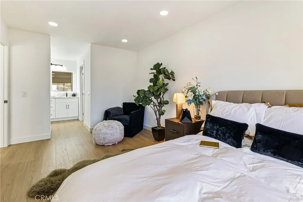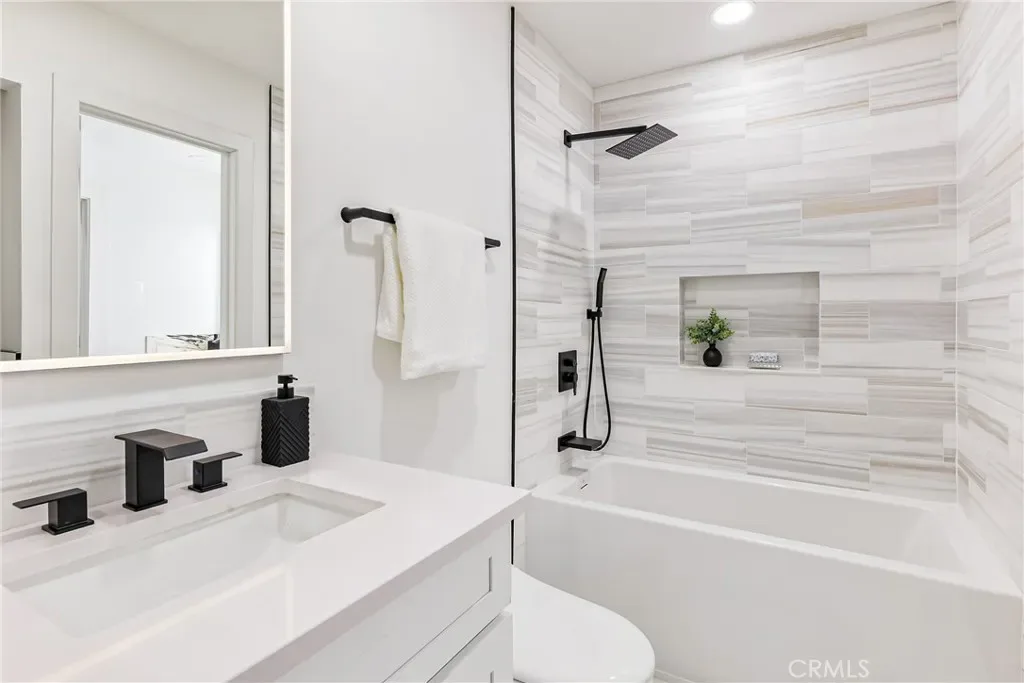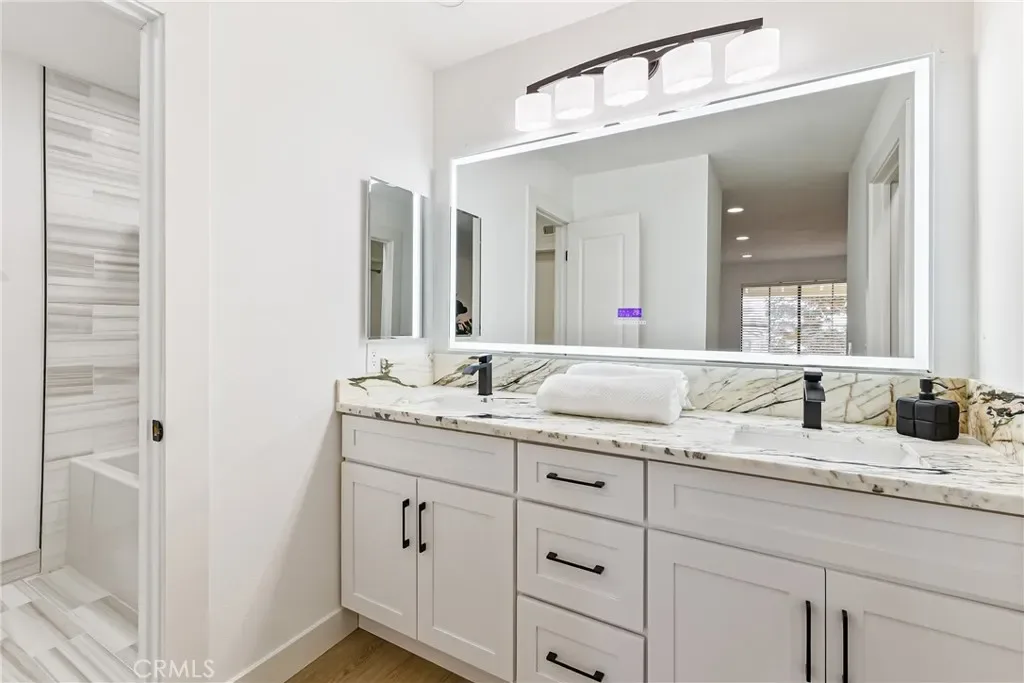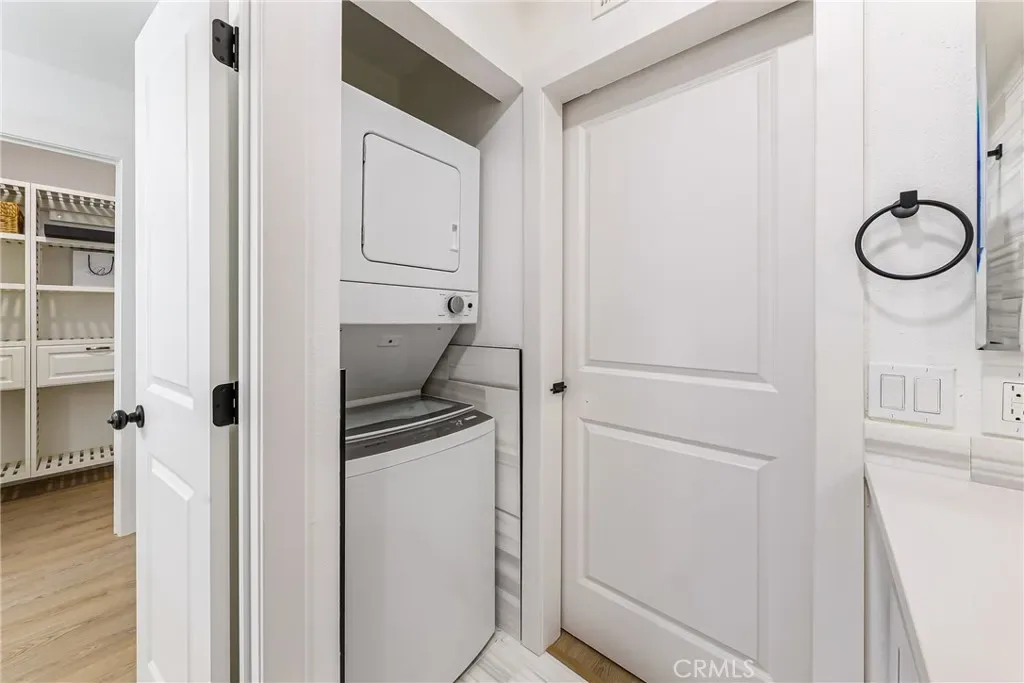Gorgeous 2 bedroom home with vaulted ceilings. This home features a new custom kitchen with Built-in China cabinet beveled glass and two built-in pantries with custom marble counters. New Stainless Steel LG appliance’s included in sale. Gas range, refrigerator and dishwasher. Beautiful Custom Marble counters and cabinets in bath & main suite. All new plumbing fixtures. Large deep custom tub with rain shower. Lighted mirrors with WIFI. Mirror wardrobe, large walk-in closet with built-ins. Washer/Dryer included in sale. Recessed lighting in all rooms with dimers. Waterproof laminate flooring. This pristine condo offers privacy, convenience, and true turnkey living. Completely remodeled throughout, New outside decking just completed. Central heating & air-conditioning. New thermostat. Freshly painted with all new door hardware. This is a true modern upgraded home to enjoy and entertain your guests. A safe and Guard gated community. Freestanding Electric Fire Place included. Within 1 minute walking distance of the pool & jacuzzi. Knott’s berry Farm, and several entertainment and restaurant’s facilities close by. Easy and close commute to 405/22 freeways, many restaurants & entertainment close by. Close to the pool and other amenities. One covered assigned parking space with plenty of guest parking spaces. This home is Pride of Ownership.