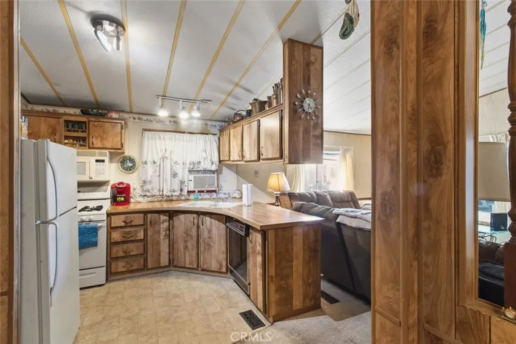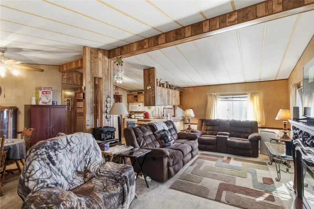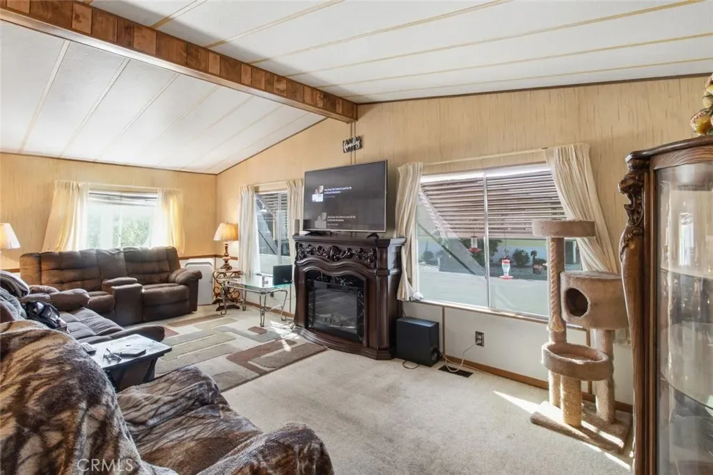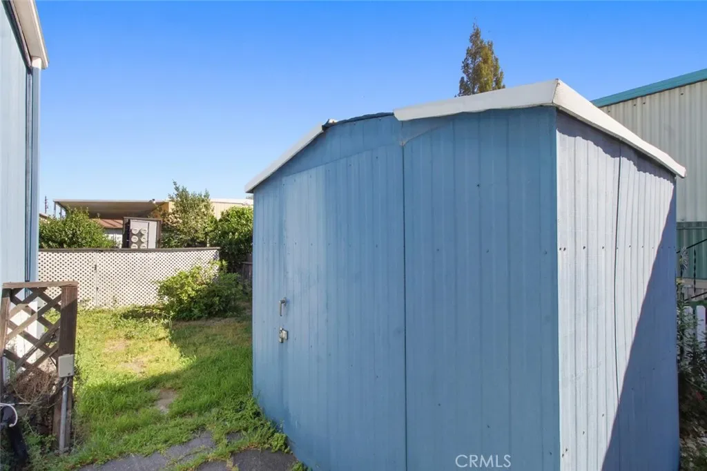 Step into comfort and charm with this wonderful 2-bedroom, 2-bath manufactured home offering approximately 1,056 square feet of inviting and functional living space. Thoughtfully designed with a warm, welcoming feel, this home is perfect for those seeking both comfort and practicality in a peaceful setting. Inside, the spacious living room greets you with vaulted ceilings, exposed beam style accents, and an abundance of natural light pouring through large windows. The open-concept layout seamlessly connects to the kitchen, dining area, and living room, enhancing the home’s airy and connected feel. The kitchen offers a functional U-shaped design with linoleum flooring, rich wood-style cabinetry, and ample counter space for meal preparation. A free-standing stove and oven, overhead microwave, and window over the sink provide both convenience and natural light. Adjacent to the kitchen, the dining area offers plenty of space for gatherings and everyday meals. Both bedrooms are generously sized with soft carpeted flooring and a comfortable, restful atmosphere. The primary bedroom features enough space for a dedicated makeup station and has a spacious walk-in closet, adding both convenience and privacy. The primary bathroom includes a shower-over-tub combination, a well-lit vanity space, and practical layouts designed for ease of use, and the second bathroom includes a dedicated shower stall. A separate laundry room with washer and dryer hookups and additional cabinetry adds everyday functionality and extra storage. Step outside to enjoy the covered front deck, perfect for morning coffee or unwinding in the evening. The covered carport provides convenient, protected parking, while the backyard offers a relaxing and easy-to-maintain outdoor retreat. Enjoy lush green grass, a designated garden area ideal for planting, and wooden fencing that adds both privacy and charm. A matching storage shed provides additional space for tools, hobbies, or seasonal items. Blending comfort, character, and outdoor enjoyment, this home presents a wonderful opportunity to enjoy relaxed living in a well-maintained and welcoming community. Don’t miss your chance to make this inviting property your own! Welcome Home!!!