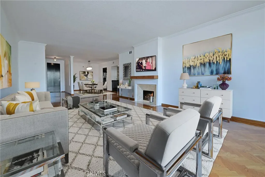 crown moldings, fireplace and wet bar all in an open entertaining floorplan. Chef ‘s kitchen drenched in sunlight with stunning views and dining