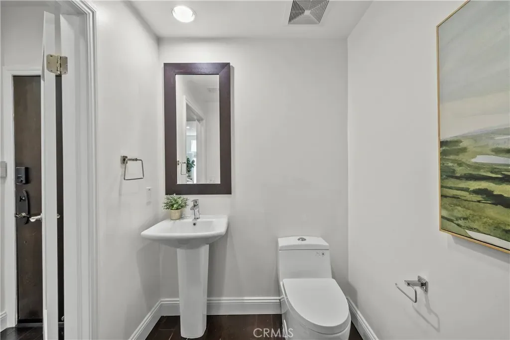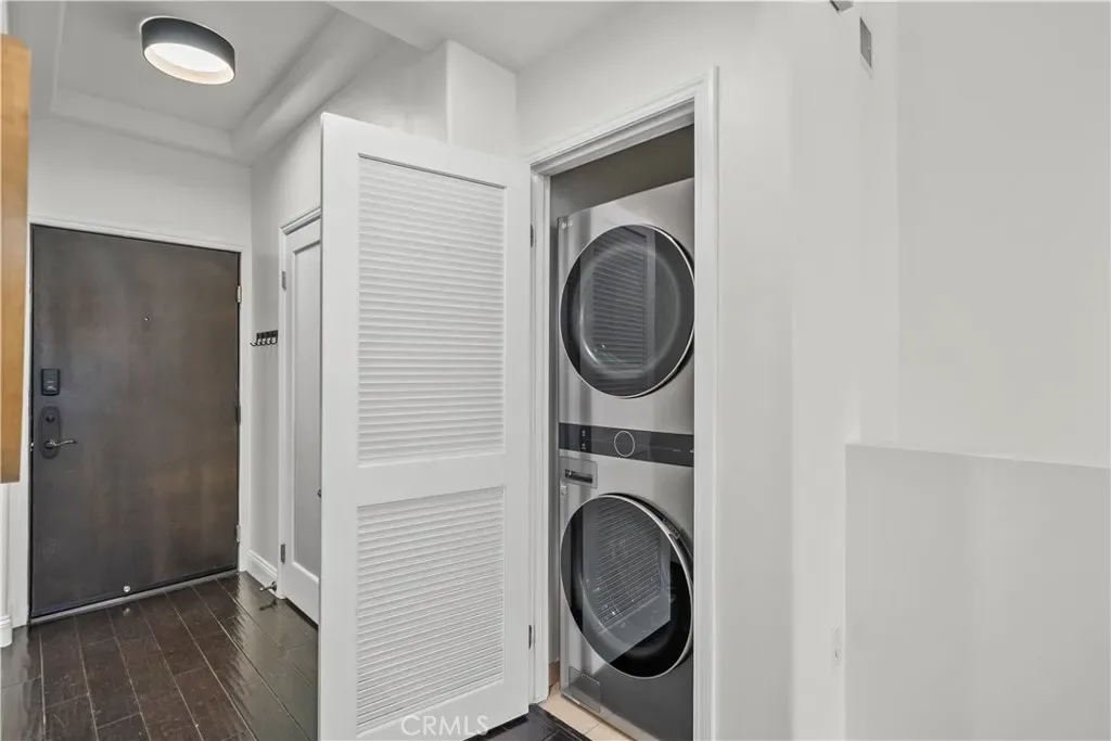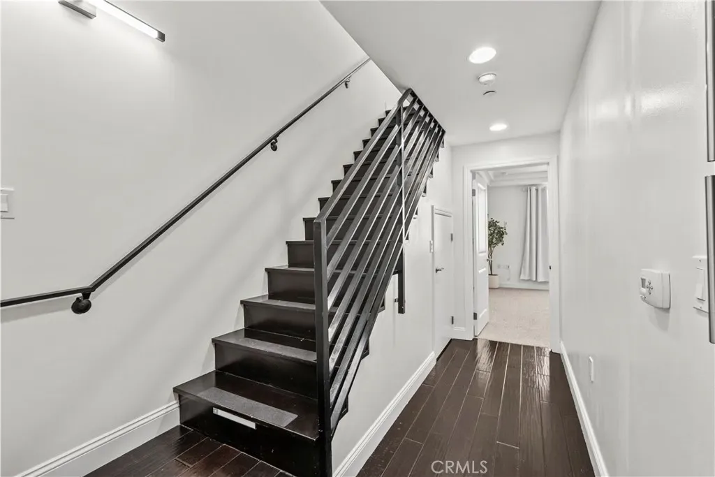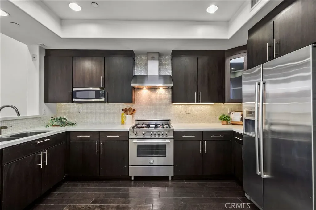 Discover this stunning two-story Penthouse with 2-bedrooms, 2.5-baths in the highly sought-after Studio Villas West, a mid-century-inspired building in Studio City. Located on the top floor, this unit boasts an open, sunlit living and dining area with recessed ceilings, dark hardwood floors, a gas fireplace, and french doors. The chefs kitchen features stainless steel appliances, a Bertazzoni range, quartz countertops, and ample storage. The primary suite impresses with a luxurious en-suite bath complete with a dual vanity, soaking tub and separate shower. The unit also features an additional bedroom with its own en-suite bath, a hall bath, and in-unit stacking front-loading laundry. Additional highlights include recessed lighting throughout, two parking spaces, a fitness center, courtyard with fountains, controlled access and common area security. Studio Villas West, built in 2009, is steps from CBS Radford Studios, the Studio City Farmers Market, and the vibrant shops and restaurants on Ventura Blvd. Its prime location offers easy access to Carpenter Community Charter School, parks, trails, and local amenities