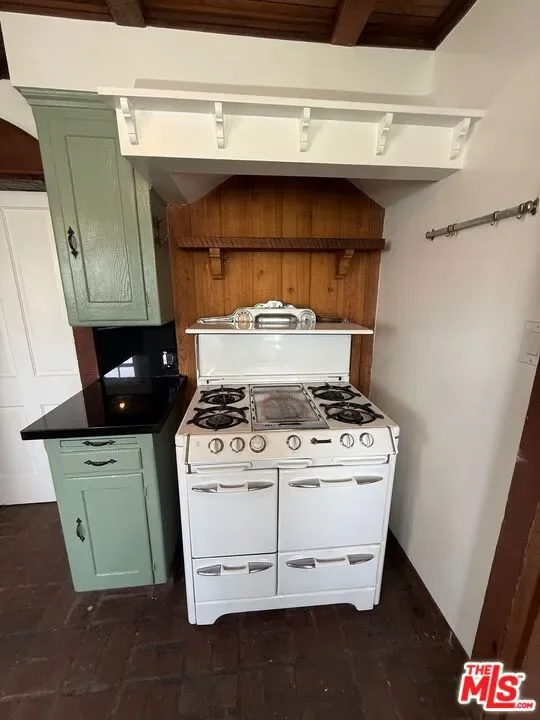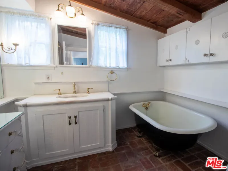 Charming Hillside Cottage on a Private Drive South of the Blvd. Entrance is through a fenced in courtyard & up a curvy brick path. The bright & spacious living room has a fireplace, hardwood floors, beamed ceiling, and lovely treetop and mountain views through a wall of windows. Original ceiling detail in the dining room. The kitchen has a cozy breakfast nook with built-in booth and a classic O’Keefe & Merritt gas stove with a grill, a new refrigerator, new granite countertops and used brick floor. Large pantry/laundry room with built in shelves and stack washer & dryer. Two main floor bedrooms with built-in custom cabinetry. Large bathroom with a vintage claw foot tub, separate shower and lots of storage. The downstairs garden floor has a bedroom with a walk-in closet and built in cabinets. Spacious family room/studio/media room with a fireplace, two big windows and a French door leading to the garden. Large wine cellar with storage. Two car garage with direct entry. This is a (Robert) Bryd House on a lane with 3 other Byrd Houses, quite unique! Near Freeways, Studios, Fantastic Restaurants, So Much Shopping, a Great Farmer’s Market & Very Close to Trader Joe’s. Several Schools are just down the road.
