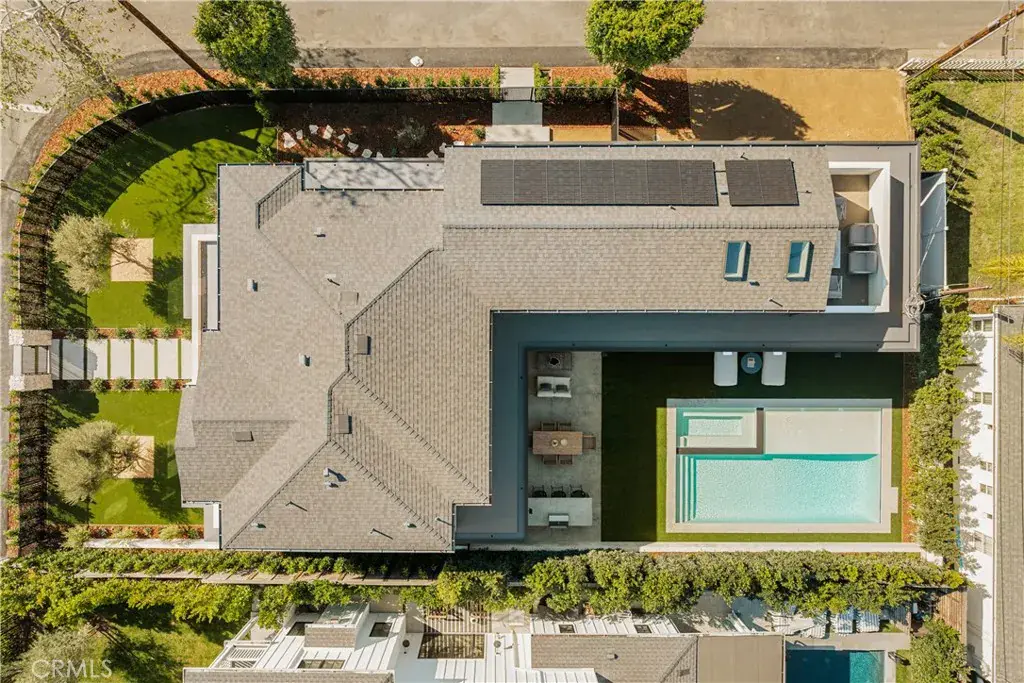 The backyard is dialed in for the California lifestyle: a sleek pool with Baja shelf, covered patio lounge, built-in BBQ, and multiple areas for dining and relaxation, all privately hedged and perfectly positioned on this corner lot.