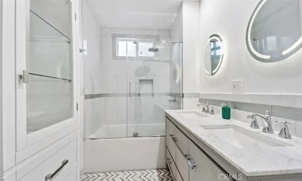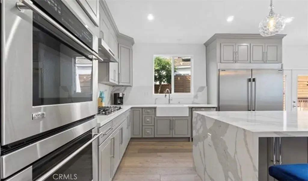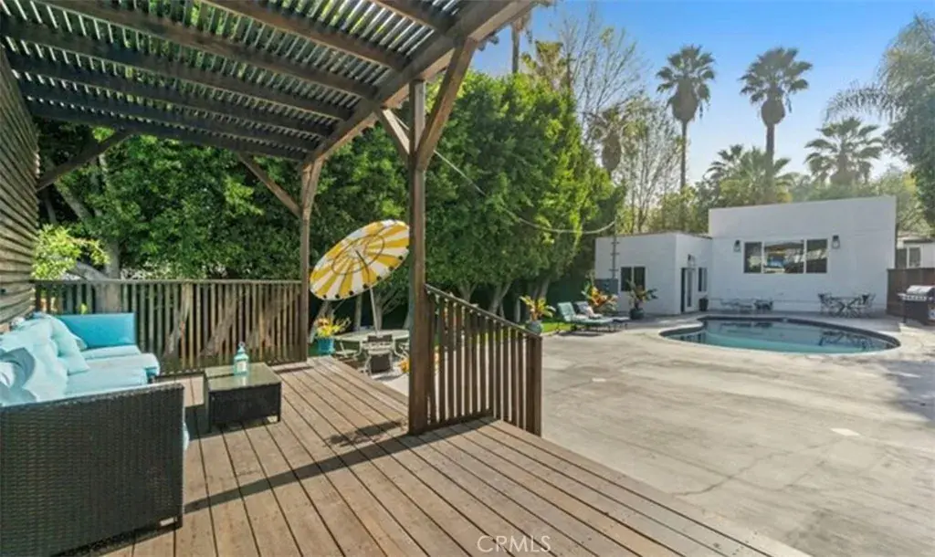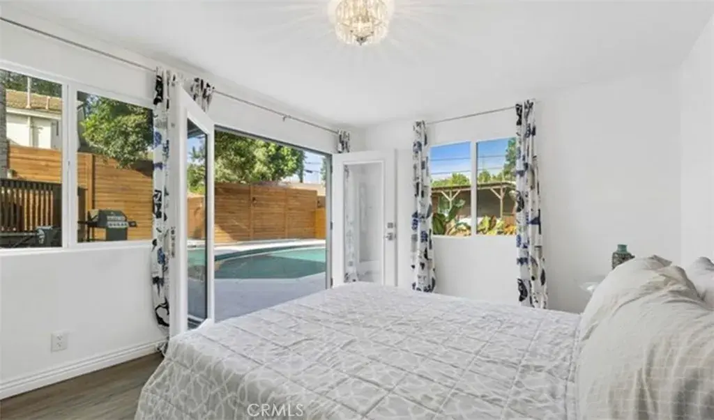Step in through the front porch to be welcomed by a large and bright living room with custom built-ins, a gas fireplace, hardwood floors, and easy access to the kitchen. This 2,110 square foot home features 5 bedrooms, 4 bathrooms, an upgraded ADU with its own kitchen, bathroom, bedroom, living area and entrance. The immaculate kitchen features stainless steel appliances, marble countertops, a large center island, custom built-ins plenty of cabinet space. The two en-suite bedroom have beautifully remodeled bathrooms, and one has direct access to the backyard through the double doors. The remaining guest bedrooms are spacious and full of natural light and perfect for an office/work station set up. Enjoy the California sun in the entertainer’s backyard, featuring a large deck and sparkling pool. THE ADU IS INCLUDED. IT IS AN ADDITIONAL 410 FEET OF SPACE.