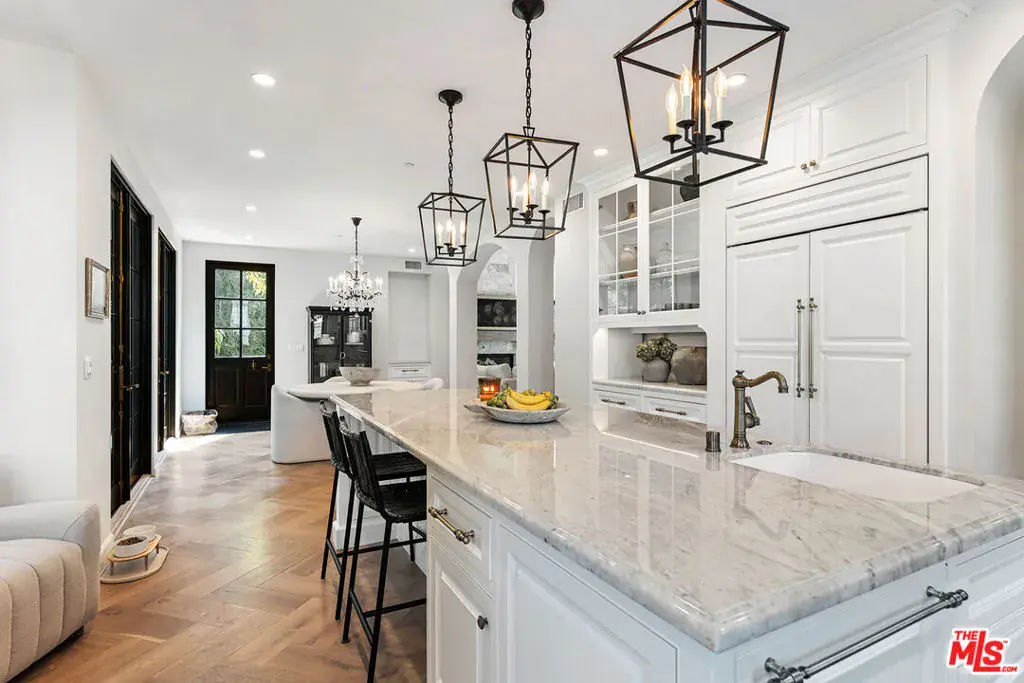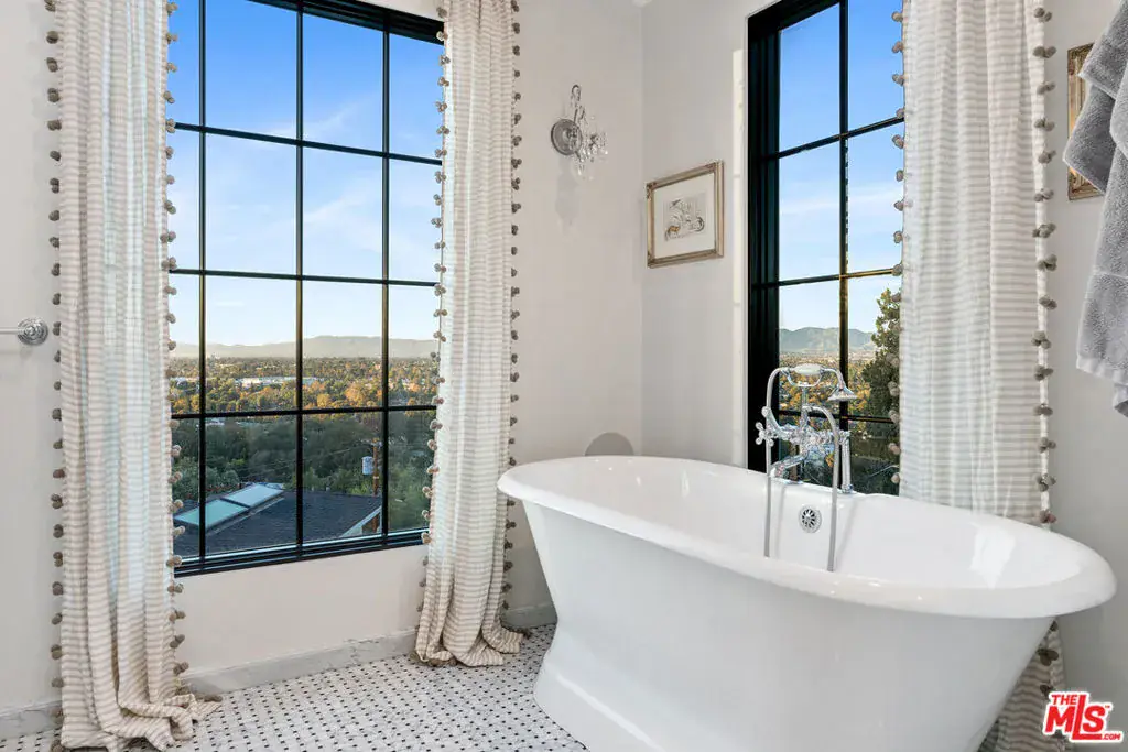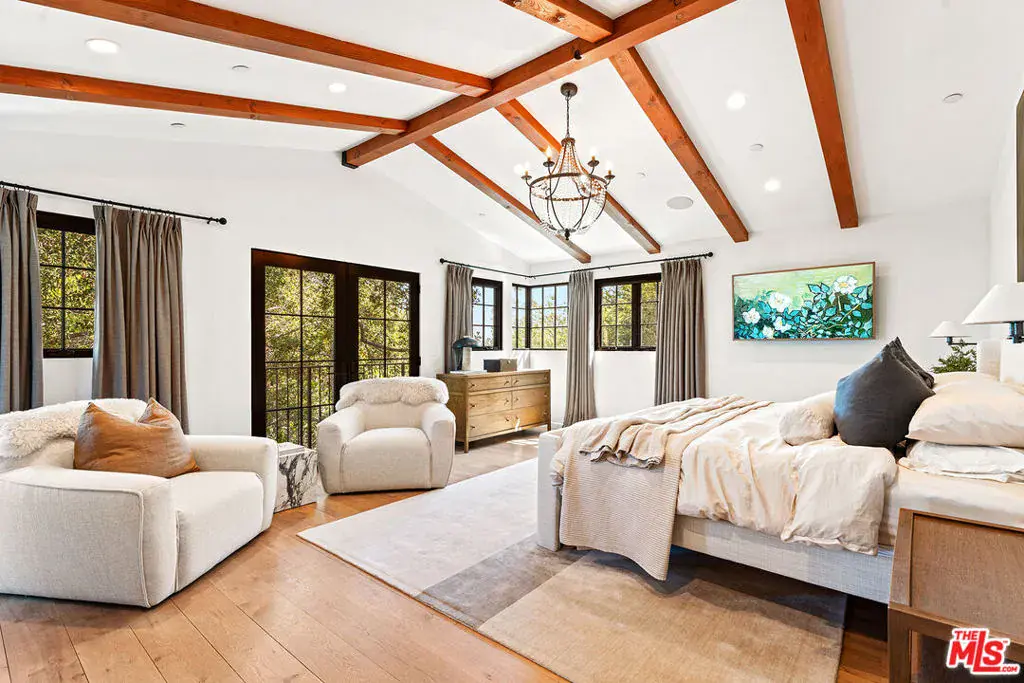 Welcome to this exquisite 2018 French Country home located in the heart of highly sought-after Studio City. Designed with exceptional craftsmanship, the home features an open floor plan with sweeping city and mountain views from nearly every room. High vaulted ceilings soar up to 25 feet in the grand great room, highlighted by exposed beams and expansive windows that flood the space with natural light. The great room flows seamlessly into the chef’s kitchen, outfitted with a La Cornue range, Wolf double oven, Subzero fridge and freezer, plus an additional refrigerator and freezer built into the oversized island, ideal for entertaining. The home offers four spacious bedrooms with vaulted ceilings, along with an optional fifth bedroom suite downstairs featuring a private entrance and ensuite bath, perfect for guests or a recreation room. The outdoor space is a rare hillside offering with a large grassy backyard, brand new saltwater pool and spa, fountain, mature trees, and lush landscaping. Three balconies include a generous entertaining deck with both east and west-facing views. Additional features include French oak hardwood floors, crystal chandeliers, Carrara marble finishes, and a spacious basement of approximately 1,000 square feet, not included in the listed square footage, and storage use. Located south of Ventura Blvd in the coveted Carpenter School District, the home is close to dining, shopping, and popular hiking trails. The renter is responsible for all utilities, pool and gardener services, fountain maintenance, and alarm monitoring and response. Renter’s insurance is required. As an added incentive, a $1,000 monthly rent concession is offered for the months of February through May with a minimum 16-month lease term.