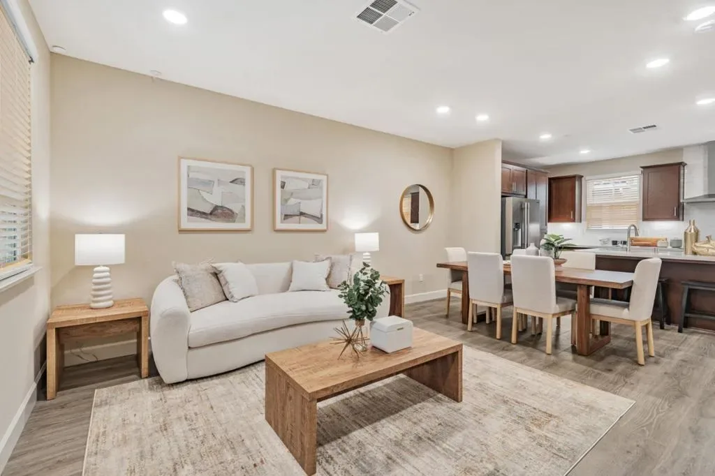 Welcome to Santorini at Sunnyvale, a beautifully appointed three-story townhome in the heart of Silicon Valley. Thoughtfully designed and filled with upgrades, this 1,582-square-foot residence offers three bedrooms, a den or office, two-and-a-half baths, a private balcony, and a two-car side-by-side garage. The open living spaces feature Mahogany Shaker cabinetry, Silestone quartz countertops, stainless steel appliances, and custom built-in media cabinetry. Additional highlights include dual-zone HVAC, smart home automation, solar prep, cordless blinds, and generous garage storage. The location offers exceptional convenience, with Googles Sunnyvale campus just across the overpass and leading tech employers such as Meta, Amazon, NVIDIA, AMD, Microsoft, and Oracle only a short drive away. Commuters enjoy quick access to Highway 237, Highway 101, and VTA transit, while being minutes from shopping, dining, and recreational amenities. Combining modern upgrades with a truly central location, this home presents an exceptional opportunity to live at the crossroads of innovation, convenience, and everyday comfort.