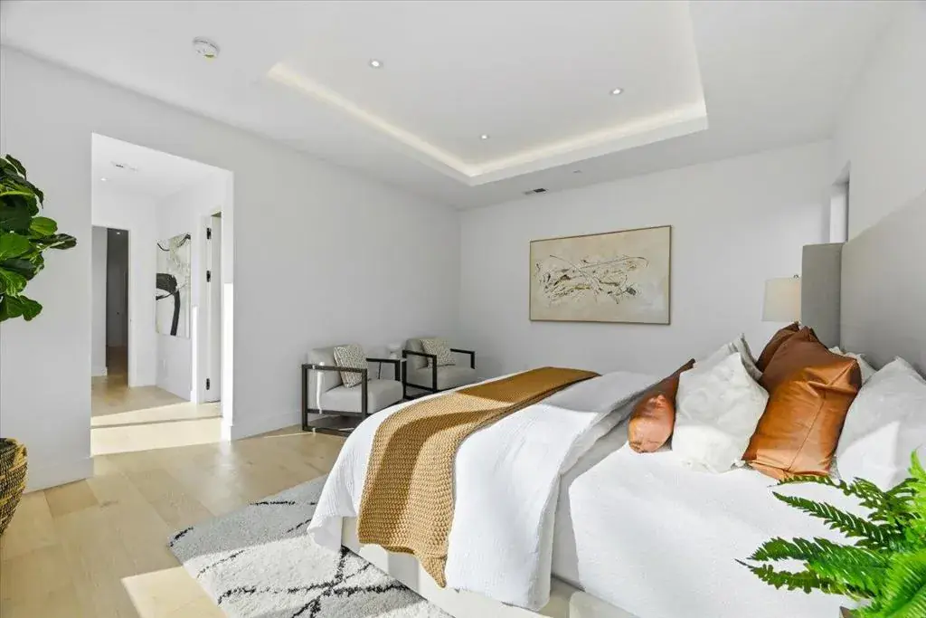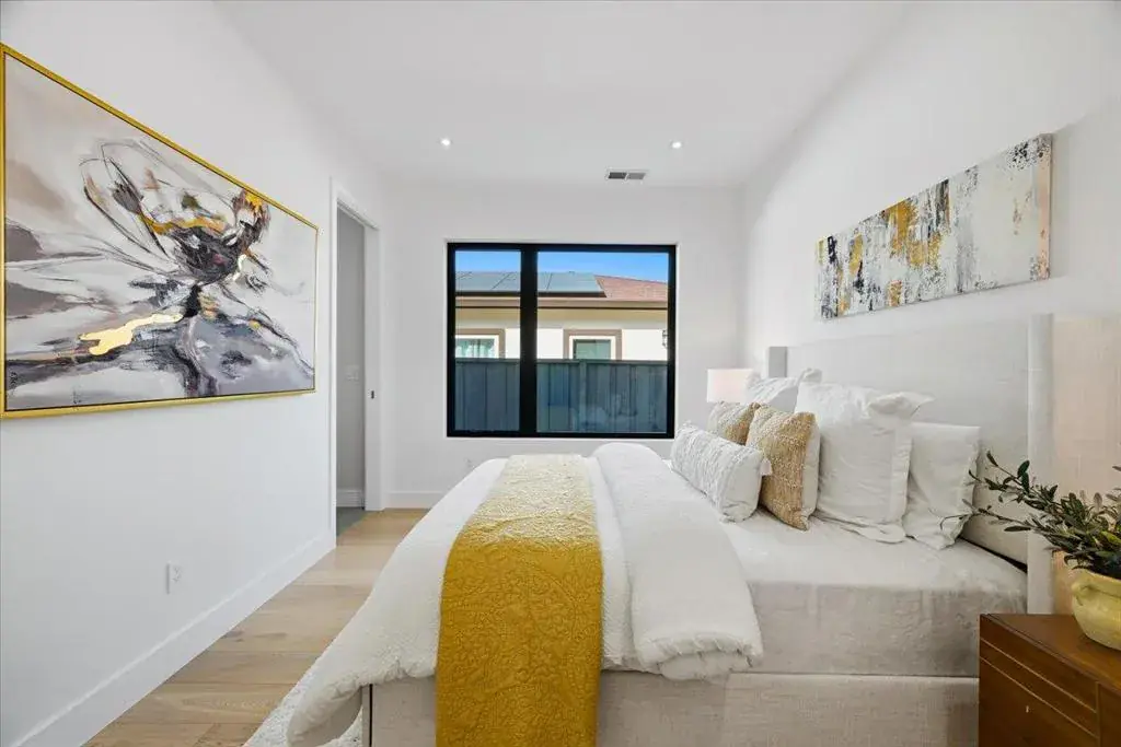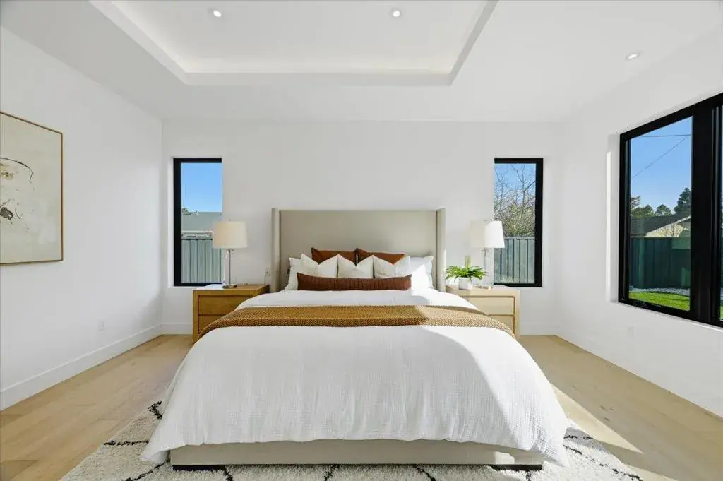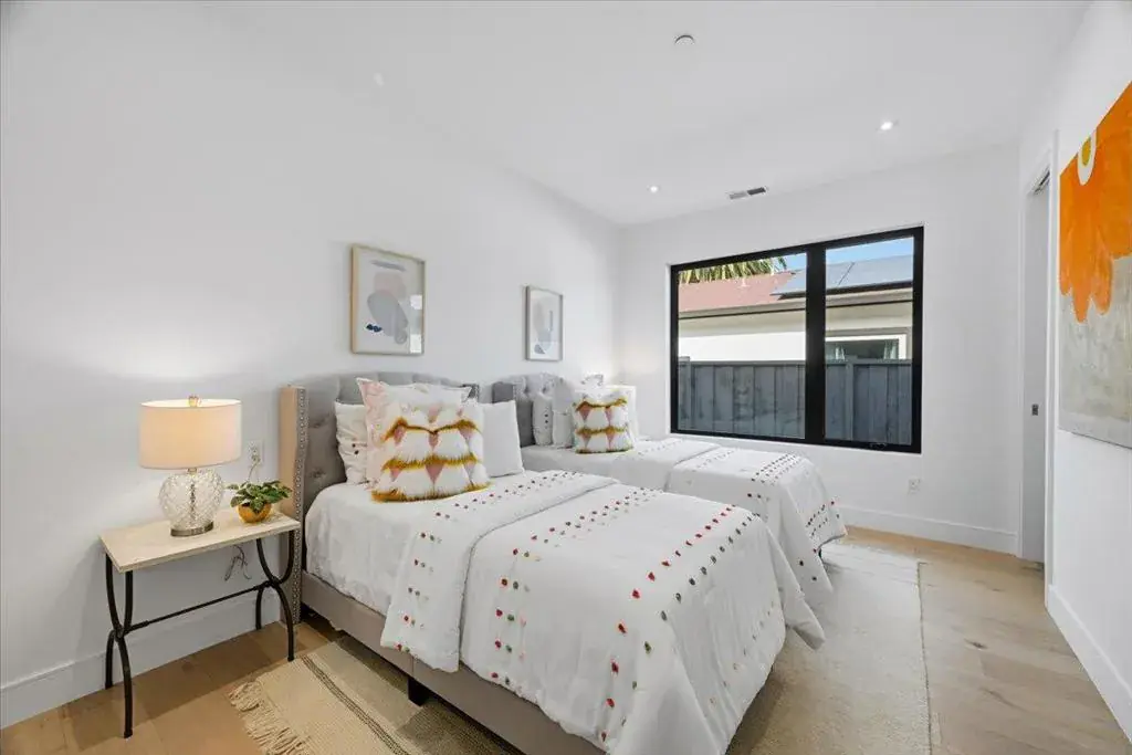 Striking modern custom home in one of Sunnyvales most desirable neighborhoods. This fully permitted custom home offers 5 bedrooms, 4.5 bathrooms, and 3,167 sq ft on a nearly 10,000 sq ft lot, rebuilt entirely with new foundation, roof, systems, and finishes throughout, including an owned solar panel system designed to power the entire property. Highlights include a bright open layout with vaulted ceilings and skylights, a La Cantina folding door for seamless indoor-outdoor living, and a chef’s kitchen featuring high-end Thermador appliances, European cabinetry, and a built-in refrigerator and a wine cooler. Premium features continue with white oak engineered flooring, Porcelanosa designer tilework, Marvin windows, and a spa-like primary suite with backyard access, plus three private guest suites. The front and backyard are thoughtfully landscaped in a garden-style setting, ideal for both relaxation and entertaining, complemented by a high-efficiency Bryant heat pump system. An exceptional opportunity combining modern design, generous lot size, and a prime Sunnyvale location.