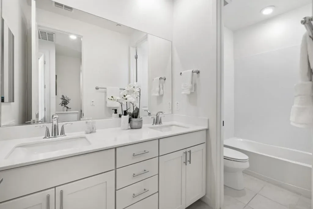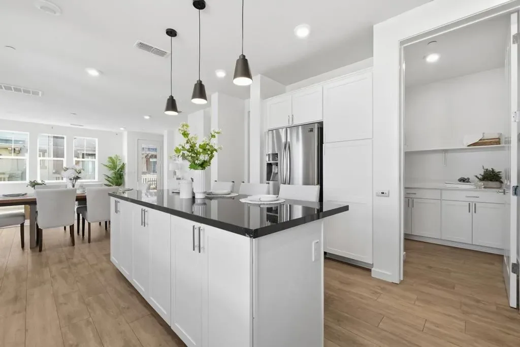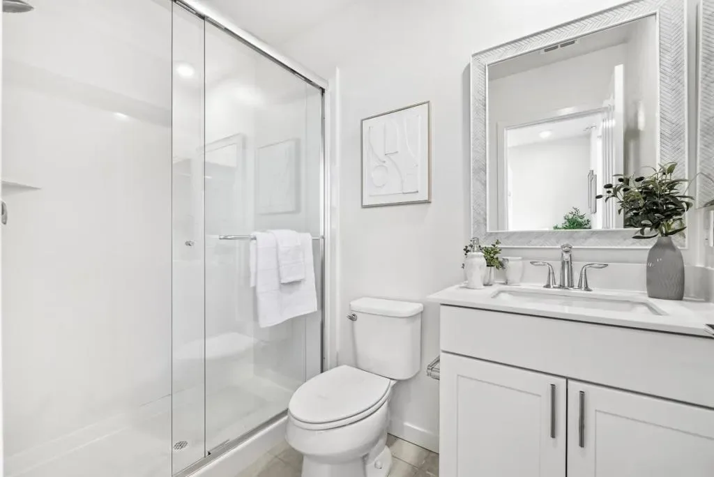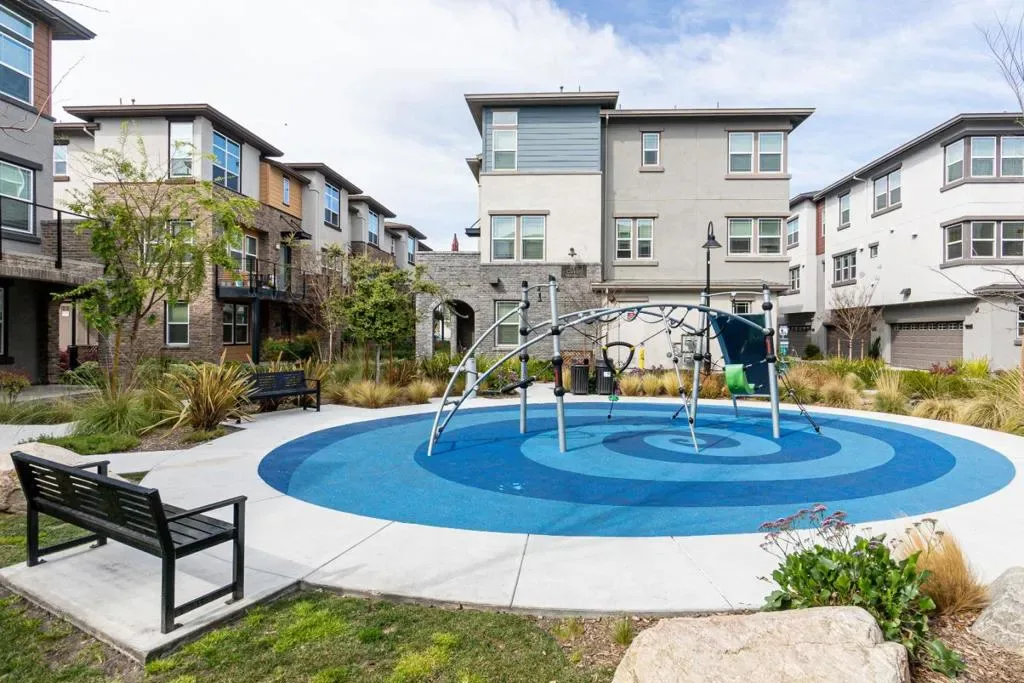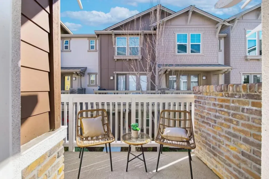 Welcome to this beautiful end-unit townhome in the sought-after The Vale community of Sunnyvale, featuring 4 beds and 3.5 baths. A front porch welcomes you in, with a ground-level suite offering large windows, a walk-in closet, and a bath with stall shower-ideal for guests or extended family. The second level showcases an open floor plan with a spacious living room, dining area, and kitchen, enhanced by abundant natural light from large windows. Enjoy outdoor relaxation on the private balcony. The modern kitchen features a large island with pendant lighting, quartz countertops, stylish tile backsplash, stainless steel appliances, and ample white cabinetry. A laundry room and half bath on this level add convenience. The third level hosts the primary suite with high ceilings, bright windows, and a walk-in closet. The en-suite bath includes a double vanity with quartz countertops and a stall shower. Two additional bedrooms share a hallway bath with double vanity and shower over tub. Additional highlights include an attached two-car garage. The Vale community offers parks, playgrounds, and a clubhouse. Conveniently located near major tech companies, restaurants, shopping, groceries, and with easy access to Highways 101, 237, and Lawrence Exwy. Do not miss this great opportunity!