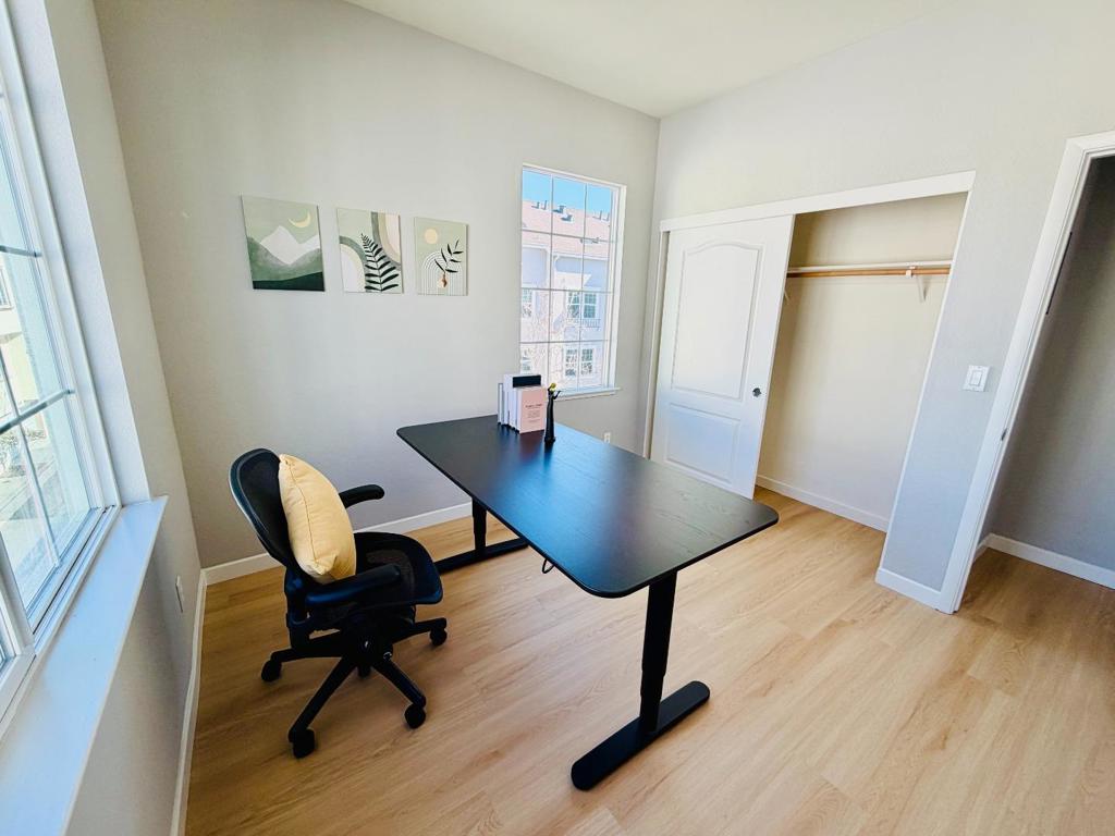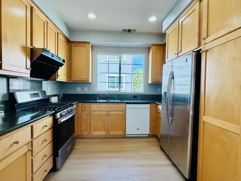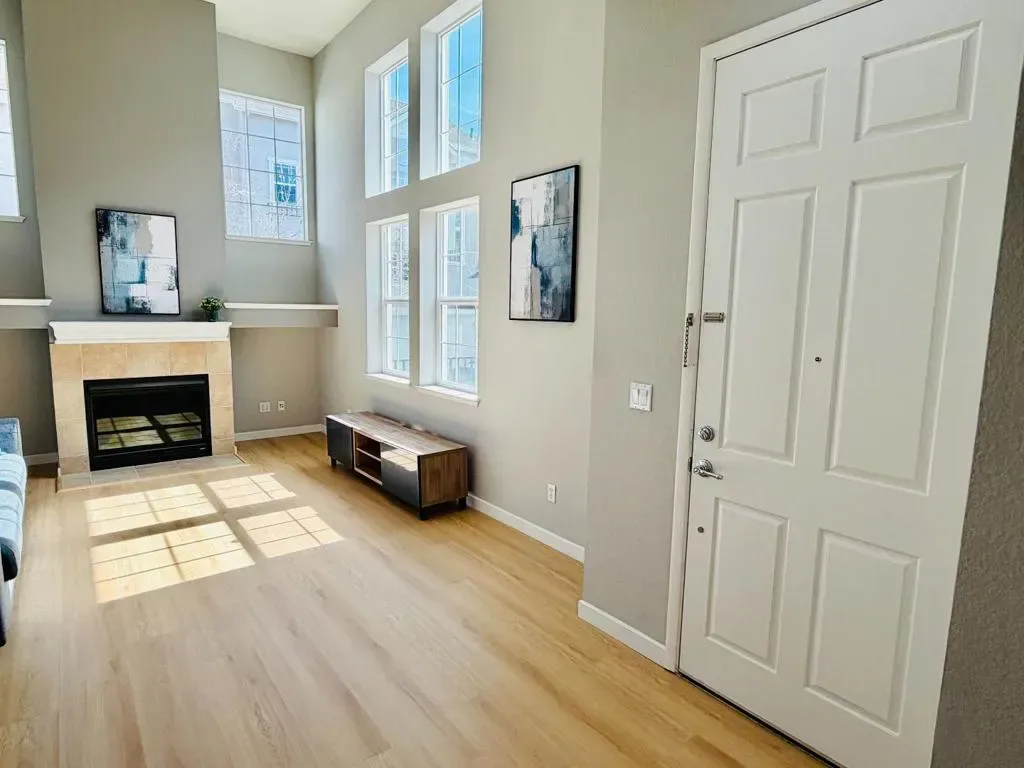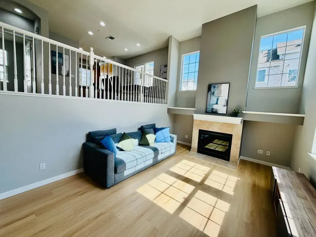 Welcome to this rare, sun-drenched end-unit townhome in Sunnyvales highly sought-after Danbury Place, offering 4 bedrooms, 3 bathrooms, and 1,727 sq. ft. of elegantly updated living space. Bathed in natural light from extra East-facing windows, the home boasts a spectacular South-facing living room featuring soaring vaulted ceilings, a cozy fireplace, and massive two-story windows. Enjoy turn-key perfection with brand-new flooring flowing seamlessly throughout the open-concept layout, as well as a freshly finished epoxy floor in the attached two-car garage. The radiant, South-facing primary suite serves as a private retreat complete with a spa-like en-suite bathroom featuring dual vanities and a large soaking tub. With access to a sparkling community swimming pool and an unbeatable Silicon Valley location just minutes from the Google Campus, Seven Seas Park, major tech shuttles, and highways, this home perfectly blends modern luxury with ultimate convenience.