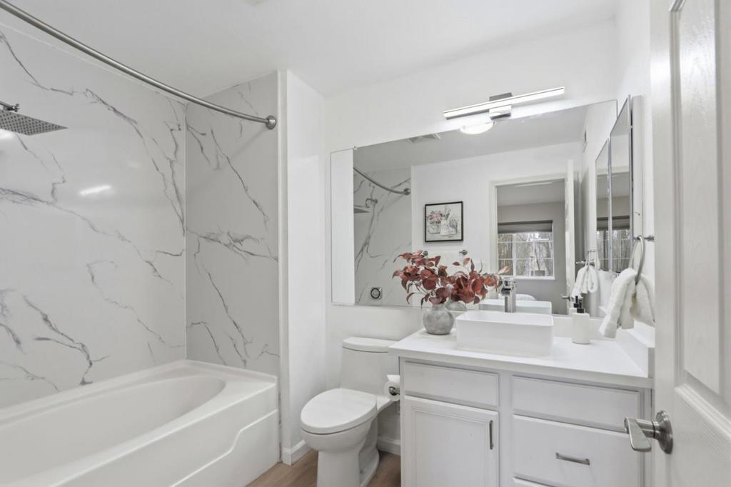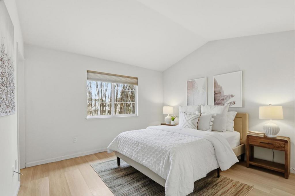 Bright top-floor corner unit in Arcadia Terrace, offering a quiet interior location and abundant natural light. This 3-bedroom, 2-bath condo features approximately 1,300 sq ft with soaring vaulted ceilings, a tiled fireplace, and updated wood-look vinyl plank flooring throughout. The primary suite includes a walk-in closet and refreshed bathroom. The kitchen offers stainless steel appliances, including a newer dishwasher, Corina countertops, and refinished cabinetry. Sliding doors open to a private patio with peaceful treetop views. Additional features include smart home enhancements, a private garage with automatic opener, and one assigned parking space. Community amenities include a pool, play area, gazebo, and HOA covers water and trash. Conveniently located near major tech employers, shopping, dining, and with easy access to Highways 101, 237, and Central Expressway.