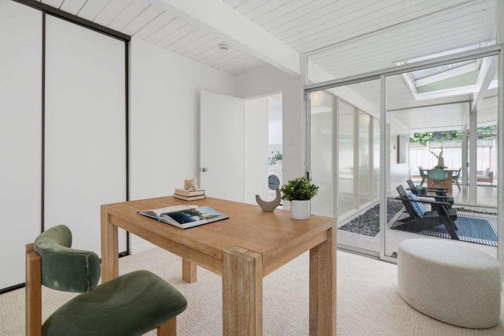 Beautifully updated 4-bedroom Eichler in one of Sunnyvale’s most sought-after neighborhoods. A signature central atrium floods the home with natural light, creating a seamless indoor-outdoor connection that’s quintessentially California Eichler. The spacious living room anchors the space with a fireplace and a wall of windows framing the backyard, while the upgraded kitchen opens into the family room and out to a private patio surrounded by a lush California coastal garden – ideal for alfresco dining, weekend gatherings, or simply unwinding under the open sky. Moments away from Las Palmas Park and the Sunnyvale Community Center, you’ll have easy access to green spaces, playgrounds, and community amenities. Downtown Sunnyvale and Murphy Avenue are just minutes away, with quick access to Highways 280 and 85 for an effortless commute. Top-rated schools nearby include Cumberland Elementary, Sunnyvale Middle, and Fremont High School (buyer to verify).