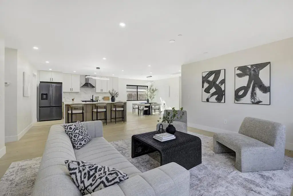 Stunning brand-new construction completed in 2026, thoughtfully built from the ground up with exceptional craftsmanship and modern design. This expansive home offers 6 bedrooms and 5 bathrooms, featuring soaring 12-foot ceilings living room, sleek black-framed windows, and engineered hardwood flooring throughout. The open-concept layout showcases a spacious family room seamlessly connected to the gourmet kitchen, highlighted by a massive waterfall island, quartz countertops, stylish white oak cabinetry, abundant storage, and high-end stainless steel appliancesperfect for both daily living and entertaining. The main level includes a luxurious primary suite with backyard access, a large walk-in closet, and a spa-inspired bathroom with soaking tub and curbless shower, along with two additional bedrooms and two full bathrooms. Upstairs features a private junior suite, two more bedrooms, and another full bathroom, offering flexible living options. A dedicated laundry room with cabinetry adds convenience. Completing this exceptional property is a detached two-car garage and a well-designed floor plan that blends modern elegance, comfort, and functionality for todays lifestyle.
