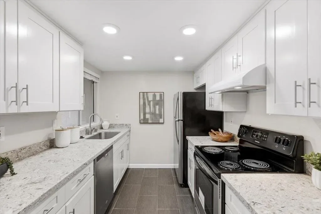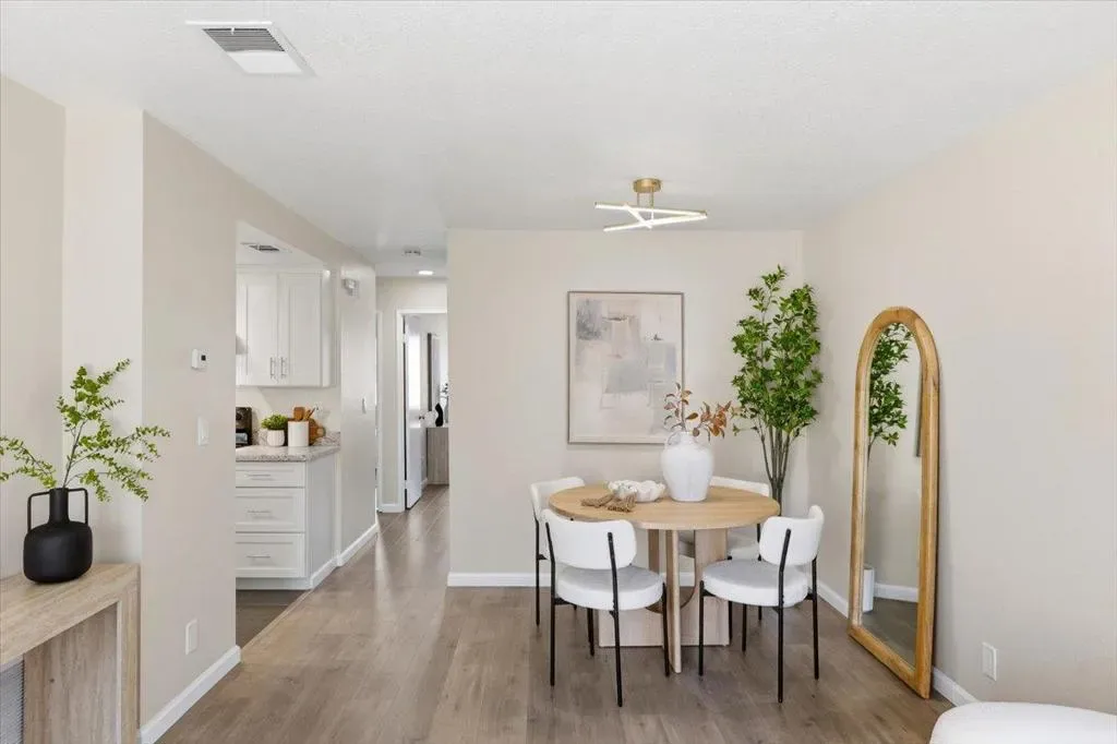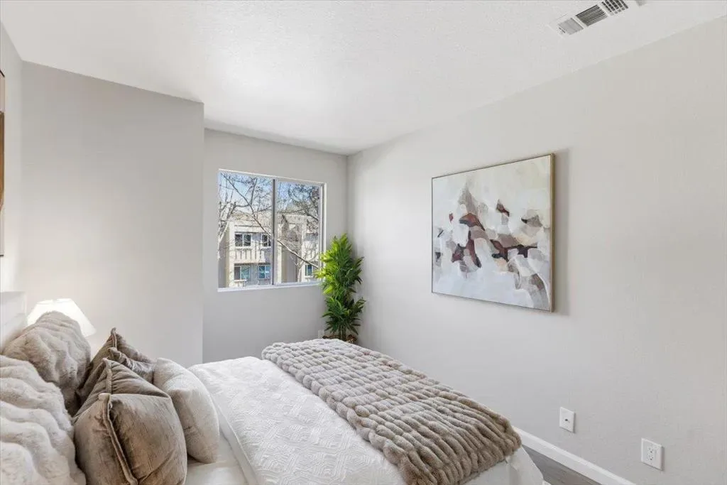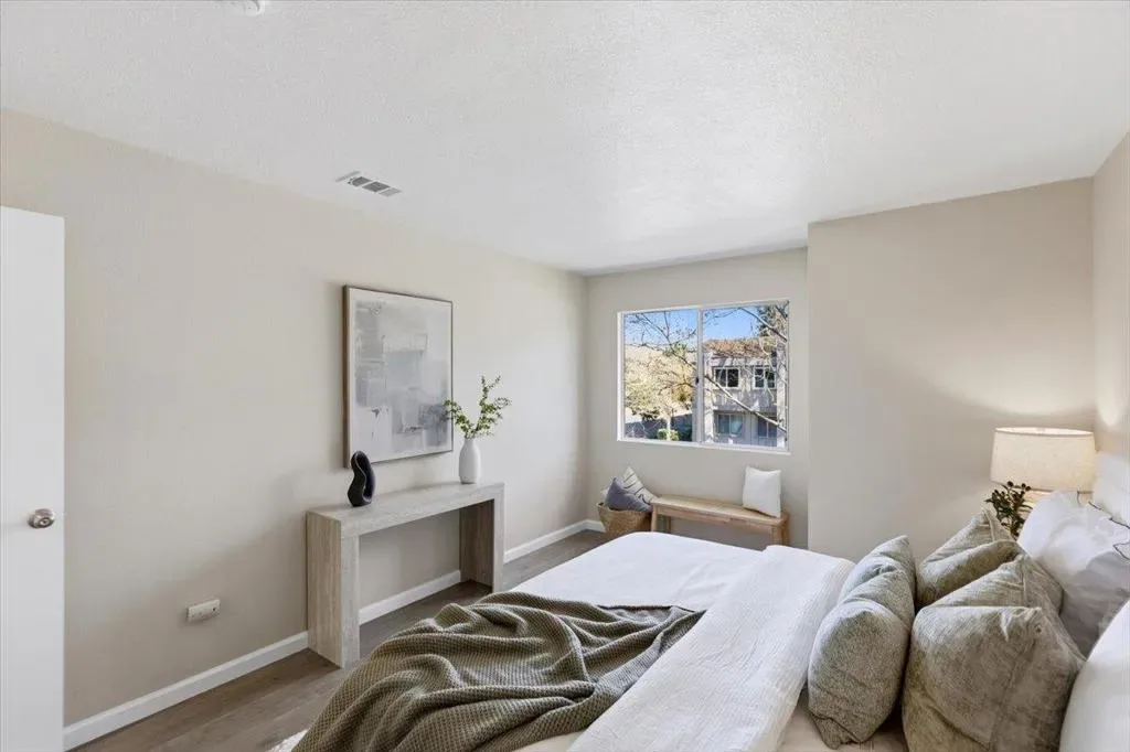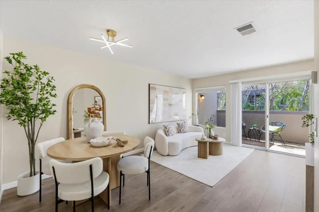 Welcome to this well maintained top floor 2 bedroom, 1.5 bath home tucked inside a quiet location within the community in the heart of Sunnyvale. Offering approximately 785 sqft of living space, it combines convenience with a bright and inviting atmosphere. The home features SPC flooring and abundant natural light throughout. The living room flows seamlessly into the dining area, creating a functional layout ideal for both everyday living and casual gatherings. The kitchen is equipped with customized cabinetry, granite countertops, and SS appliances, offering both style and practicality. It includes two spacious bedrooms along with a full bathroom and a half bathroom, providing comfortable living spaces. A large private balcony offers a relaxing outdoor area, perfect for enjoying fresh air. Both bathrooms have been updated with modern mirrors and vanity lighting. Additional improvements include a new water heater and furnace installed in 2020, adding comfort and energy efficiency. Conveniently located minutes from Downtown Sunnyvale, Caltrain, major freeways (101, 237), and major tech campuses including Apple, Nvidia and Google, it offers excellent access to shopping, dining, and parks. The HOA covers water, garbage, earthquake insurance, and other community maintenance.