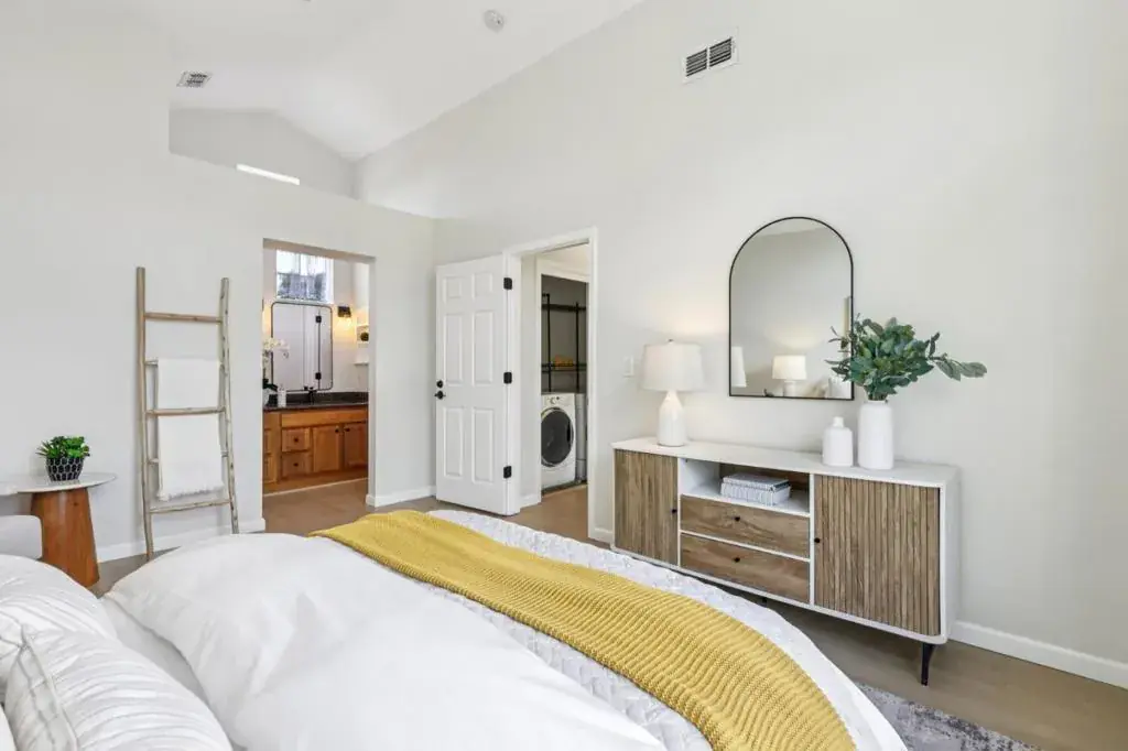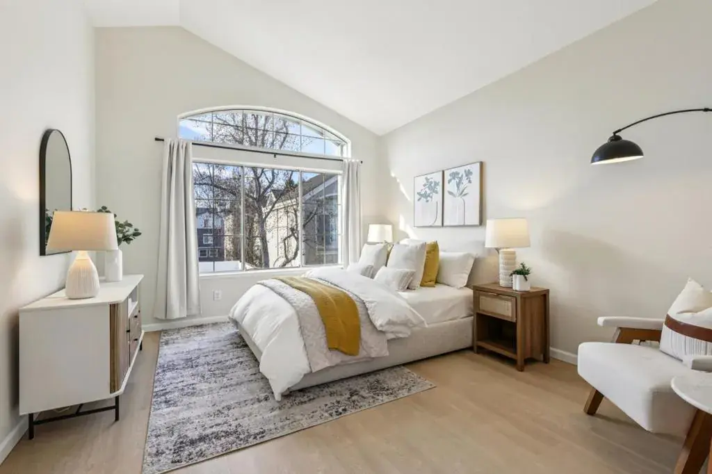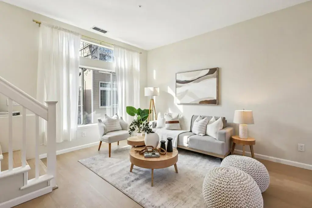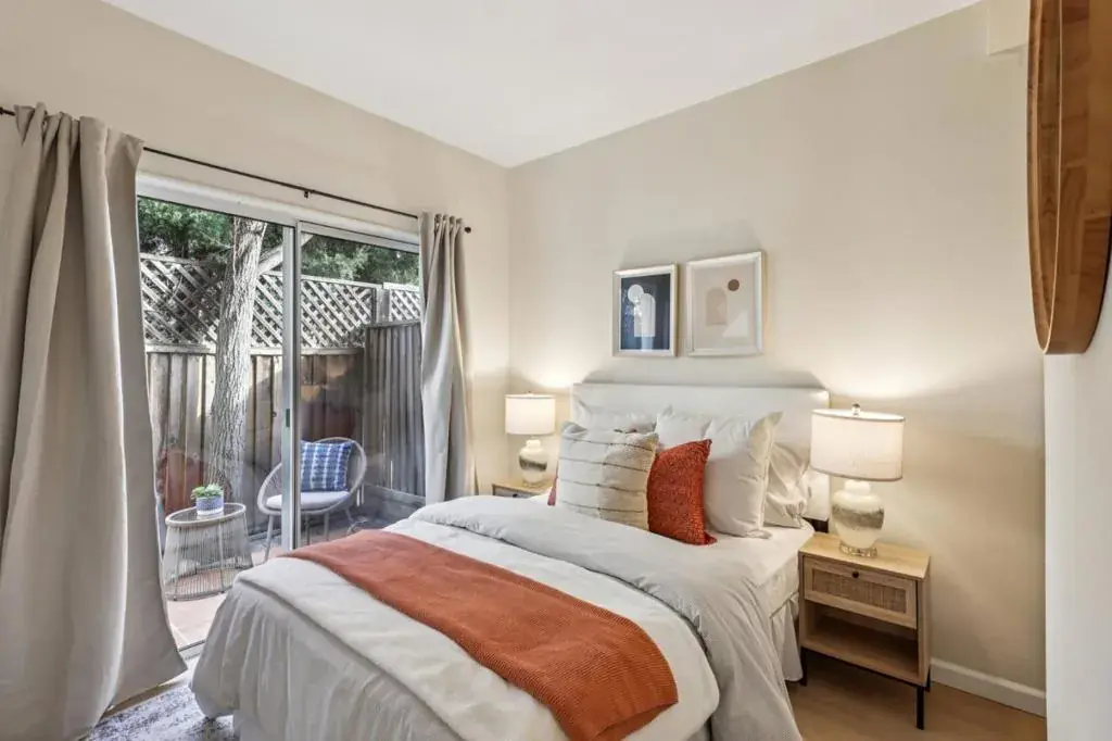 Welcome to 979 Pinto Palm Ter, Unit 45, Sunnyvale! Conveniently located near Silicon Valley’s high tech companies such as Apple, Google, Nvidia, and nestled between Mountain View, Los Altos, Cupertino, and Santa Clara. This sunny and beautiful 2 bedroom, 2 bath home in a planned unit development (PUD) features high ceilings and tall windows. Filled with natural light throughout, this home is conveniently located close to shops, restaurants, Sunken Gardens Golf Course, Ponderosa Park, and commute routes. The open concept living room flows seamlessly into the dining room, kitchen, and balcony. The lower level includes a bedroom, full bath, access to the back patio area, and garage. The upper level is the primary bedroom suite with a walk-in closet and full bath, and laundry closet with a full size washer and dryer. Amenities include luxury vinyl plank floors, recessed lighting, dual-pane windows, central air conditioning, stainless steel appliances, and much more! The 1-car garage has plenty of space and a closet for extra storage.