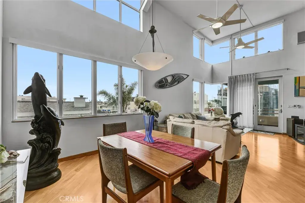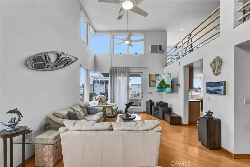 The elevated loft space overlooks the living area and offers stunning ocean views of Palos Verdes and Catalina Island. The primary suite boasts a private balcony, a spa-like ensuite bathroom with a soaking Jacuzzi tub, dual sinks, and an enclosed shower. A second bedroom includes its own private bathroom. The home is elegantly appointed with maple hardwood flooring throughout and new carpeting in the bedrooms.