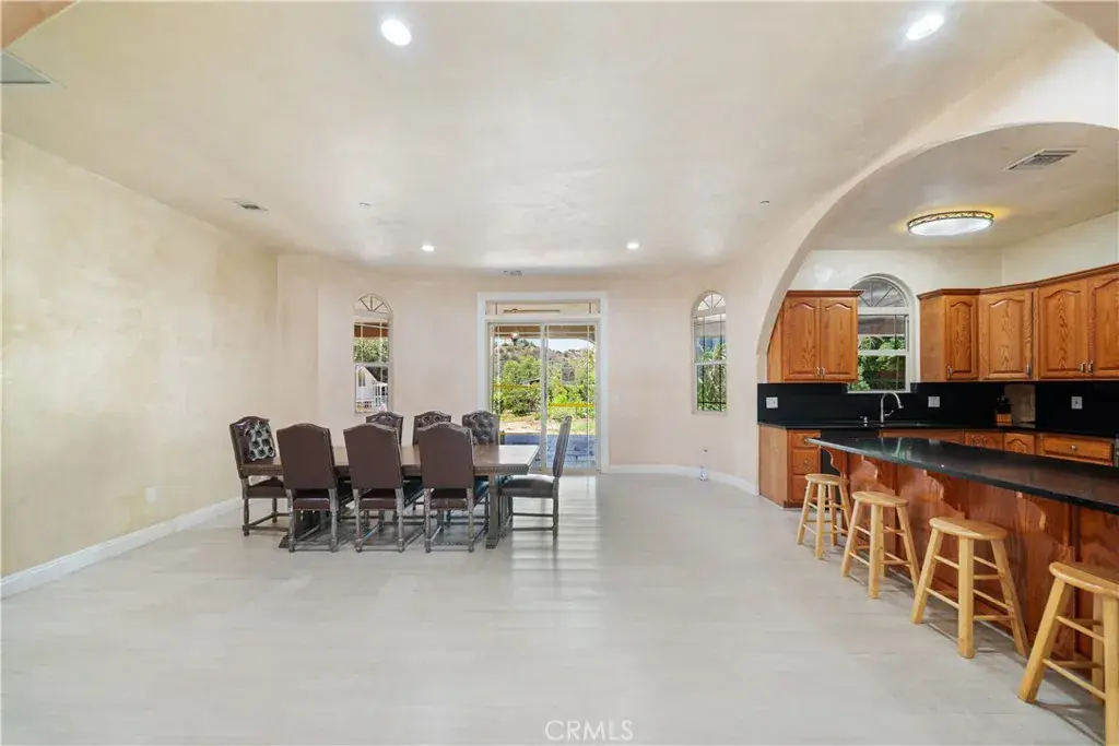 The kitchen overlooks the dining area and features granite countertops, stainless steel appliances, ample cabinet storage, and an island with seating for guests. Just steps away, the massive covered patio nearly wraps around the entire home, creating a perfect space for outdoor dining and entertaining with sweeping mountain and property views.