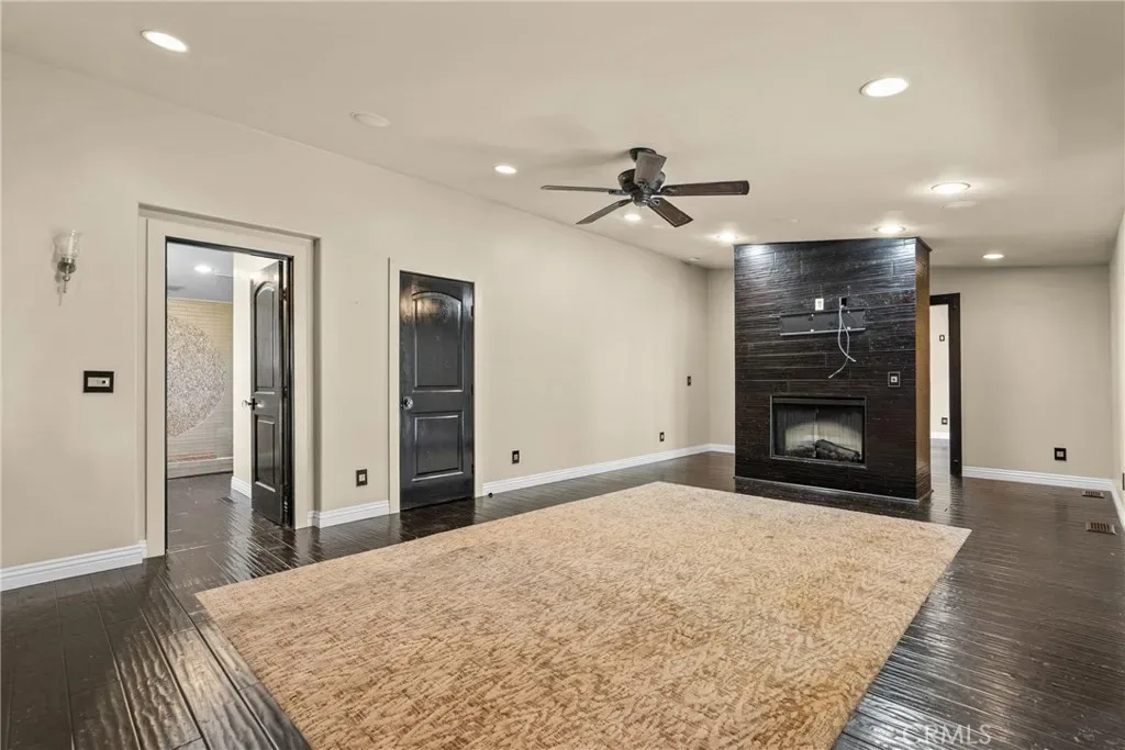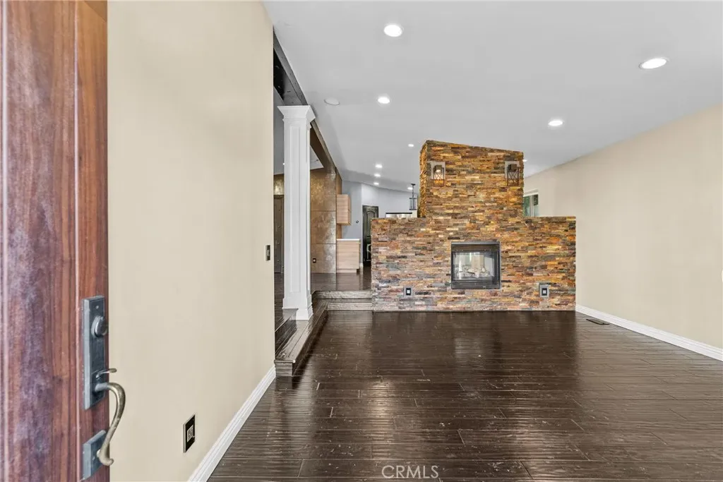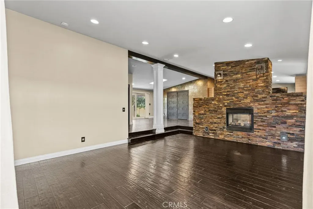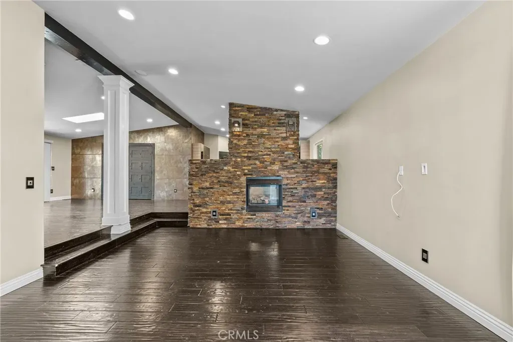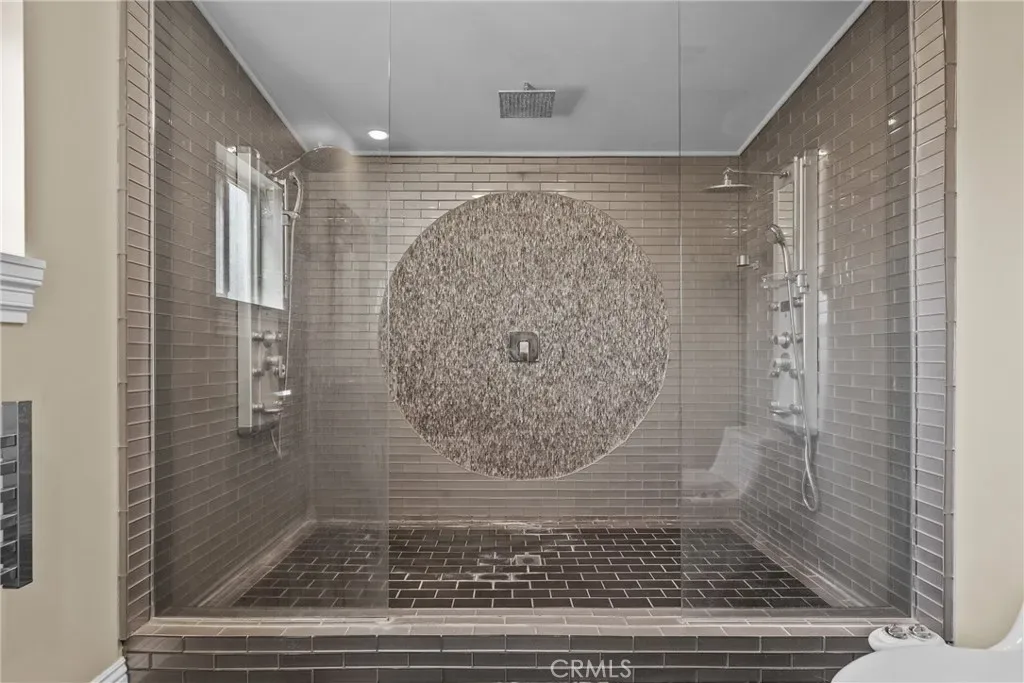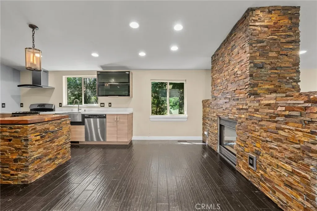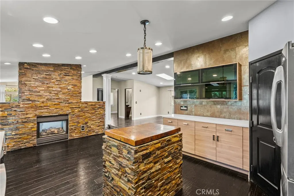 The kitchen offers stone countertops, a farmhouse sink, and a natural wood island with inlaid stone and subtle underlighting. The primary suite includes double doors, a fireplace, walk-in closet, and a spa-like bath with a double massage shower and heated towel rack.