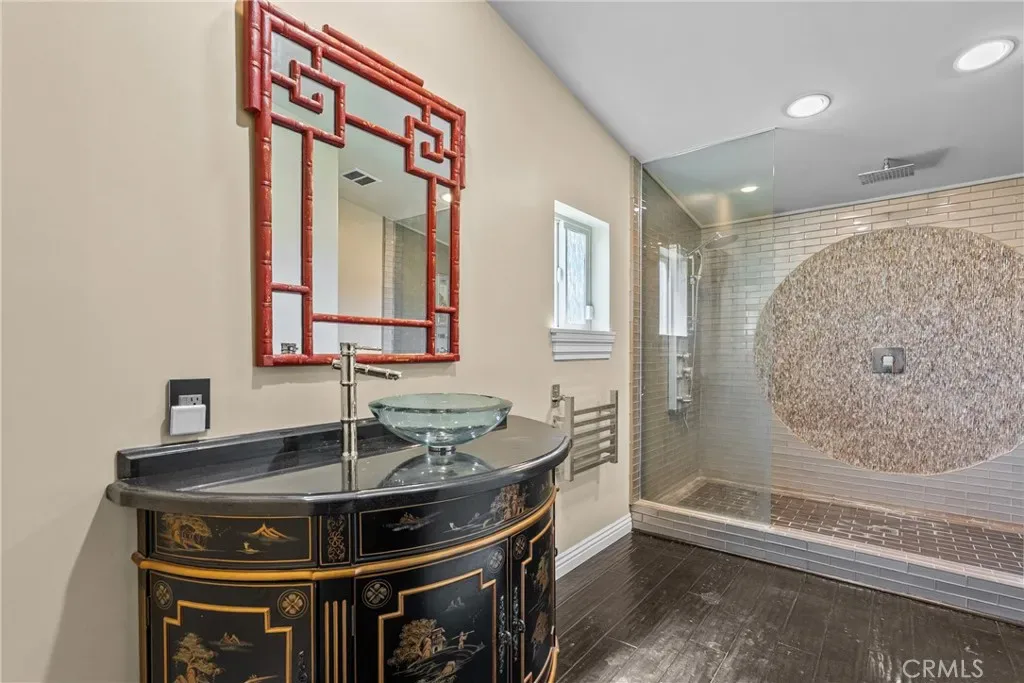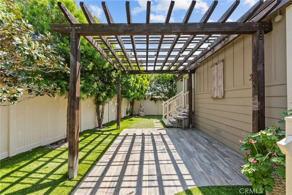 Additional highlights include a designer powder room (convertible to full bath), upgraded lighting, and a Zen-inspired backyard with wood-look tile, artificial turf, and mature trees—perfect for relaxing or entertaining.