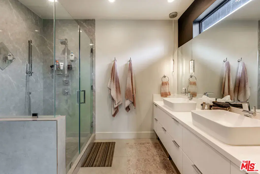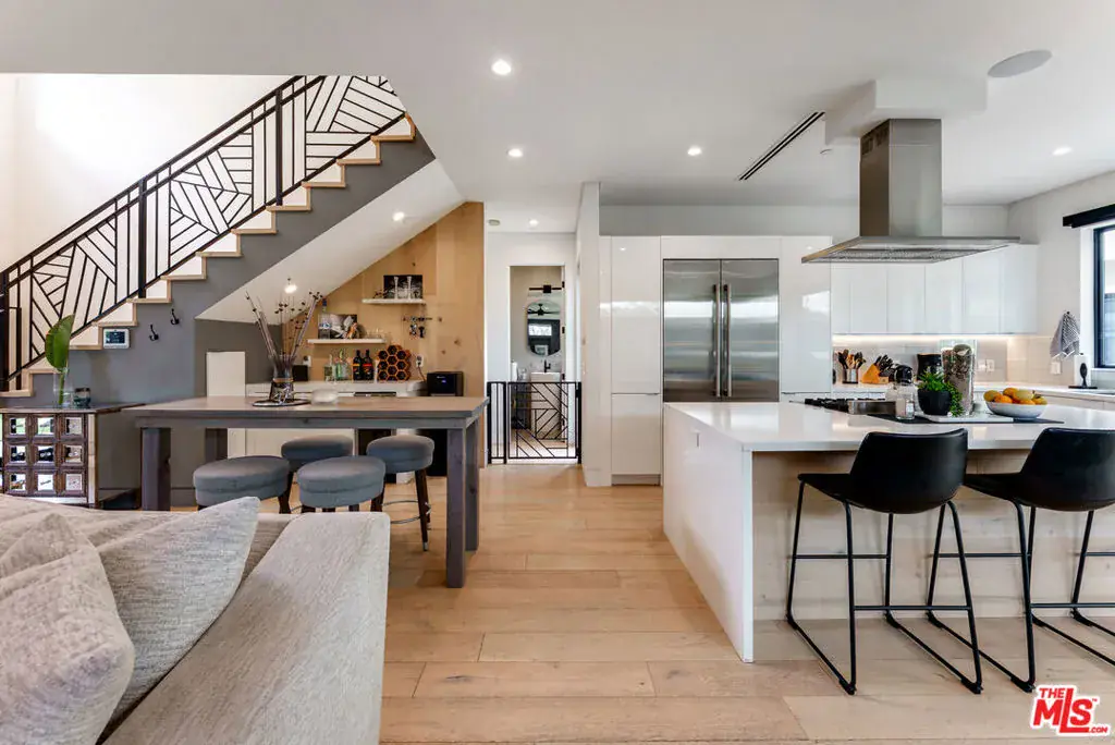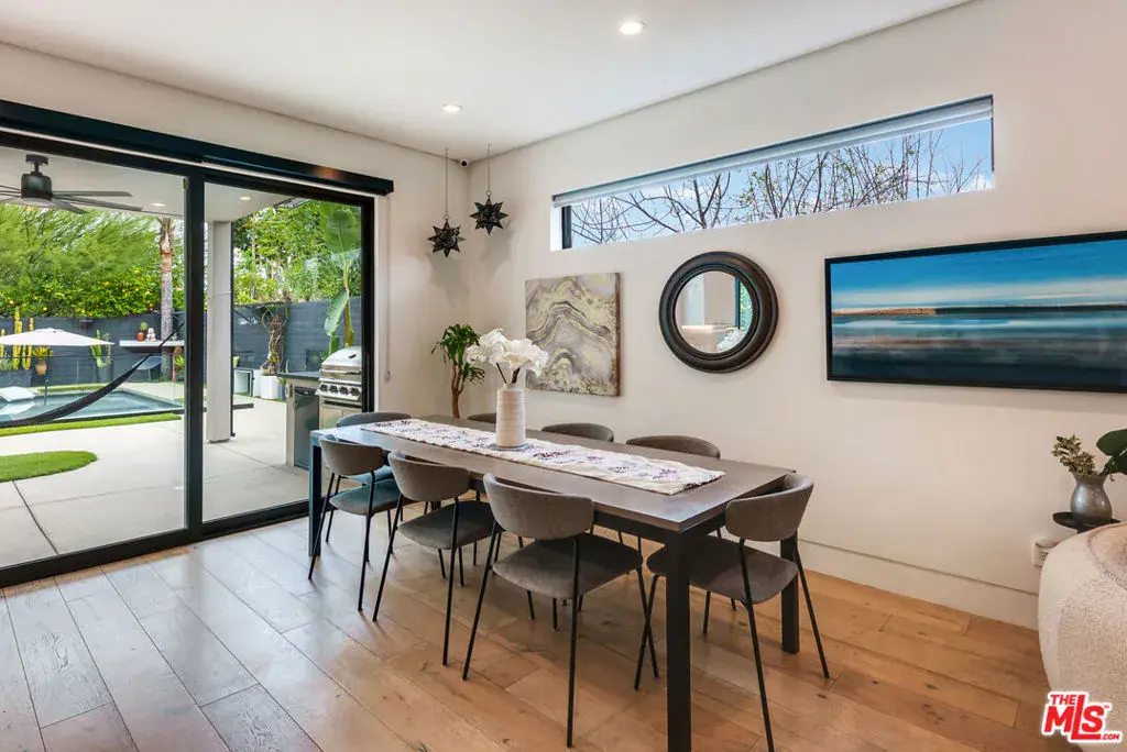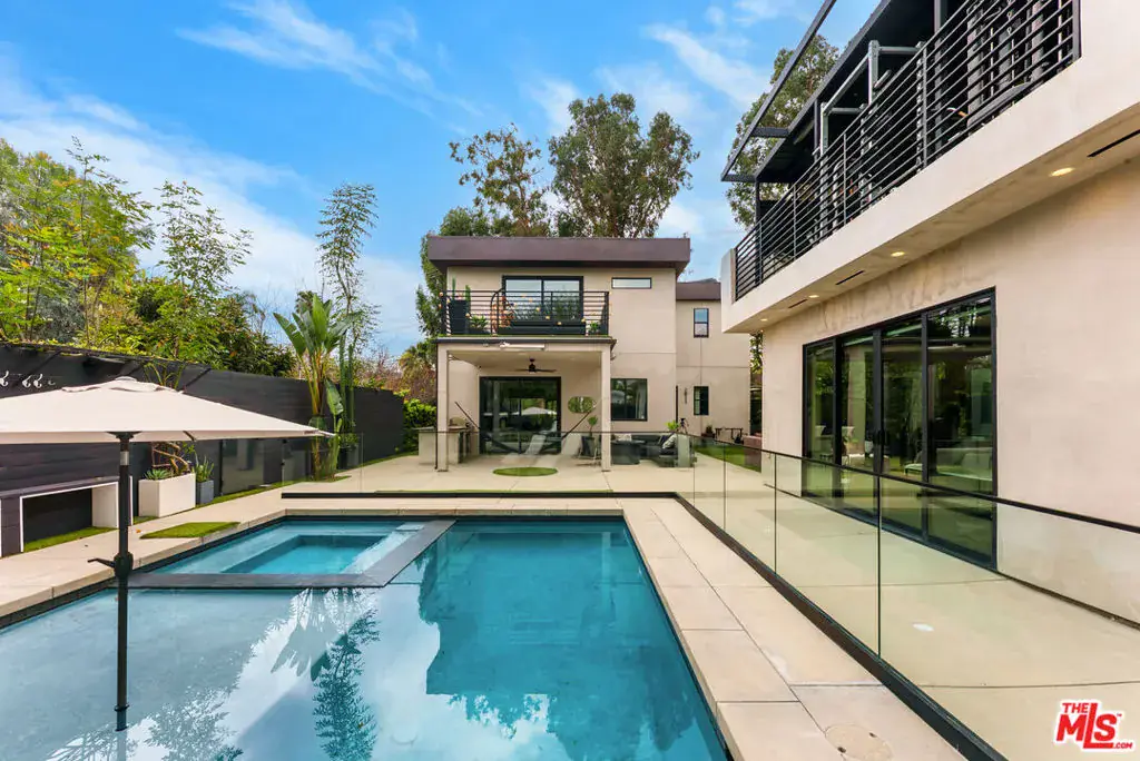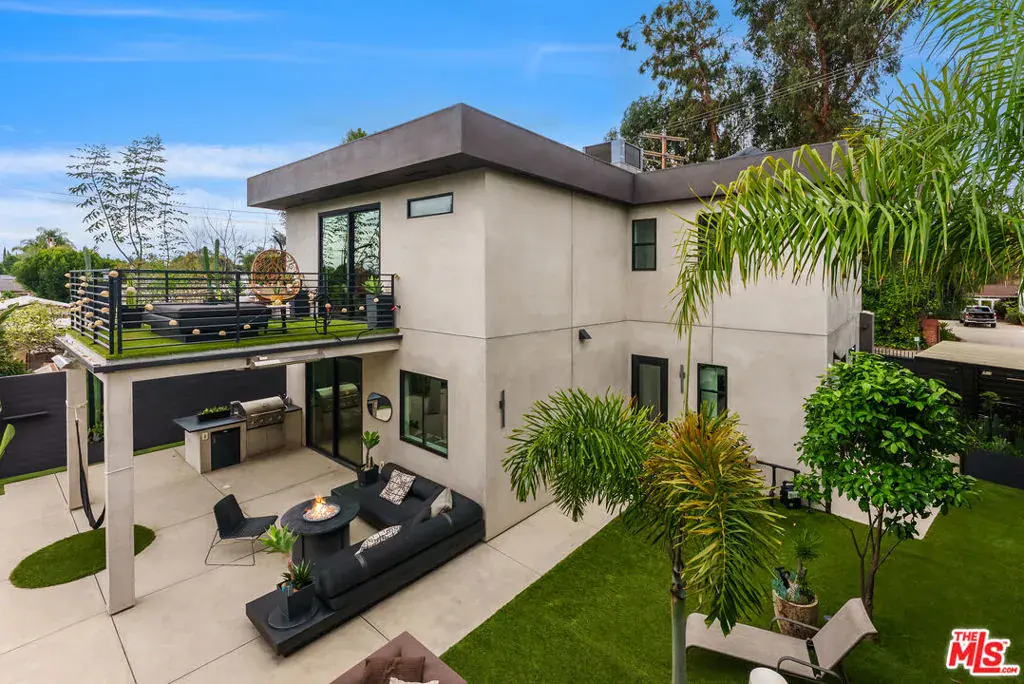 Stunningly updated and fully furnished, this gated South-of-the-Boulevard two-story residence blends modern design with elevated comfort complete with a separate pool/guest house and a show-stopping rooftop gym. Thoughtfully remodeled with exceptional attention to detail, the home offers a bright, open-concept layout where the spacious dining area flows effortlessly into a refined living room featuring a custom-built bar – perfect for entertaining. The sleek chef’s kitchen is outfitted with premium appliances, designer finishes, and an oversized center island with seating. Wide-plank oak flooring runs throughout, enhancing the home’s calm, contemporary aesthetic. A main-level bedroom with private side-yard access makes an ideal office, guest suite, or client-friendly workspace. Upstairs, the primary suite feels like a retreat, featuring dual walk-in closets, a generous balcony with scenic views, and a spa-inspired bath with double vanities, an oversized shower, and stylish barn-door detailing. Two additional en-suite bedrooms, a shared balcony, and a dedicated laundry area complete the second floor. The detached pool/guest house (converted from the original garage) includes a full kitchen with full-size refrigerator, comfortable living space, and a bath with direct pool access. The outdoor spaces are equally impressive. A private, landscaped front yard welcomes you behind secure gates, while the entertainer’s backyard features a sparkling pool and spa, built-in BBQ, fire pit, and multiple lounge areas that truly shine in the evening hours. Smart home features add convenience throughout. Just moments from Ventura Blvd.’s shops and dining, with easy access to the 101 Freeway, this exceptional property delivers privacy, style, and convenience in one beautifully curated package. No smoking. Pets negotiable. Total square footage includes the guest house. No garage on site; ample street parking available.