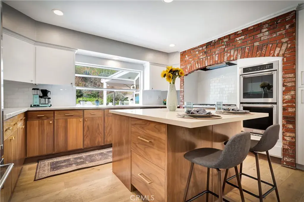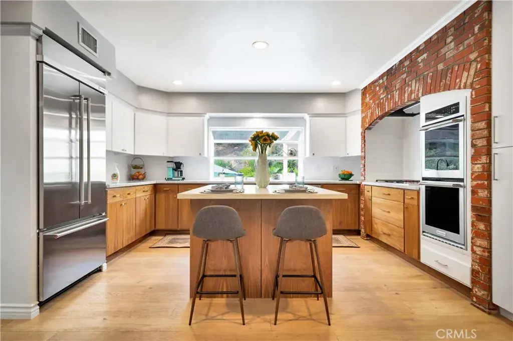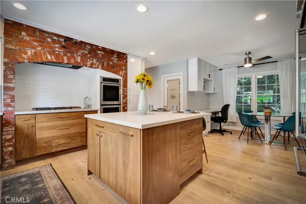 The renovated kitchen is a standout feature, showcasing premium finishes and smart design. Highlights include custom cabinetry, a spacious island with bar seating, a Wolf cooktop, solid-surface counters, and distinctive brick detailing for added character. A cozy breakfast area with a built-in workstation and an oversized walk-in pantry provide both charm and functionality. Hardwood flooring extends throughout the home, while exposed beam ceilings in the great room, dining area, and primary suite enhance the sense of space and architectural interest. The central living area is warm and inviting, anchored by a fireplace and illuminated by overhead skylights that fill the room with daylight.