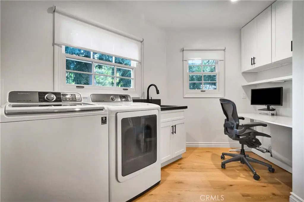 A spacious laundry room includes a dedicated office nook, ideal for remote work or household organization. The attached two-car garage offers practical storage and convenience.