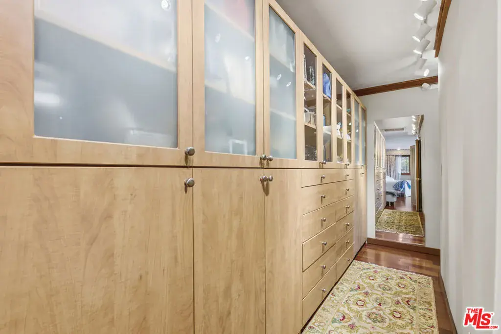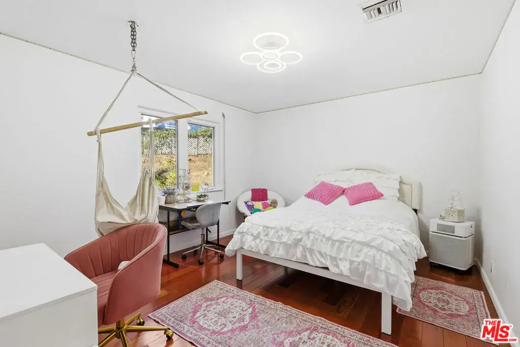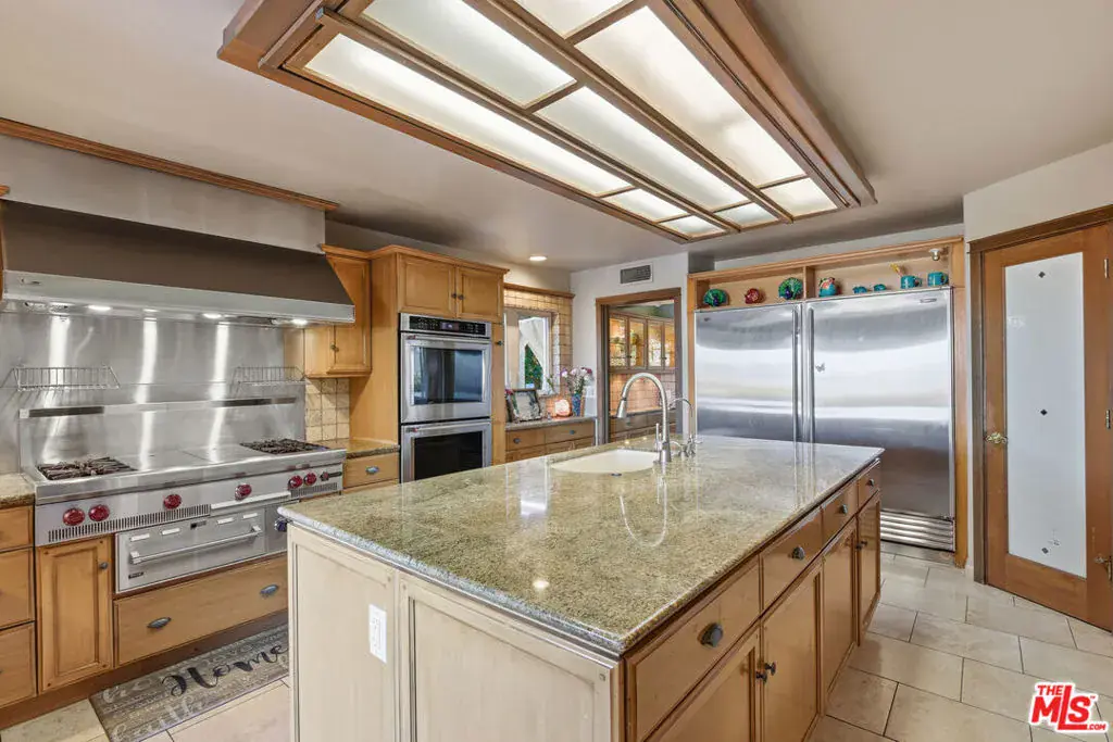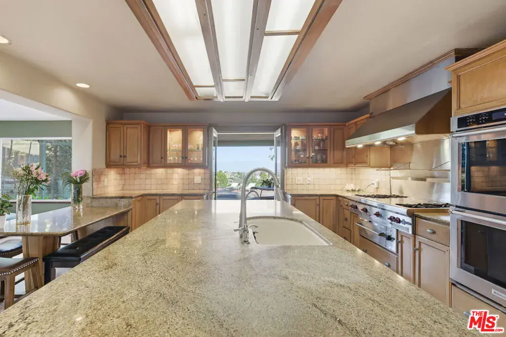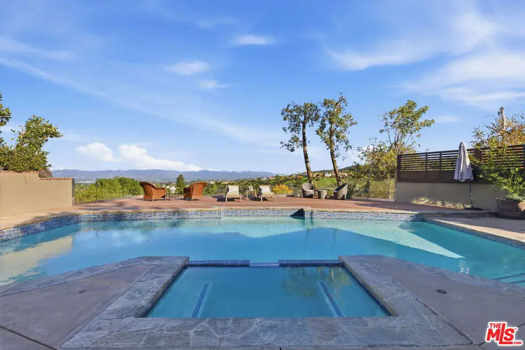 Spectacular panoramic mountain and valley views frame this exquisite two-story contemporary Craftsman, perched high in the hills above Mulholland Hills Country Club. Designed for both comfort and elevated living, the home offers a thoughtful floor plan with exceptional indoor-outdoor flow, abundant natural light, and modern upgrades throughout. The main level features a private bedroom with a dual-access shared bathroom opening to the living area, plus a convenient powder room near the entry. A dedicated office just off the entrance showcases front-facing street views ideal for working from home. At the heart of the home is the chef’s kitchen, complete with a walk-in pantry and Sub Zero refrigerator, seamlessly connected to the dining area both enjoying sweeping mountain and valley views. Skylights throughout the home flood the interiors with natural light, creating bright, airy living spaces from morning to evening. Upstairs, you’ll find three generously sized en suite bedrooms, and a dedicated laundry room. The luxurious primary suite is a true retreat, featuring a sitting area, spa-inspired soaking tub, expansive walk-in closet, and custom built-in cabinetry. The home is equipped with two brand-new AC systems, a full security system with cameras throughout, a whole-house saltwater filtration system and built-in automatic blinds. Outdoors, the expansive backyard offers incredible space to relax, entertain, or soak in the sun while taking in the breathtaking panoramic views across the mountains and valley below. The saltwater pool includes a heater for year-round enjoyment. A rare opportunity to experience elevated luxury living with unforgettable views in one of Tarzana South’s most coveted hillside locations.