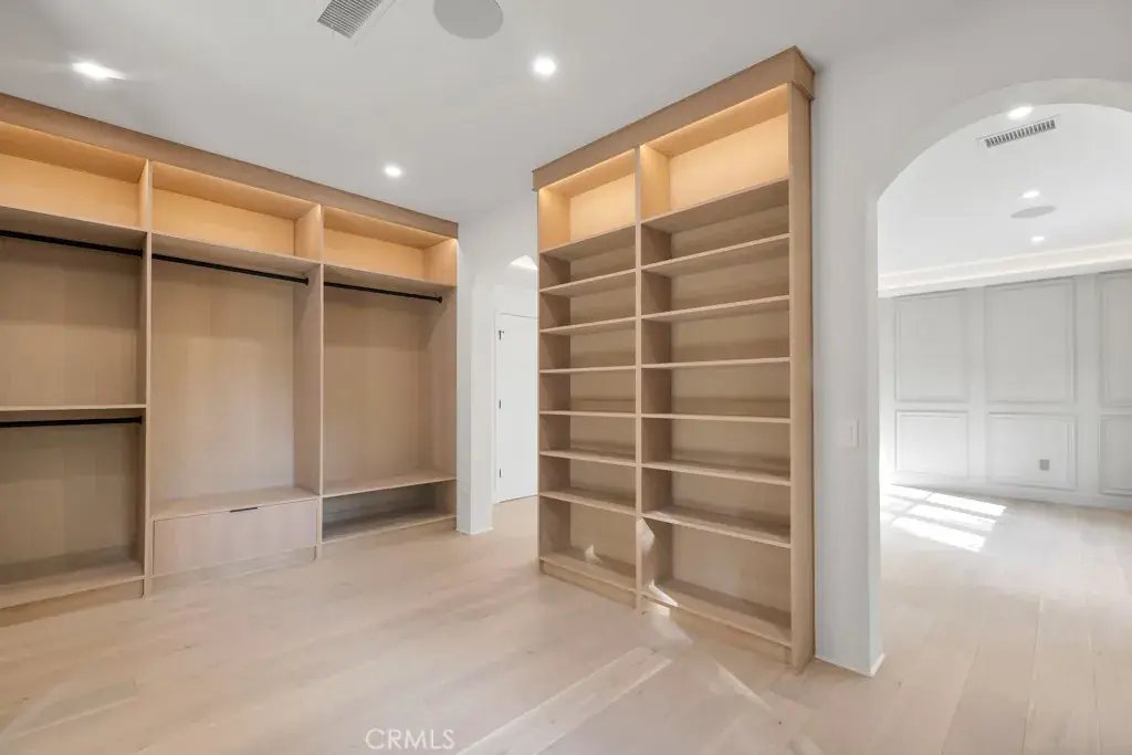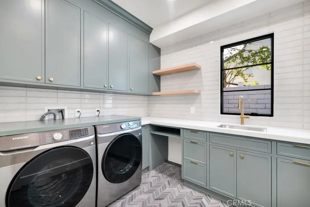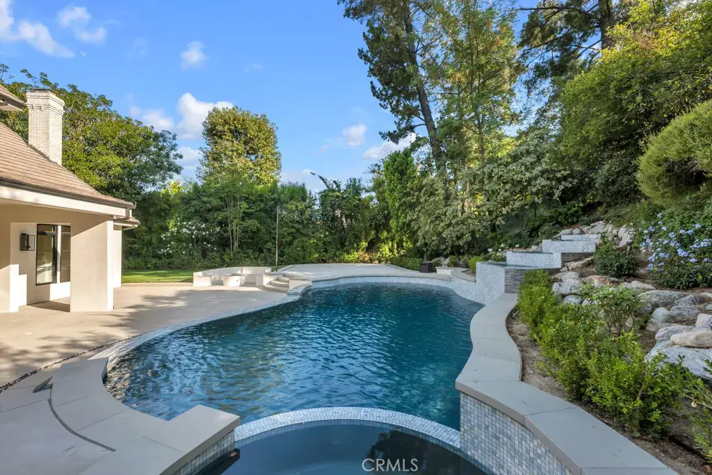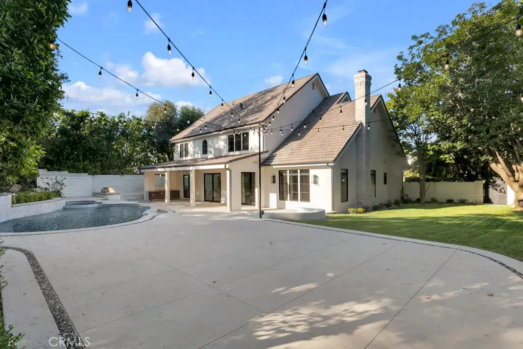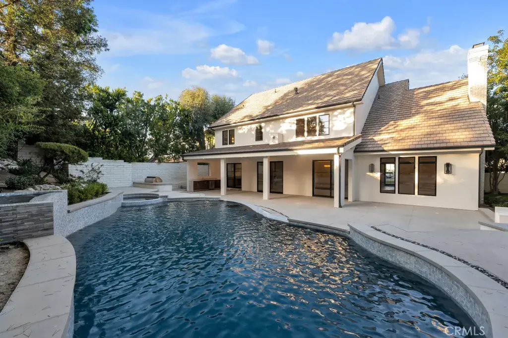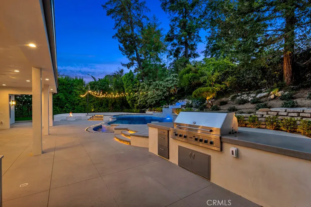 The private entertainer’s yard offers resort-style living with a sparkling pool and spa featuring waterfalls, a fully equipped BBQ island with ample seating, an outdoor kitchenette, and multiple lounging areas. Elaborate landscape lighting and a large grassy play area make this backyard a true oasis for family and friends.