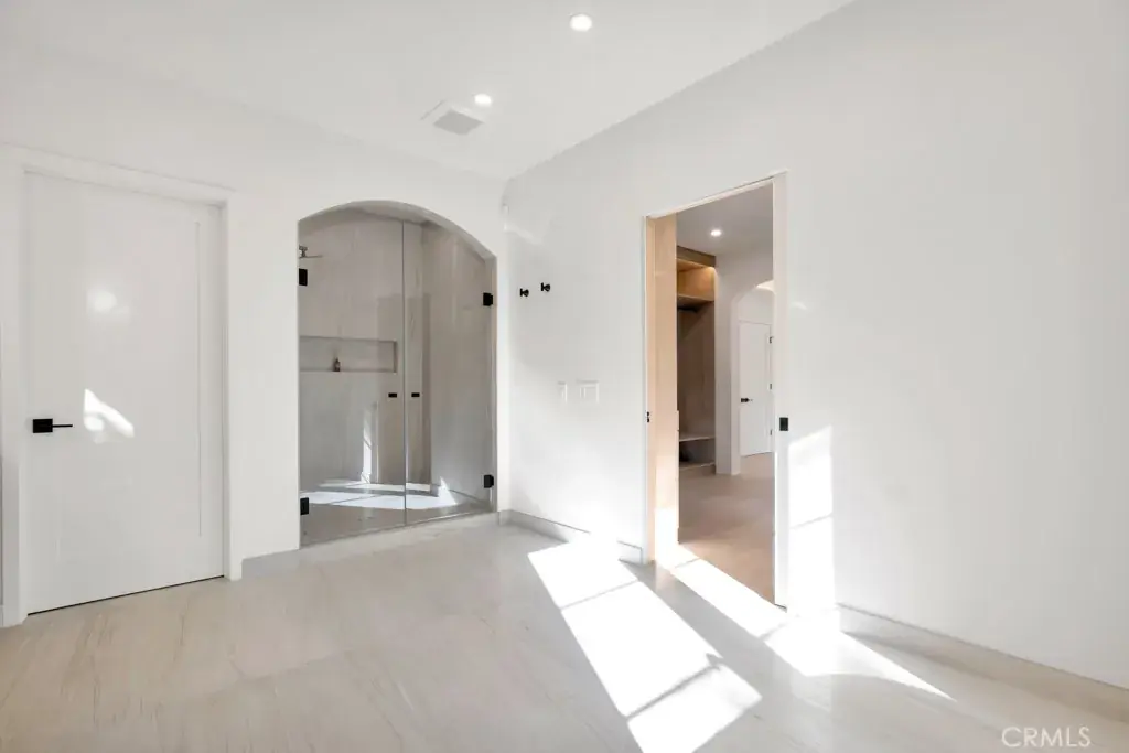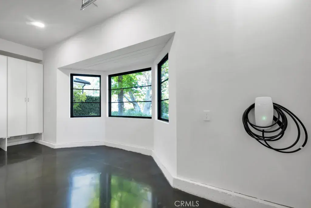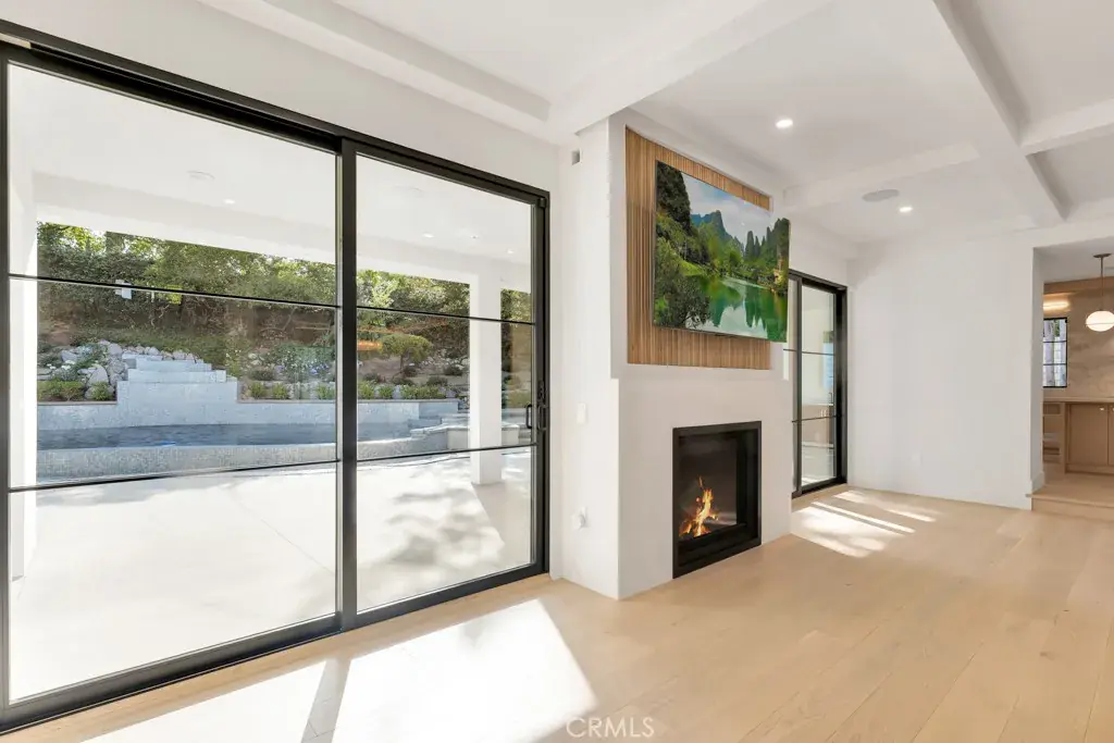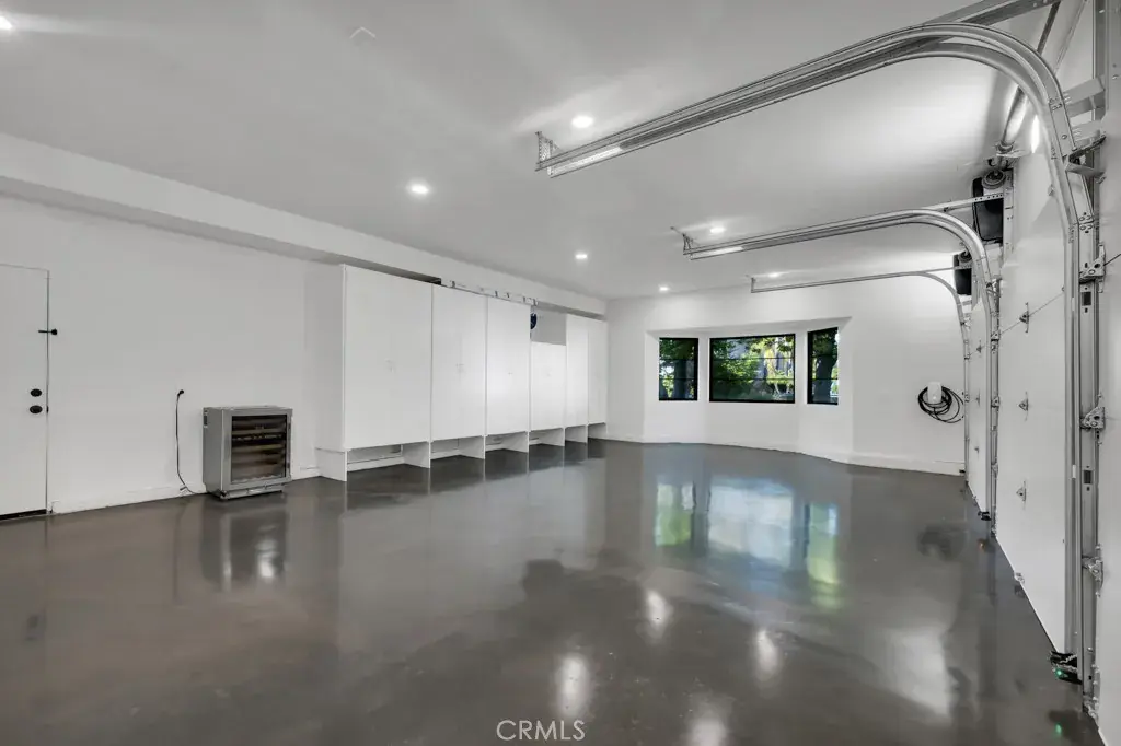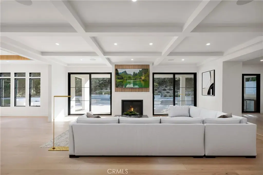 Additional highlights include white oak flooring, designer lighting, and an integrated smart-home system with security cameras, speakers, and a car charging port. An attached 3-car garage adds convenience and security.
