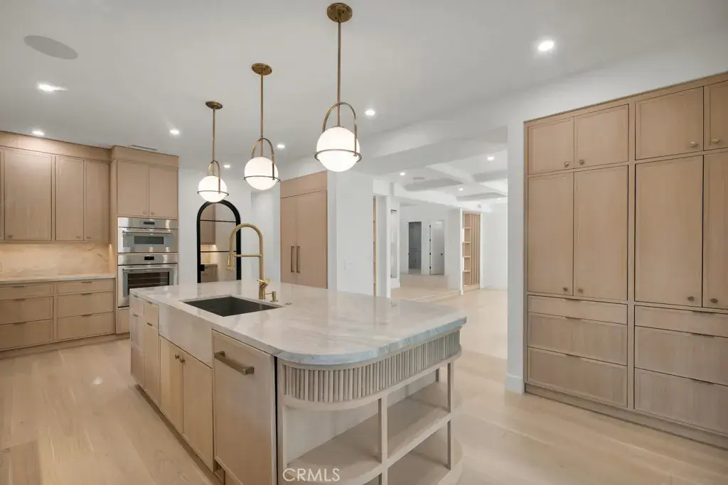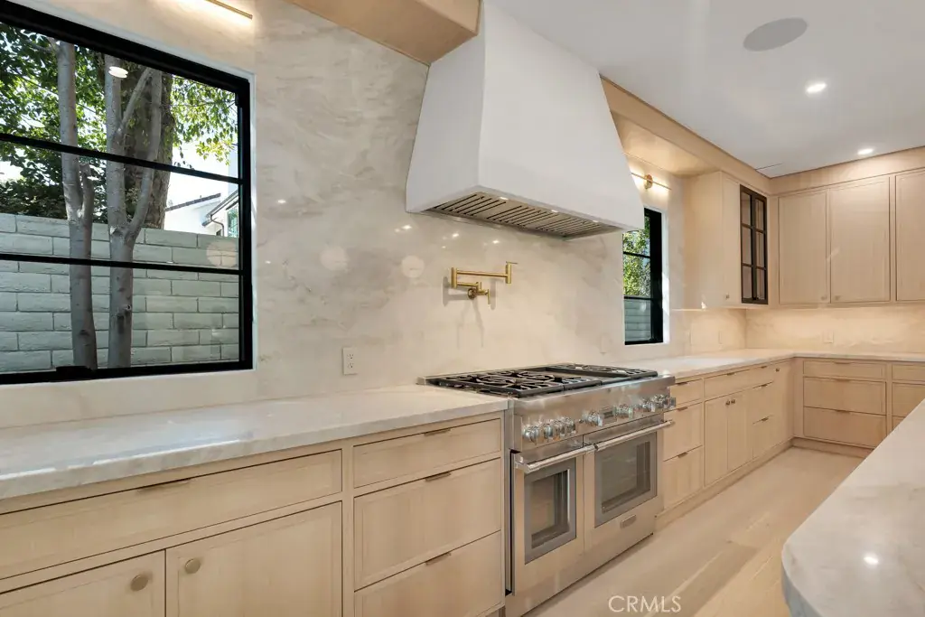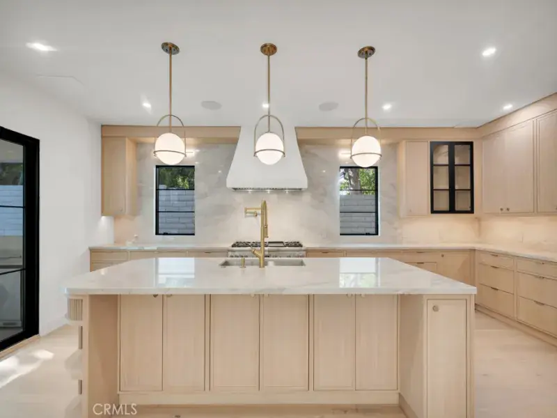 A grand two-story foyer makes a striking first impression, leading to expansive light-filled interiors. At the heart of the home, the gourmet kitchen showcases Taj Mahal quartzite countertops, custom cabinetry, and professional-grade appliances. The kitchen flows seamlessly into a family room with coffered ceilings, creating a warm and sophisticated gathering space. A separate formal living room and dining room with designer-detailed ceilings add to the home’s refined character and provide ideal settings for entertaining.