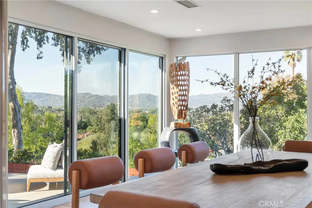 Set behind a 6-foot motorized privacy gate and approached by a long driveway, this single-level mid-century modern retreat offers sweeping views across the San Fernando Valley and a rare sense of seclusion. Thoughtfully taken down to the studs approximately ten years ago, the home was comprehensively reimagined with all major systems upgraded alongside refined, timeless finishes throughout. Upon entry, a dramatic sunken living room with fireplace sets the tone, seamlessly flowing into an open-concept layout designed for both everyday living and entertaining. Engineered white oak flooring runs throughout the home, complemented by aluminum-framed windows and sliding doors that frame the valley views and flood the interiors with natural light. The dining area is a true focal point, showcasing views of the northern valley and ideal for hosting memorable gatherings. A second sunken living space offers a cozy, elevated lounge—perfect for media, relaxing, or taking in the view from a different perspective. The chef’s kitchen features custom teak cabinetry, a Sub-Zero refrigerator, Wolf cooktop, oven, and microwave, generous storage, and bar seating—designed to function beautifully while anchoring the heart of the home. The residence offers four bedrooms and three-and-a-half bathrooms across a thoughtfully separated floor plan. One wing includes three bedrooms, highlighted by a spacious primary suite with walk-in closet and en-suite bath featuring a sunken soaking tub. The second-largest bedroom offers near-primary proportions with its own walk-in closet and shares a Jack-and-Jill bath with the third bedroom. The opposite wing provides a private fourth bedroom with authentic terrazzo flooring, an adjacent bathroom, and a dedicated laundry area—ideal for guests, extended family, or a home office. Outdoors, offers multiple entertaining areas, including a newer swimming pool, deck, and cabana area, as well as outdoor seating and dining with picturesque view settings. Centrally located near major freeways, fine dining, and premier shopping, this gated Tarzana residence delivers architectural integrity, privacy, and panoramic views in one exceptional offering.