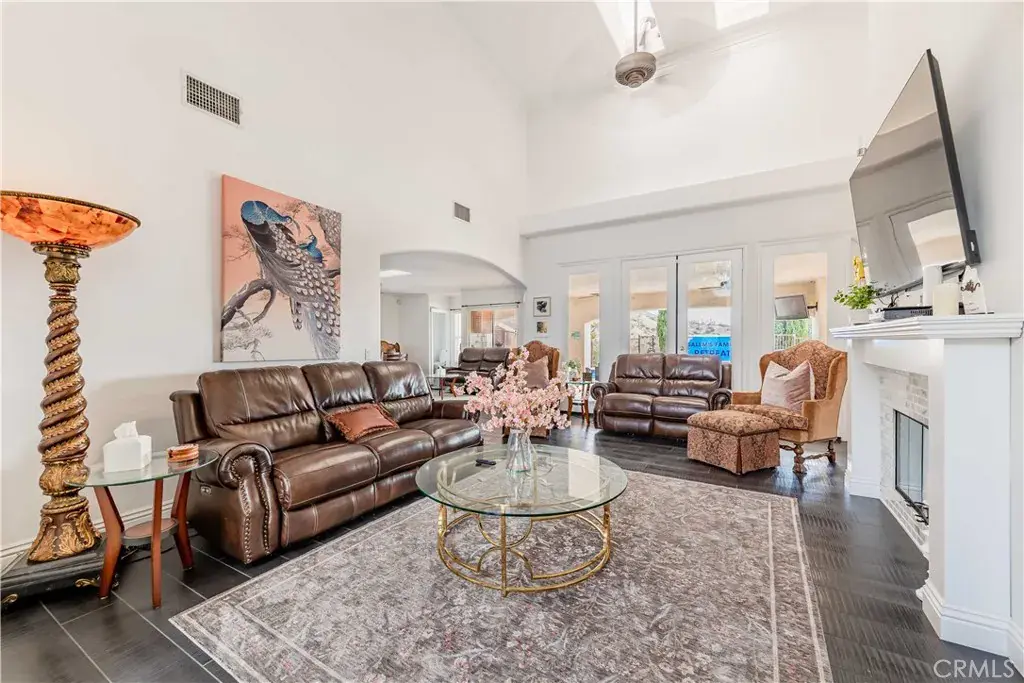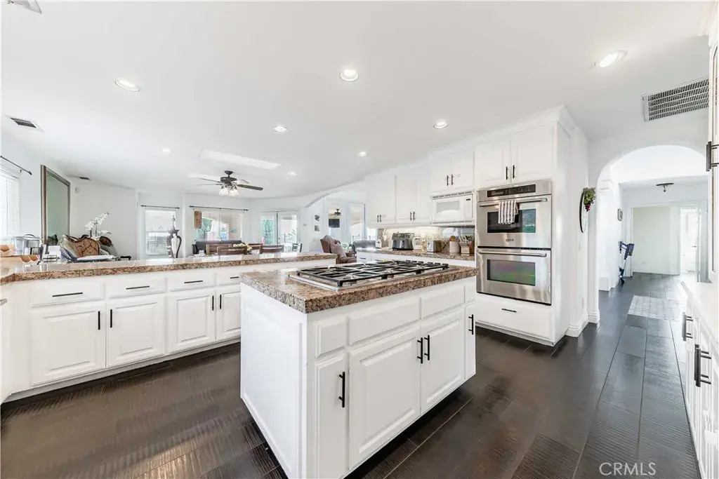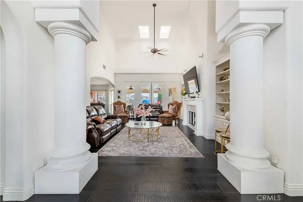 The home spans over 3,000 square feet of refined living space, beginning with a grand entry framed by soaring 20-foot ceilings and flooded with natural light. The great room showcases Italian-inspired architectural columns, custom built-ins, and an elegant fireplace that sets the tone for the rest of the residence. The gourmet kitchen is designed for both function and entertaining, featuring a large island with 6-burner cooktop, granite countertops, custom cabinetry, double convection ovens, abundant storage, and an effortless flow into the dining and family room areas. Living is easy on the main floor thanks to a spacious primary suite complete with dual walk-in closets, his-and-hers sinks, a vanity, oversized soaking tub, and a large walk-in shower. French doors open directly to the backyard, providing seamless access to the resort-style pool, heated spa, and covered outdoor entertaining area with wet bar and sink. The downstairs also includes a versatile 4th bedroom or office with French doors. Upstairs, two expansive bedroom suites each offer private balconies with sweeping vistas of the surrounding groves and hills. The grounds offer endless possibilities—gentle terrain ideal for vineyards, additional orchards, future guest house construction, or a sports court. A steel workshop/RV barn with electricity, oversized three-car garage, excellent security system, central vacuum, and extensive parking for 12+ vehicles round out this exceptional property. This is more than a home—it is a rare hilltop sanctuary blending luxury, privacy, natural beauty, and agricultural potential into one extraordinary offering.