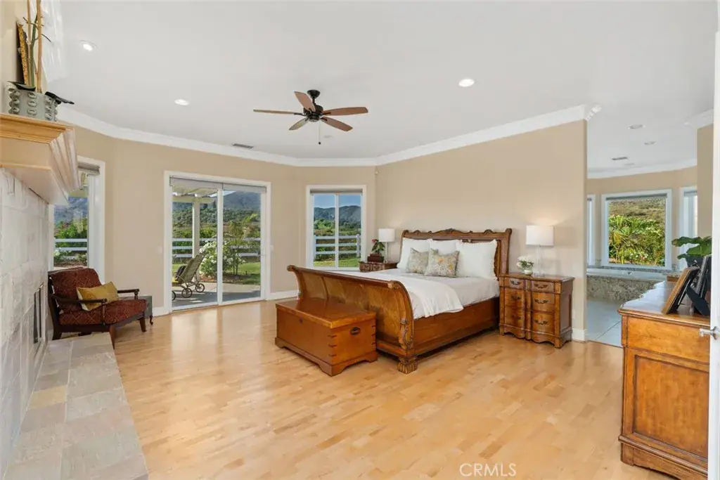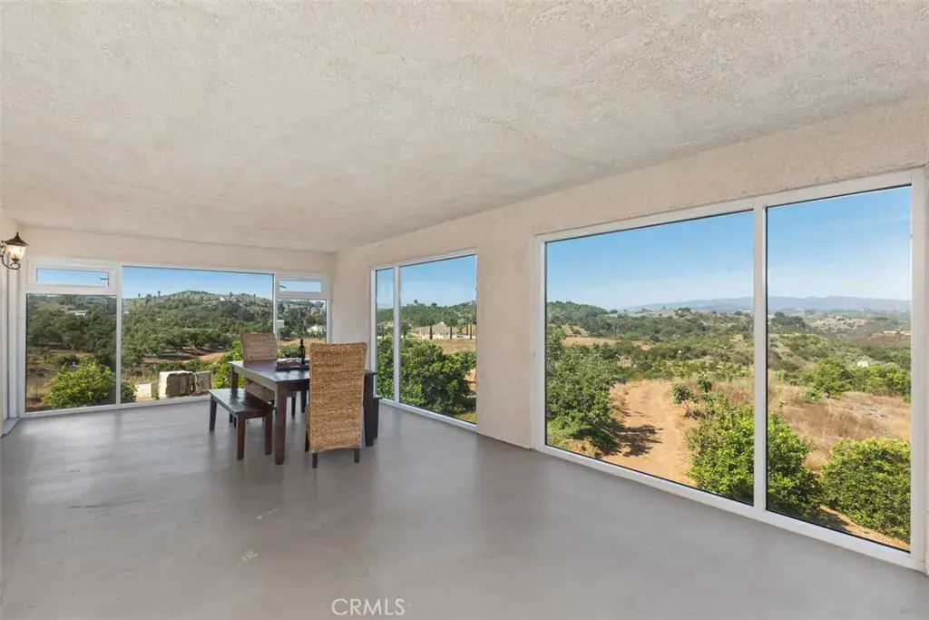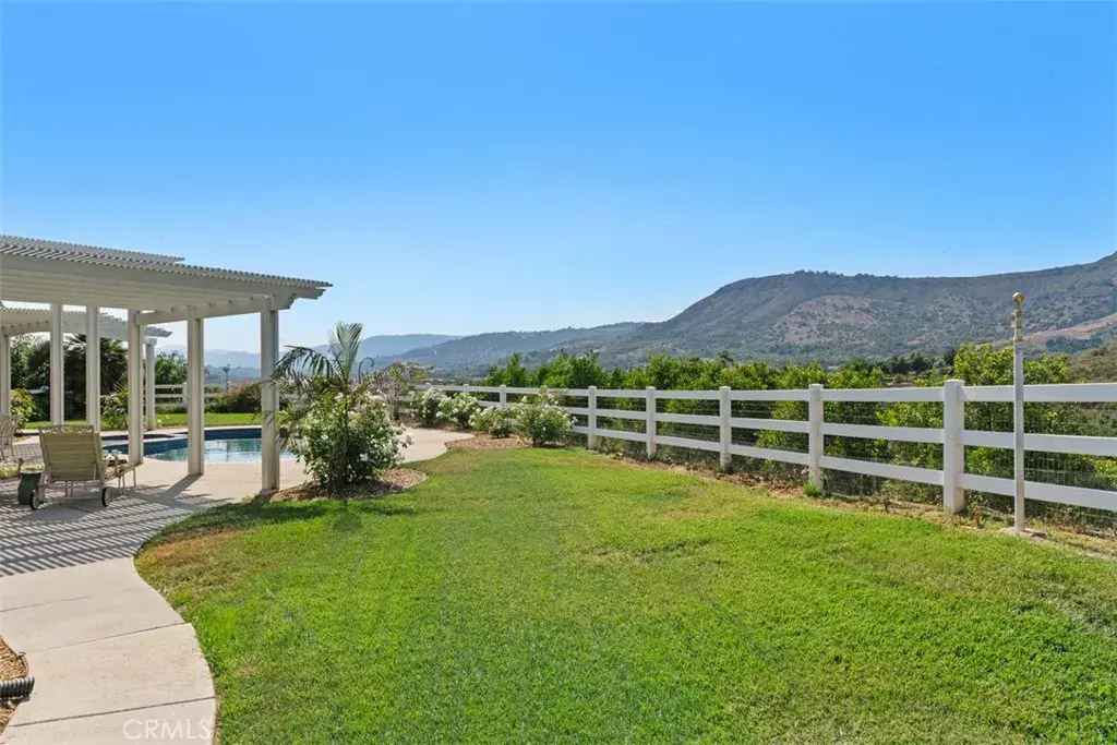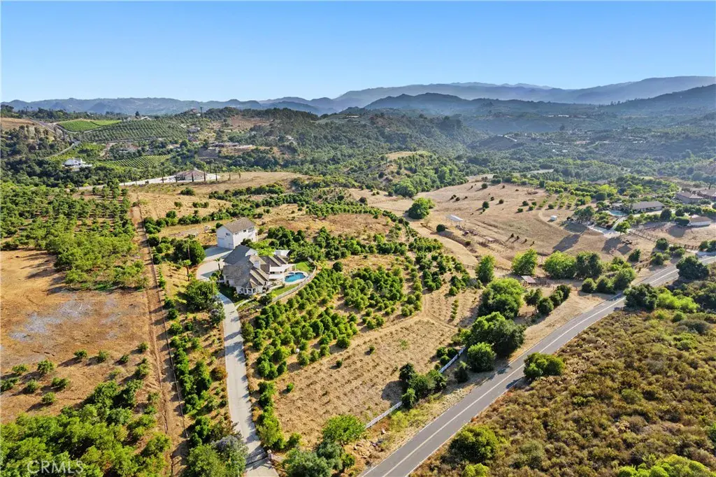 PRICE REDUCTION. This property is located on almost 10 acres in the desirable De Luz community with a 3963 sq.ft. main house plus a 1400 sq.ft. detached guest house. Both homes have amazing views and breathtaking sunsets including views of the local Cross Creek golf course. Other features include a swimming pool and spa, an organic avocado and citrus grove, family orchard, a huge RV garage and a great location with an easy drive to town. The custom built main home has 12ft. high ceilings in the entry with 10ft. ceilings throughout. Features throughout the main house includes wood flooring, custom quality crown molding,built in cabinets and was specifically designed to enjoy the views from almost every room providing lots of natural light throughout. The well designed kitchen includes a large island, granite countertops, newer appliances including double ovens and a sub zero refrigerator plus lots of cabinetry and storage and a walk in pantry. The comfortable family room features a custom built fireplace encased by built in cabinets on either side. The huge private master suite overlooks and opens to the landscaped fenced backyard and pool and spa area. There is a lovely separate formal living room and dining room plus an office with built in cabinets and book shelves. The 4th bedroom with an en suite bathroom is upstairs. Other features include a new water filtration system, newer AC units plus central vac system. The guest house was built in 2006. It features a living room, totally self contained kitchen, two bedrooms plus a full bathroom. It also has an outdoor enclosed living area with surrounding glass windows where you can enjoy amazing views and breathtaking sunsets.It has its own laundry facilities located downstairs in the 40×30 ft. RV garage that also has a workshop area and attic storage. The certified organic grove includes many newer trees including avocados, Kara Kara oranges, pink lemons, and pixi tangerines with almost 5 acres of land to plant a vineyard or add to the grove. Also enjoy a family orchard and vegetable garden including table grapes, lemons, berries, apples, peaches, plums, nectarines, pears, red and sweet onions and tomatoes. The property is completely fenced with a custom gate. A leased solar system for both homes. The main home has a 3 car garage plus there is lots of parking space. This property offers a great lifestyle and location close to the city of Temecula Old town and Wine Country to also enjoy.