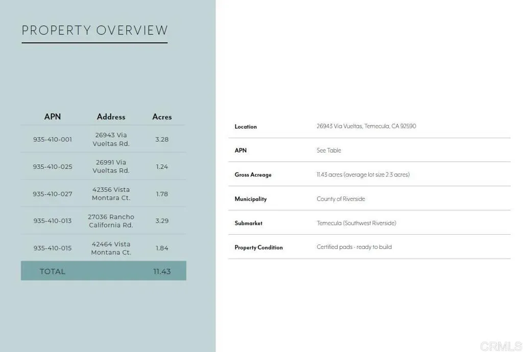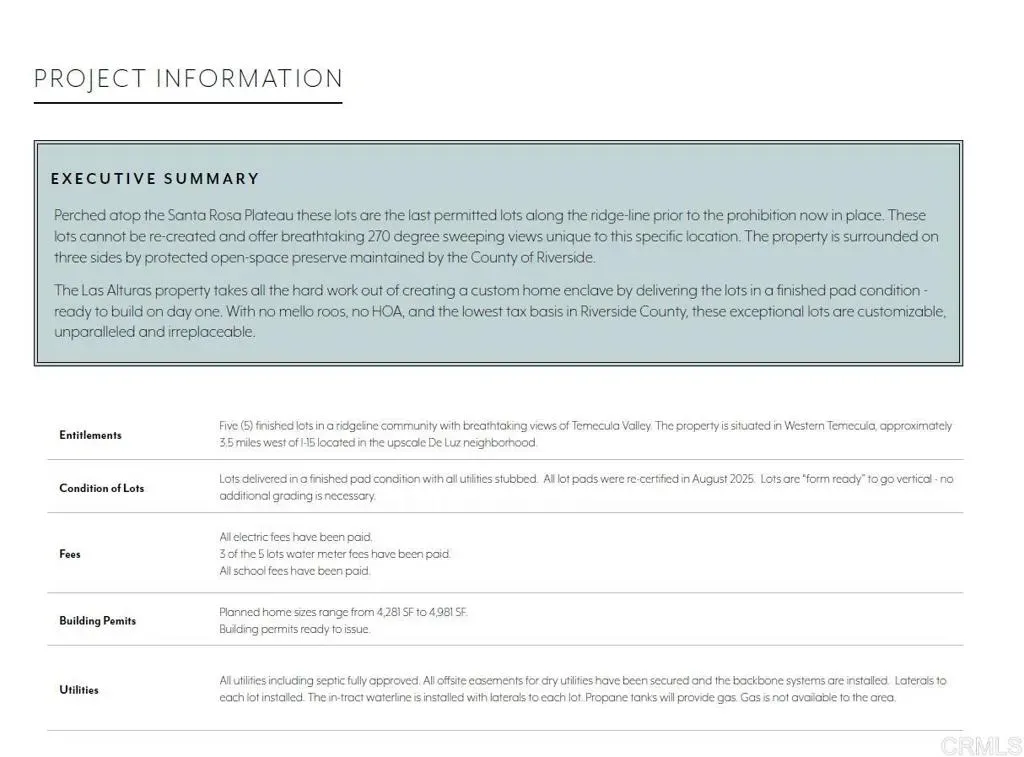 Five (5) finished lots in a ridgeline community with breathtaking views of Temecula Valley. The property is situated in Western Temecula, approximately 3.5 miles west of I-15 located in the upscale De Luz neighborhood. Perched atop the Santa Rosa Plateau these lots are the last permitted lots along the ridge-line prior to the prohibition now in place. These lots cannot be re-created and offer breathtaking 270 degree sweeping views unique to this specific location. The property is surrounded on three sides by protected open-space preserve maintained by the County of Riverside. The Las Alturas property takes all the hard work out of creating a custom home enclave by delivering the lots in a finished pad condition – ready to build on day one. With no mello roos, no HOA, and the lowest tax basis in Riverside County, these exceptional lots are customizable, unparalleled and irreplaceable. Lots delivered in a finished pad condition with all utilities stubbed. All lot pads were re-certified in August 2025. Lots are “form ready” to go vertical – no additional grading is necessary.